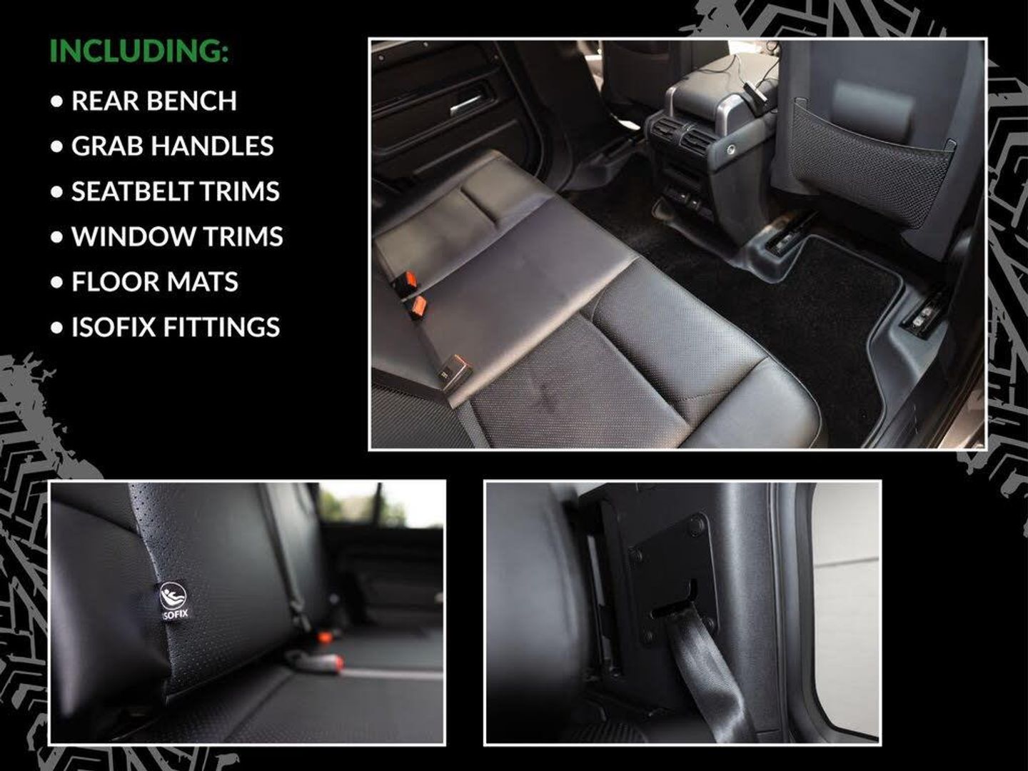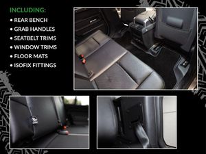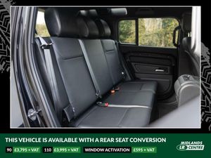 10in Touchscreen, 12-Way Heated - Electric Memory Front Seats with 2-Way Manual Headrests, 12V Socket in Loadspace, 20in Alloy Wheels - Style 5094 - 5 Spoke - Gloss Sparkle Silver, 20in Full Size Spare Wheel, 360 Degree Parking Aid, 3D Surround Camera, ABS - Anti-Lock Braking System, AHBA - Auto High Beam Assist, Additional Lashing Points, All Season Tyres, Alpine Lights, Android Auto, Apple CarPlay, Assisted Tailgate, Automatic Headlight Levelling, Automatic Headlights and Rain Sensing Wipers, Blind Spot Assist, Body Coloured Roof, Brake Hold, Brake Pad Wear Indicator, CBC - Cornering Brake Control, Cabin Lighting, Centre Console with Armrest, Centre High Mounted Stop Light, Clear Exit Monitor, Coil Suspension, Core Exterior Pack, Cross Car Beam in Light Grey Powder Coat Brushed Finish, Cruise Control and Speed Limiter, Customer Configurable Autolock, DSC - Dynamic Stability Control, Digital Audio Broadcast Radio - DAB, Driver Condition Monitor, Durable Loadspace Flooring, Durable Rubber Cabin Flooring, EBD - Electronic Brake-Force Distribution, EPAS - Electric Power Assisted Steering, ETC - Electronic Traction Control, Electric Parking Brake, Electric Windows with One-Touch Open-Close and Anti-Trap, Electrically Adjustable Steering Column, Emergency Braking, Exterior Signage Panel, Follow Me Home Lighting, Footwell Lights - Front, Front Airbags with Passenger Seat Occupant Detector, Front Fog Lights, Front Passenger Seat ISOFIX, Full Height Bulkhead behind Row 1 Seats, Glovebox Storage, HDC - Hill Descent Control, Headlining - Light Oyster Morzine, Heated Electric Power Fold Door Mirrors with Approach Lights and Auto-dimming Driver Side, Heated Rear Window with Timer, High-Sided Rubber Mats, Hill Launch Assist, Increased Intensity Loadspace lighting, Intrusion Sensor, Keyless Entry, LED Tail Lights, LESS Wireless Charger, Lane Keep Assist, Leather Gearshift, Loadspace Hooks, Loadspace Rubber Mats, Lockable Rear Underfloor Stowage, Lockable and Illuminated Forward Underfloor Storage, Locking Wheel Nuts, Low Traction Launch, Meridian Sound System, Non Smokers Pack, Online Pack with Data Plan, Overhead Stowage for Sunglasses, Pivi Pro - Connected, Power Operated Child Locks, Power Socket Pack, Premium LED Headlights with Signature DRL, Privacy Glass, Puddle Lights, Push Button Start, RSC - Roll Stability Control, Rear Fog Lights, Rear Traffic Monitor, Rear Wash Wiper, Remote, Seat Belt Reminder, Secure Tracker (12 Month Subscription From New), Side-Hinged Tailgate, Standard Roof, Standard Treadplates, Steering Wheel - Leather Wrapped with PU DAB, Sunvisors with Illuminated Vanity Mirrors, TPMS - Tyre Pressure Monitoring System, TSA - Trailer Stability Assist, Terrain Response, Traffic Sign Recognition and Adaptive Speed Limiter, Trip Computer, Twin Front Cupholders, Twin Speed Transfer Box - High-Low Range, Upgraded Loadspace LED Lighting, Wade Sensing, Windscreen - Heated, 12 Months RAC Warranty And Breakdown Cover, PANGEA GREEN METALLIC, BLACK LEATHER INTERIOR, ClearSight Interior Rear View Mirror, LESS Roof Rack or Rails, CLEAR SIGHT REAR VIEW MIRROR, REAR SPOILER, SIDE STEPS, 22'' 5 SPOKE ALLOY WHEELS PAINTED IN BLACK, MUD FLAPS, EXTERIOR LOWER GLOSS BLACK PACK, MERIDIAN SOUND SYSTEM, GLOSS BLACK WHEEL COVER, HEATED SEATS