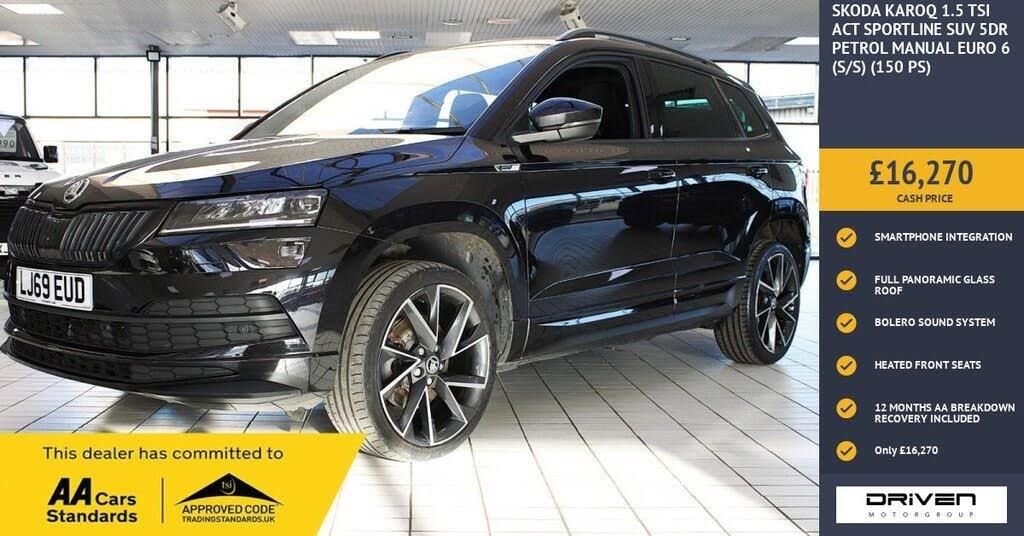 SKODA KAROQ 1.5 TSI ACT SPORTLINE 5DRFINISHED IN BLACK AND COMPLIMENTED WITH TWO TONE CHARCOAL INTERIOR, THIS VEHICLE HAS BEEN VERY WELL CARED FOR AND MAINTAINED PLUS COMPREHENSIVE PRE DELIVERY HEALTH CHECK COMPLETED PRIOR TO SALE 42290 MILES. KEY FEATURES INCLUDE ALLOY WHEELS, CLIMATE CONTROL, ALARM, AMUNDSEN SATALLITE NAVIGATION, INTEGRATED WIFI, BOLERO RADIO, CRUISE CONTROL WITH SPEED LIMITER, DAB RADIO, BLUETOOTH, ELECTRIC FOLDING HEATED DOOR MIRRORS, IMMOBILISER, AUTO HEADLIGHTS, HEATED FRONT SEATS, KEYLESS ENTRY, FRONT AND REAR PARKING SENSORS, PANORAMIC GLASS SUNROOF, SMARTPHONE INTEGRATION, PRIVACY GLASS PLUS MUCH MORE. COMMITTED TO AA CARS STANDARDS: 3 MONTHS OR 3000 MILES WARRANTY INCLUDED WITH AN OPTION TO UPGRADE: 12 MONTHS AA BREAKDOWN RECOVERY INCLUDED: £75.00 CONTRIBUTION TOWARDS YOUR NEXT SERVICE/MOT AT ANY AA CARS STANDARD APPROVED WORKSHOP: WE STAND BY THE QUALITY OF OUR VEHICLES. WITH THE PURCHASE OF THIS VEHICLE, YOU WILL RECEIVE 3 MONTHS OR 3000 WARRANTY, 12 MONTHS AA BREAKDOWN RECOVERY, GIVING YOU ADDITIONAL PEACE OF MIND AND PROTECTION. ALL OUR CARS COME WITH AT LEAST 6 MONTHS MOT AND PRE SALE HEALTH CHECK AND ROAD TEST. OUR PROFESSIONAL TEAM ENSURES YOUR VEHICLE STAYS IN TOP CONDITION, AND YOU ENJOY A HASSLE-FREE OWNERSHIP EXPERIENCE. 4.6 STARS ON GOOGLE WITH OVER 550 REVIEWS: JOIN OUR COMMUNITY OF SATISFIED CUSTOMERS! OUR DEALERSHIP IS PROUD TO HAVE A 4.6 STAR RATING ON GOOGLE, BACKED BY OVER 550 POSITIVE REVIEWS. WE ARE COMMITTED TO PROVIDING EXCELLENT SERVICE AND HIGH-QUALITY VEHICLES. This Vehicle Comes Equipped with High Specification, Which Includes: - Drive this car home with complete confidence and satisfaction: All cars proudly offered by driven group are rigorously inspected, hpi checked and prepared to the highest standard To drive this car home, visit www.drivegroup.co.uk or call 01642-601999 to arrange an appointment with our sales team Please note we do not operate an organised distance selling scheme as defined by the consumer contracts (cancellation, information and additional charges) regulations 2013. Therefore, even if you choose to not view your vehicle at our premises prior to purchase,you will not be entitled to cancel your order under any 14 day cancellation period. All other statutory rights remain unaffected. Whilst every effort has been made to ensure the accuracy of the information contained in this website, please check with us about any item which may affect your decision to purchase. Driven motor group shall not be liable for any errors, inaccuracies or delays in content.