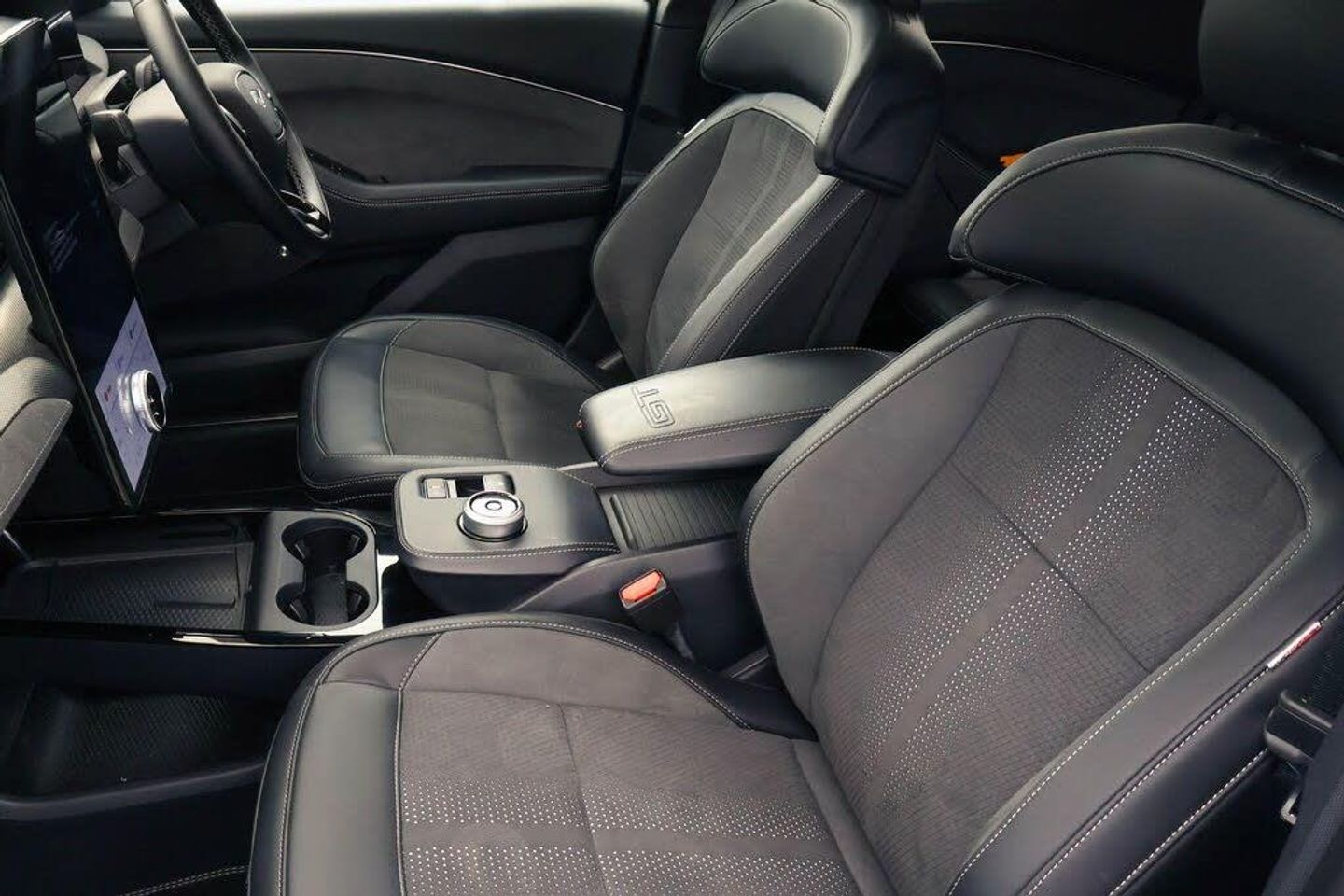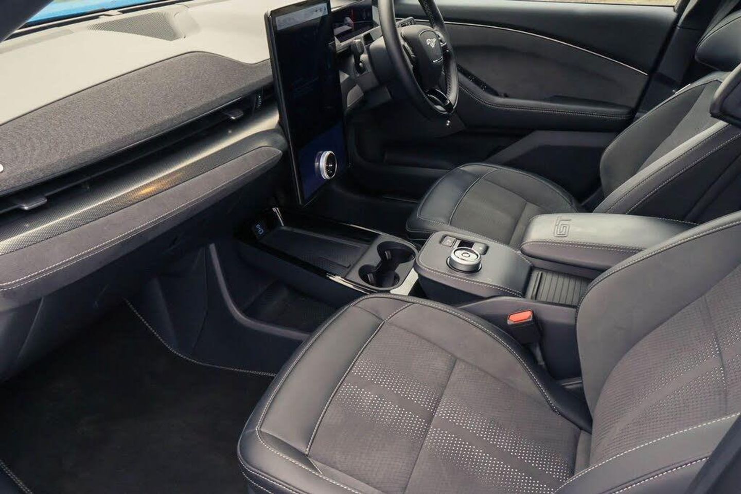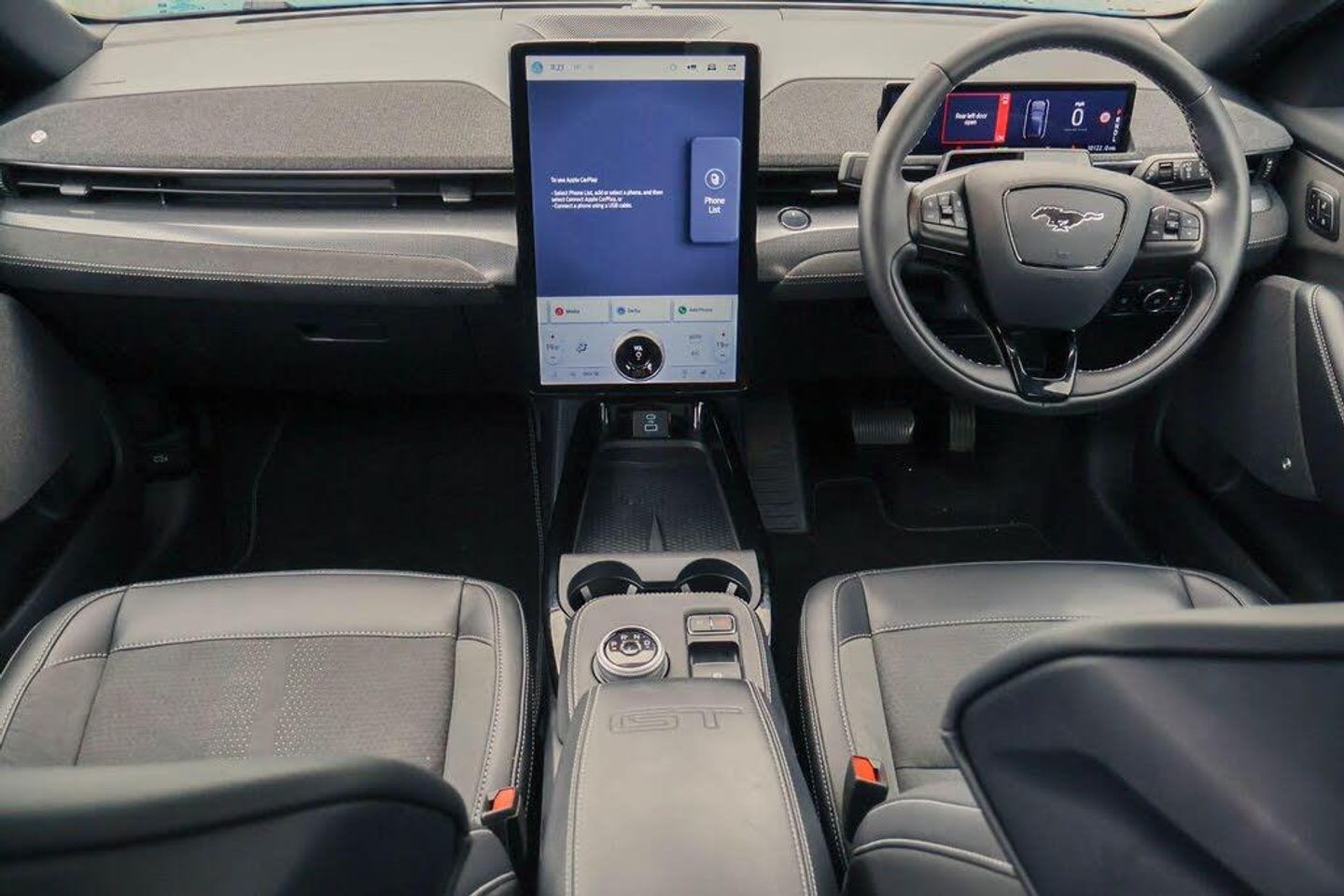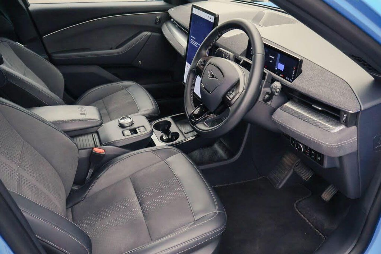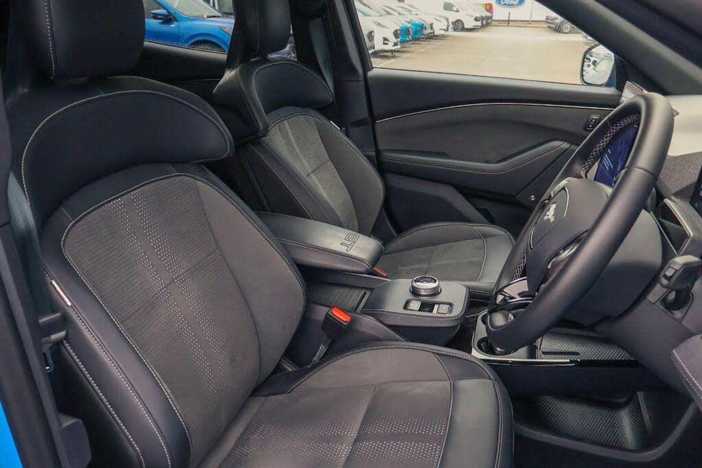 10.2" digital insturment cluster, 360 degree camera, Applink remote control system, BLIS (Blind Spot Information System) with cross traffic alert, Distance alert and indication system, Electric power steering, Emergency services call system, Ford SYNC4A with 15.5"Touch, DAB radio, Emer assist, Wireless carplay androidauto, 2 front, rear USB ports, FordPass connect, Connected naviation, Front and rear parking sensors, Hands free tailgate, Intelligent adaptive cruise control with stop and go + lane centering, Lane departure warning with lane keeping aid, Selectable drive modes - active, whisper and untamed, Trip computer, Wireless charging pad, B and O premium sound system 10 speaker including dashboard sound bar, Adaptive LED Mustang signature headllamps, Black door cladding, Black painted power fold heated mirrors with puddle light mustang logo projection, Black roof, Body colour bumpers, Daytime running lights, Fixed full panoramic roof, GT scuff plates, LED 3rd brake light, LED Mustang signature tail lights, Quickclear heated windscreen, Rear privacy glass, Rear side wing doors, Rear wiper, Side cladding and wheel arches in body colour, Unique GT bumpers, Unique GT front grille design, 3 seat bench in 2nd row, 8 way power ford performance driver seats with lumbar support, 8 way power ford performance passenger seats with lumbar support, Ambient lighting, Dual electronic automatic temperature control, Ford performance sensico cloth upholstery, Front headrests, Front trunk, GT performance seats, Heated driver and front passenger seats, Heated front seats and steering wheel, One pedal drive, Rear head restraints, Single front passenger seat, E-Latch keyless entry system including B-Pillar keypad access, Keyless Start, Thatcham Cat.1 alarm, Perforated Sensico - Black with Red Stitching