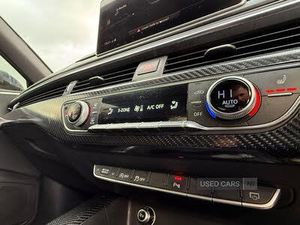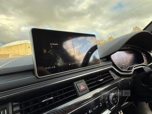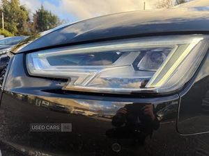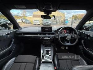 Audi drive select, Audi Pre sense collision avoidance, Audi smartphone interface, Auto boot lid opening, Electro-mechanical PAS, Service interval indicator, Stop/start button, Voice control system, 2 USB ports, Aux input, DAB digital radio module, MMI radio plus with CD player, Acoustic windscreen, Air inlets in titan black with two horizontal inlays in chrome, Auto dimming rear view mirror, Automatic headlights + automatic windscreen wipers, Body colour bumpers, Chrome door handles, Chrome rolled exhaust, Electric adjustable heated door mirrors, Electric front windows, Electric rear windows, Headlight range control, LED daytime running lights, LED indicators in door mirrors, Rear diffuser in Twilight grey matt, Roof spoiler, 3 zone climate control, Black cloth headlining, Front centre armrest with 12v socket, Front sport seats, Front/rear floor mats, Gearshift paddles, Illuminated door sill finishers, Isofix child seat preparation for front passenger/outer rear seats inc passenger airbag deactivation, Jack and tool kit, Perforated leather gearknob, Reach + rake adjustable steering column, Rear headrests, Split folding rear seats, Stainless steel foot rest, Stainless steel pedals, Sunvisors with vanity mirrors, Top tether anchor plate for isofix child seat, S line exterior styling pack - A4 Saloon, 3 point rear seatbelts x3, ABS/EBD, Adaptive driver and front passenger airbags, Electromechanical parking brake, ESP, First aid kit, Front head airbags, Front seatbelt pretensioners + load limiters, Front side airbags, Multi-Collision braking, Seatbelt warning, Traction control, Tyre pressure monitoring system, Warning triangle, Keyless Start, Locking wheel bolts, Remote central locking, Thatcham category 1 alarm + immobiliser