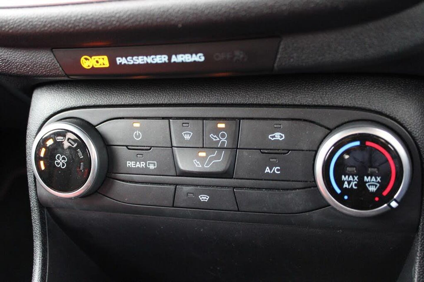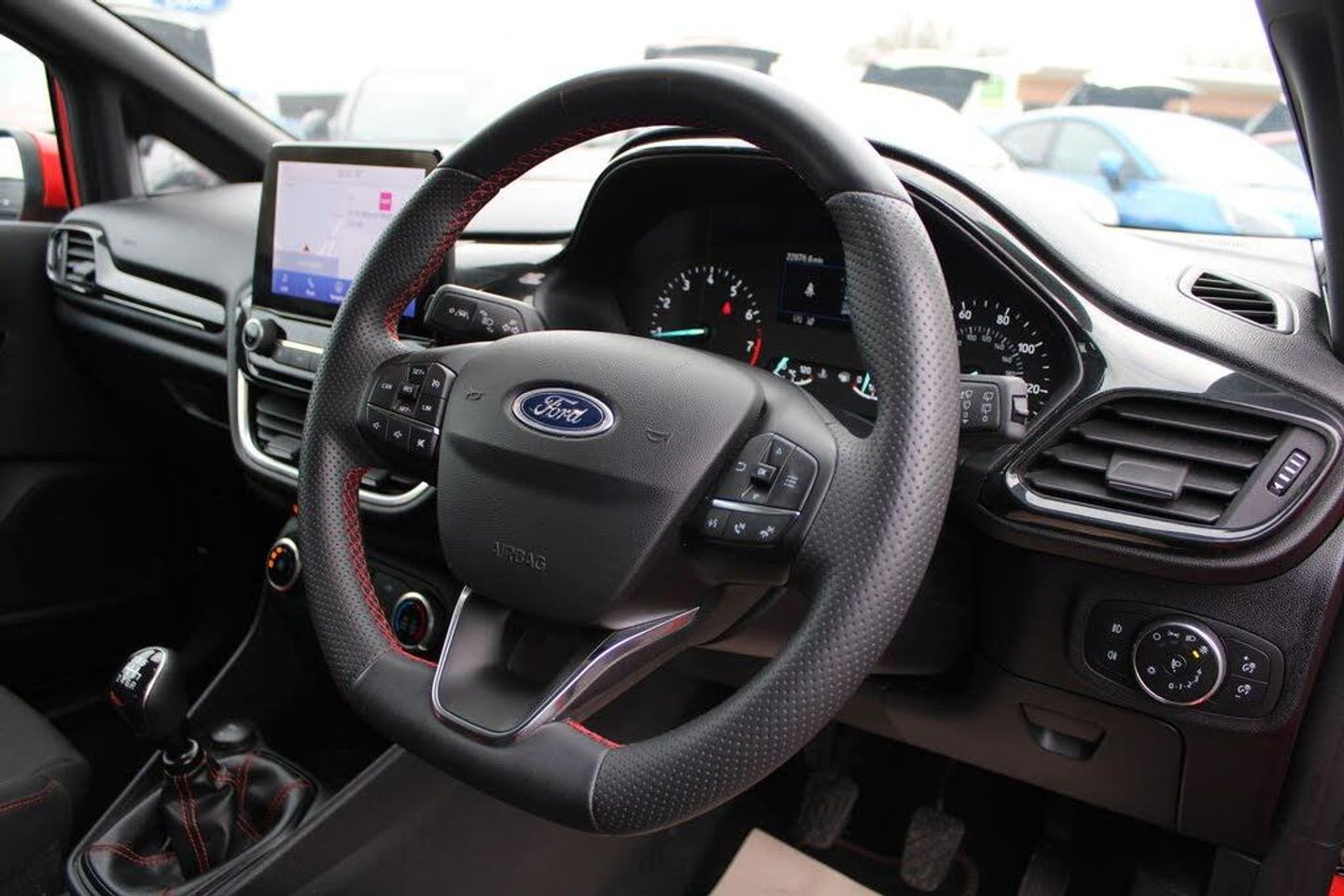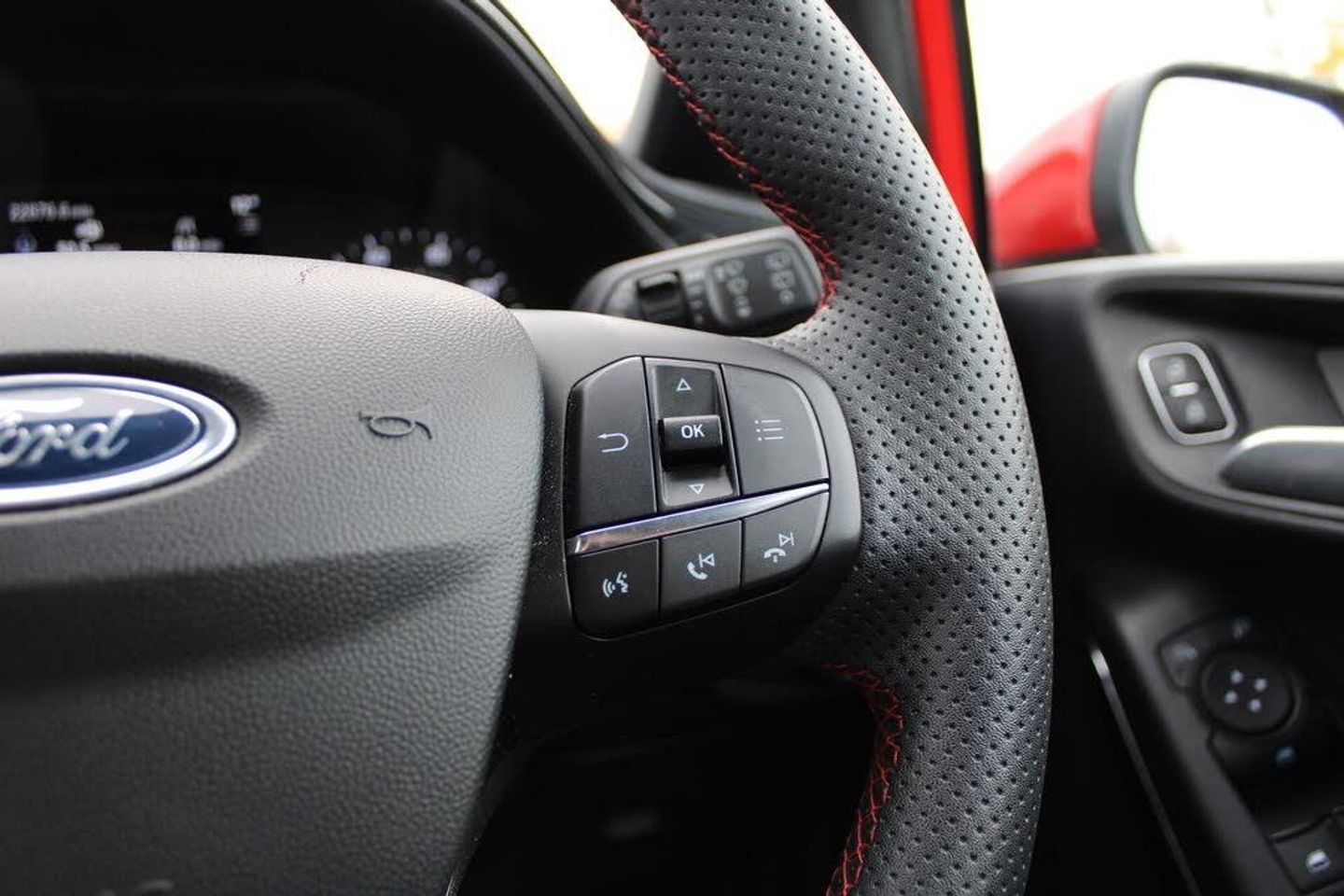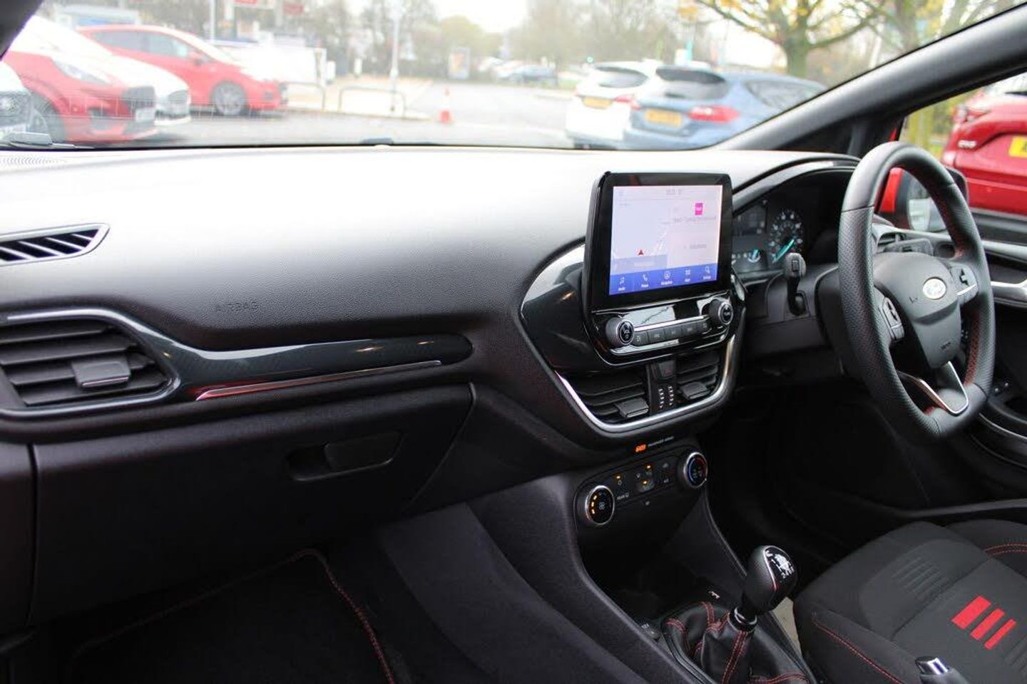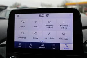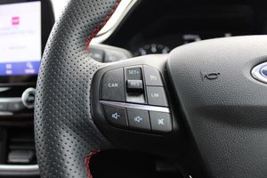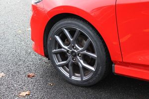 4.2" Colour TFT Ice blue illumination analogue cluster, Driver alert system, Electric power steering, Ford easy fuel, Lane keep assist, Lane keeping aid, Rear parking distance sensors, Selectable drive modes (Normal, Sport, Track), Trip computer, 3rd brake light, Auto high beam, Automatic headlights, Body colour bumpers, Body colour large rear spoiler, Body coloured electrically operated with side indicators, Electric front windows/one touch facility, Electric rear windows, Quickclear heated windscreen, Rain sensing wipers and auto dimming rear view mirror, Rear privacy glass, Rear side wing doors, Rear wiper, Unique ST-Line grille, full bodystyling kit and large body coloured rear spoiler, 3 rear headrests, 3 seat bench in 2nd row, Adjustable head restraints, Black headlining, Centre console with opening armrest, 2x cupholders, 12v and USB, Cloth upholstery with red stitching, Leather gear knob, Manual 2 way passenger seat adjust, Manual 4-way driver seat adjust, Manual air conditioning, Premium floor mats, Sensico wrapped steering wheel, Single front passenger seat, Keyless start with 'Ford Power' starter button, MyKey system, Remote central locking, Thatcham alarm with power door dead locks, SYNC 3 with Navigation, Mini Spare Steel Wheel