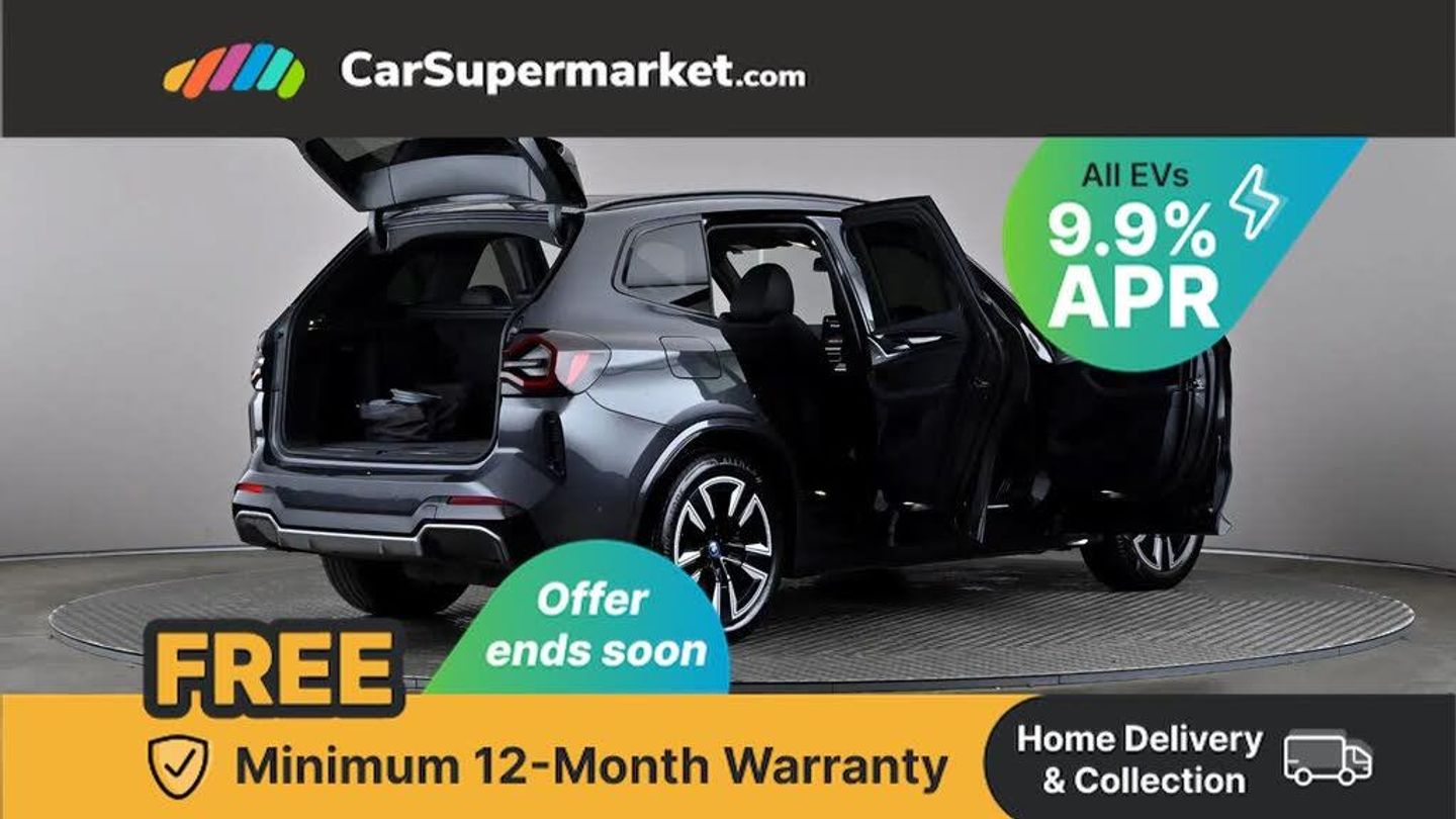 Active guard plus incl speed limit assist, lane departure warning with steering impulse and front collision warning with brake intervention,Apple car play and Android auto,Attentiveness assist,Automatic tailgate operation with remote opening and closing by key, opening distance adjustable with iDrive controller,BMW iDrive,BMW Live Cockpit Professional with 12.3" instrument display + 12.3" high resolution centre display nav function and Intelligent Voice Assistant,BMW Online services,BMW Teleservices,Brake pad wear indicator,Check control system,Condition based service - BMW service history, electronic service booklet, integrated owner's handbook,ConnectedDrive Services,Cruise control with brake function + speed limiter,Driving experience switch,Enhanced bluetooth with wireless charging,Front/rear Parking distance control,Language version English,Lateral parking aid,Parking assistant,PAS,Personal Profile,Reversing assistant,Reversing camera,Run flat indicator,Servotronic system,Start/stop button in blue,Wi-Fi hotspot,Widescreen display,Double joint spring strut front axle,eDrive exterior sound,Gear selector switch with toggle operation,Mode 2 flexible charger,Mode 3 charging cable 22kW,Multiple control arm rear axle,Safety battery terminal clamp,2x USB sockets in front,DAB radio,Stereo speaker system with 6 speakers,Air breathers with BMW i logo,Automatic headlights,Blue ring around BMW logos,BMW i badge on the kidney grille,BMW Individual high gloss shadow line with extended contents,Body colour door handles,Body coloured bumpers,Chrome kidney frame,Dynamic brake lights,Electric windows with trap release and convenient opening/closing feature,Exterior mirror housing finished in body colour,Exterior mirrors electrically adjustable, foldable, heated with memory, auto-dimming drivers side and aspherical on passengers side,Follow me home headlight function,Front and rear bumper system with replaceable deformation elements,Full LED rear lights,Green tinted heat protection glazing glass,Headlight beam throw control,Heated washer jets,High beam assistant,High gloss black shadow line roof rails,High gloss shadowline exterior trim,Integrated direction indicators,LED third brake light,M aerodynamic exterior,M badging on the front side (left and right),M design rear apron with high-gloss black inlays with Frozen grey trim panel,M Sport entry door sill strips,M Sport front bumper with iX3 specific design with blue contents,Metallic paint,Mirror base in black matt,Model logo on left tailgate,Model specific design elements - Frozen grey decorative elements and pearl chrome decorative strip,Panoramic glass sunroof, two parts, electric actuation, sliding function, wind deflector, sun protection with floating headliner,Rain sensor and automatic driving lights control,Rear diffuser in Blue,Rear side wing doors,Rear wiper,Reversing light,Sun protection glass,Visible VIN plate,Welcome lighting,12V power socket in front centre console,2 cupholders in front centre console,3 zone automatic air conditioning,40:20:40 split folding 3 bench rear seats in 2nd row,6 pre-defined selectable light designs in various colours with contour and ambient lighting,Ambient centre stack lighting,Ambient instrument panel lighting,Ambient light design projected onto the left and right entering and exiting area,Anthracite headlining,Blue accent around the logo on the steering wheel,Centre console storage tray,Contour lighting front and rear door trim panel,Driver and front passenger heated seats,Driver seat backrest width adjustment,Driver/passenger sunvisors with ticket holders + vanity mirrors,Front and rear ambient footwell lighting,Front and rear door pockets with bottle holders,Front and rear headrests,Front armrest integrated in door trim with centre console includes storage compartment,Front Sports electric seats with Driver's side electric backrest width adjustment and memory,Glove compartment,Heated steering wheel,Height and length steering column adjustment,Isofix rear child seat preparation,Lashing eyelets in luggage compartment,LED ambient lighting,Luggage compartment lighting,Luggage net,M sport leather steering wheel,Multifunctional sport seats for driver and front passenger,Presetting of ambient lighting in BMW iblue,Rear centre armrest with 2 cupholders,Seat backrest adjustment for rear seat,Single front passenger seat,Vernasca leather upholstery,Connected pro pack - iX3,Driving assistant professional package - iX3,Extended storage pack - iX3,Interior and exterior mirror pack - iX3,Non-smoker package,ABS/EBD,Active protection,Airbags - driver and front passenger,BMW emergency call,Brake energy regeneration,Child proof locking system in rear door,Cornering brake control (CBC),Crash sensor - Activation of airbags, hazard warning lights, battery safety cut-off and interior lighting + deactivation of fuel pump,Driver and passenger side airbags,DSTC-Dynamic Stability and Traction Control,Electromechanical parking brake