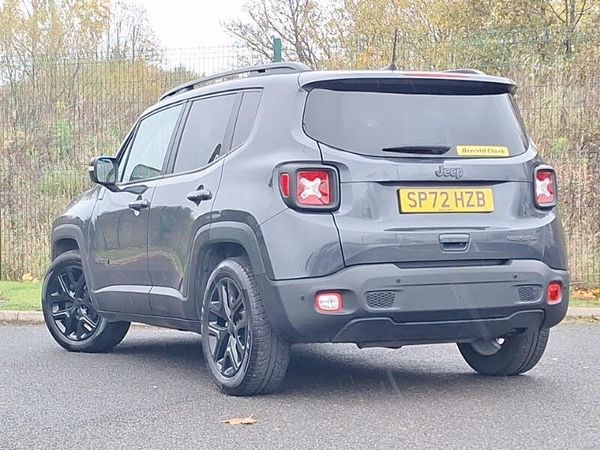 Apple car play/Android Auto, Cruise control, Electric servo assisted steering, Lane departure warning plus, Rear parking sensor, Speed limiter push button on steering wheel, Stop/start system, Battery run down protection, Electronic roll mitigation, High efficiency alternator, Smart alternator, 6 speakers, 2nd row fully functional USB port, Steering wheel control with bluetooth, Media hub with USB and aux input, DAB digital audio broadcast, Active shutter grille, 3rd brake light, Matt black carrier, Dual zone automatic air conditioning, Cloth upholstery, Aero pack - Renegade, ABS, All speed traction control, Dual note electric horns, Dual tyre pressure, Electronic parking brake, Electronic stability control with hill start assist, Tyre pressure monitoring display, Panic brake assist, Immobiliser, Safe lock (super blocking), Deadlock, 18" Night Eagle black alloy wheels, Tyres default