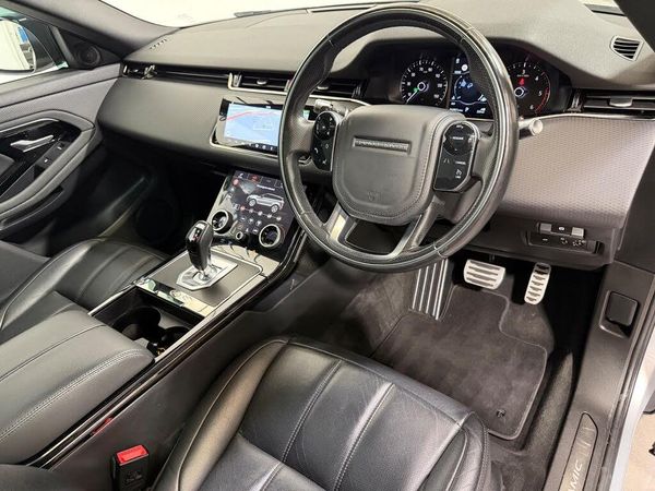 10-Way Heated Electric Front Seats, 10in Touch Pro, 18in Alloy Wheels - 5-Split Spoke - Style 5074 - Gloss Sparkle Silver, 40-20-40 Split Fold Rear Seat, ABS - Anti Lock Braking System, ATPC - All Terrain Progress Control, Airbags - Driver Knee, Airbags - Front - Driver and Front Passenger, All Season Tyres, Analogue Dials with Central TFT Display, Android Auto, Apple CarPlay, Auto-Dimming - Power Fold - Heated Door Mirrors with Approach Lights, Auto-Dimming Interior Rear View Mirror, Autonomous Emergency Braking, Black Gearshift Paddles, Bluetooth Connectivity, Body Coloured Roof, Brake Pad Wear Indicator, Bright Metal Pedals, Carpet Mats, Chrome Treadplates, Climate Control - Rear Vents, Cruise Control and Speed Limiter, Customer Configurable Autolock, D150 Badge, DAB - Digital Audio Broadcast, DSC - Dynamic Stability Control, Driver Condition Monitor, EBA - Emergency Brake Assist, EBD - Electronic Brake-Force Distribution, EPAS - Electronic Power Assisted Steering, ETC - Electronic Traction Control, Efficient Driveline, Electric Parking Brake, Electric Windows with One-Touch Open-Close and Anti-Trap, Evoque and R-Dynamic Badge, Flush Deployable Door Handles, Front and Rear Parking Aid, HDC - Hill Descent Control, Headlining - Ebony Morzine, Heated Rear Window with Timer, Hill Launch Assist, InControl - Remote App, InControl Apps, Interior Lighting, Intrusion Sensor, LED Headlights, Lane Keep Assist, Locking Wheel Nuts, Low Traction Launch, Manual Headlight Levelling, Manual Tailgate, Manually Adjustable Steering Column, Navigation Pro, Overhead Lighting Console, Overhead Stowage for Sunglasses, Passive Front Headrests, Passive Suspension, Perforated Leather Steering Wheel, Power Operated Child Locks, Power Socket Pack 1, Pro Services and Wi-Fi Hotspot, Push Button Start, R-Dynamic Exterior Pack, RSC - Roll Stability Control, Rain Sensing Windscreen Wipers and Automatic Headlights - Automatic, Rear Fog Lights, Rear ISOFIX, Rear View Camera, S Badge, Seat Belt Reminder, Seats - Rear Centre Head Restraint, Shadow Atlas - RANGE ROVER - Bonnet and Tailgate Script, Side Curtain Airbags and Thorax, Smart Settings, Sound System, Sun Visors - Illuminated Vanity Mirrors, TPMS - Tyre Pressure Monitoring System, Tailgate Spoiler, Terrain Response 2, Torque Vectoring, Traffic Sign Recognition and Adaptive Speed Limiter, Trim Finish - Gradated Linear Dark Aluminium, Twin Front Cupholders with Cover, Twin Sliding Front Centre Armrest, Two-Zone Climate Control, Tyre Repair System, Voice Control, Windscreen - Heated, Windscreen Washer Jets - Heated, Meridian Sound System 380W, Drive Pack, Wade Sensing, 20in Alloy Wheels - 5 Split-Spoke - Style 5079 - Gloss Black, Privacy Glass, Fixed Panoramic Roof Including Powered Blind, Solar Attenuating Windscreen, Activity Key, Air Quality Sensor, Premium Carpet Mats, Front Fog Lights, Black Contrast Roof