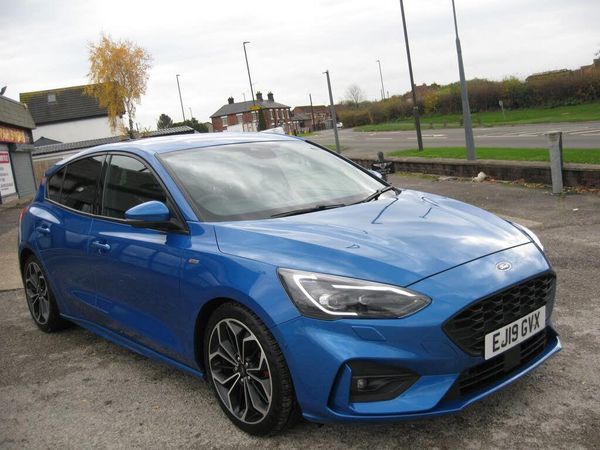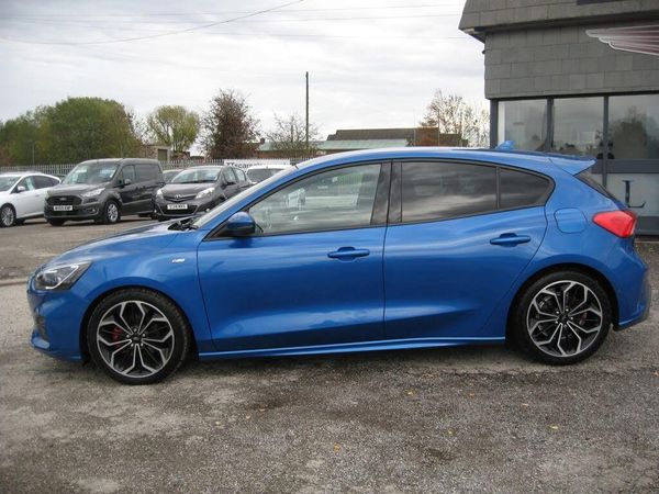 ZERO DEPOSIT FINANCE AVAILABLE SUBJECT TO STATUS. FINANCE AVAILABLE AND ARRANGED, FREE WARRANTY, PART EXCHANGE WELCOME. Ford Focus ST-LINE X 1.5 DCi AUTOMATIC with 7 SERVICES TO 49480 MILES, MOT 02-08-2026, 2 KEYS, STOP/START EURO 6 MODEL, Finished in metallic blue with colour coded ST-LINE body kit, front and rear park sensors, 18 alloy wheels, twin exhaust tailpipes, tinted rear windows, daytime running lights, front fog lights, black cloth with leather trimmed sides with red piping interior, electric driver seat adjuster, heated front seats, quick clear windscreen, monitor display with sat nav, reverse camera, DAB radio, voice command blue tooth connectivity, Apple Car Play and Android Auto via usb connection, adaptive cruise control with speed limiter, dual zone climate control, air conditioning, front and rear electric windows, electric retractable door mirrors, heated flat bottom multi function steering wheel, auto lights, rain sensing wipers, trip display, power shift gear change option, lane departure and centre system, blind spot indicator, pre collision sensors, remote central locking, power steering, abs, traction control, front and side airbags, iso fix rear seats, runs and drives very well, must be seen, great performance with economy. PART EXCHANGE, FINANCE AND WARRANTY AVAILABLE.