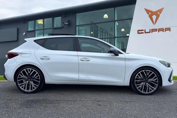 Alloys, Cruise Control, Advanced Safety, Sat Nav, Heated Steering Wheel, Collision Detection, Heated Seats, Park Assist, Ambient Lighting, Keyless Entry, Parking Sensor, Blind Spot Assist;The CUPRA Leon 2.0 TSI VZ2 DSG Euro 6 (s/s) 5 door in Glacial White with 19-inch Mistral Machined R Black and Silver alloy wheels combines striking style with advanced technology. It features a CUPRA Drive Profile for tailored driving dynamics and the CUPRA Dynamic and Comfort Pack for enhanced performance and convenience. The exterior is highlighted by CUPRA Sports bumpers, dark tinted rear windows, Matrix LED headlights, separate daytime running lights, LED front fog lamps with cornering function, and chrome and copper detailing. Inside, the cabin offers a sophisticated and sporty experience with a digital cockpit, interior ambient wraparound lighting, heated front seats, CUPRA Supersports heated steering wheel with satellite buttons, CUPRA sport pedals, and a panoramic sunroof. Safety and driver assistance are comprehensive, including Adaptive Cruise Control with Follow-to-Stop and Speed Limiter, Front Assist with forward collision warning and braking for vehicles, pedestrians, and cyclists, Lane Change Assist with Emergency Assist, Side Assist for blind spot monitoring and exit warnings, High Beam Assist, Intelligent Park Assist, electronic parking brake, and front and rear parking sensors paired with a rear view camera. Connectivity and convenience are seamless, with Full Link smartphone integration, Media System Plus with navigation, wireless phone charging, KESSY Advanced keyless start and entry, and a welcome light featuring the CUPRA logo projector in the door mirro...