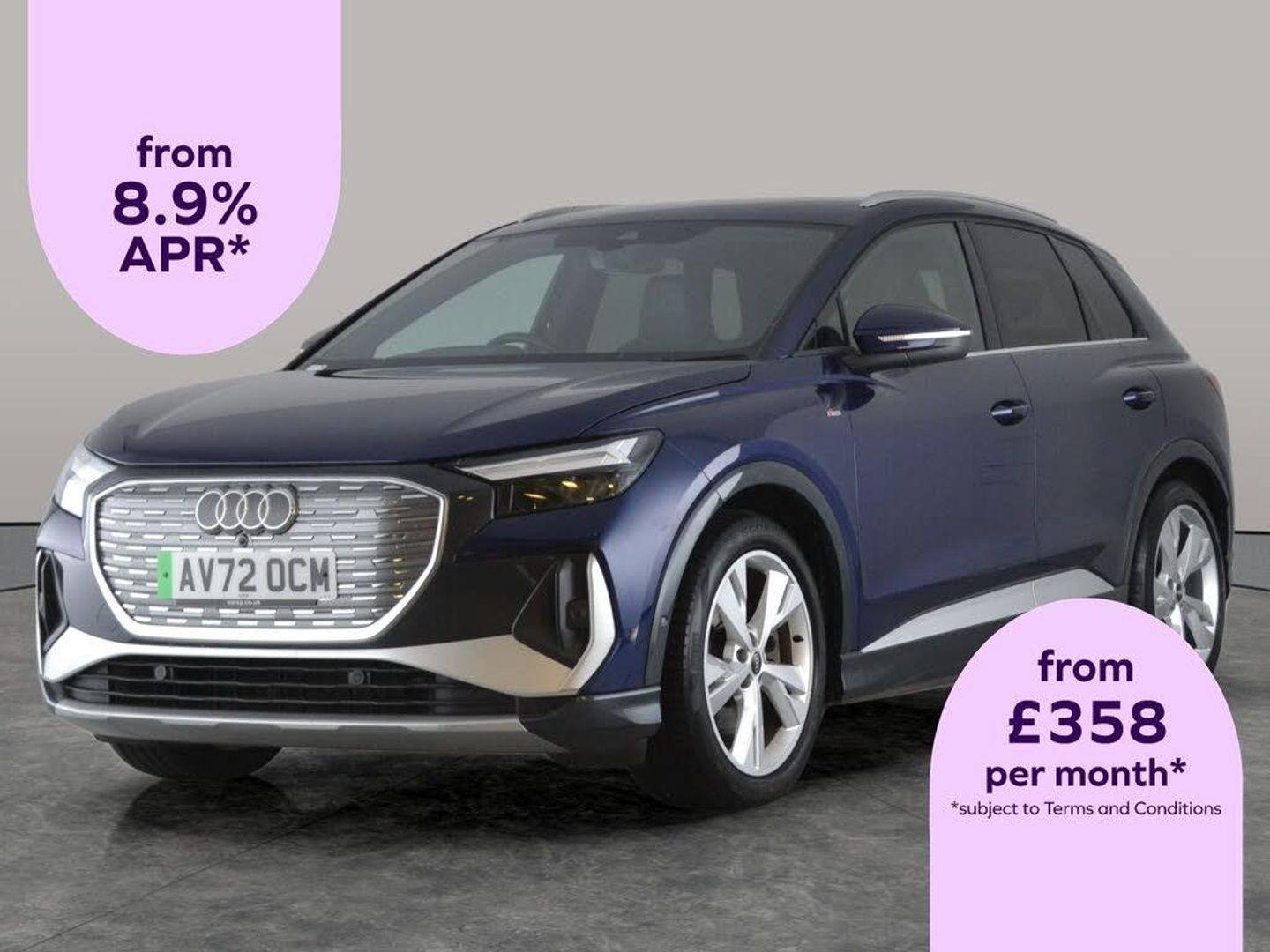 Elevate your drive with this blue Audi Q4 E-tron S Line, equipped with the sought-after Technology and Comfort & Sound Packages. Enjoy crystal-clear music with the upgraded sound system, stay connected through Apple CarPlay, and experience convenience with keyless entry. Youll love the futuristic head-up display, heated sports seats, and immersive MMI Navigation Plus. LED headlights, a reversing camera, and advanced lane departure warning add to your safety and comfort. The perfect electric SUV for those who want refinement and innovation. 2 services recorded, last serviced on 31/10/2025 at 47,337 miles. MOT to 26/10/2026. Visit our website for service history, online valuation, full vehicle specification plus multiple images. Certain features listed may be available via subscription packages at extra costs, please consult with Audi for details. This vehicle is VAT qualifying. Any feature/option specified here is from 3rd party data. We cannot guarantee the accuracy of any specification supplied by a 3rd party. We recommend that you physically check the specification of the vehicle on site prior to purchase. This information does not form part of the buying contract. Terms & Conditions apply. We have over 2,000 cars available from our 10 national branches, check our website to see all our stock. Our Trustpilot rating is 4.4/5 with over 9,000 reviews.