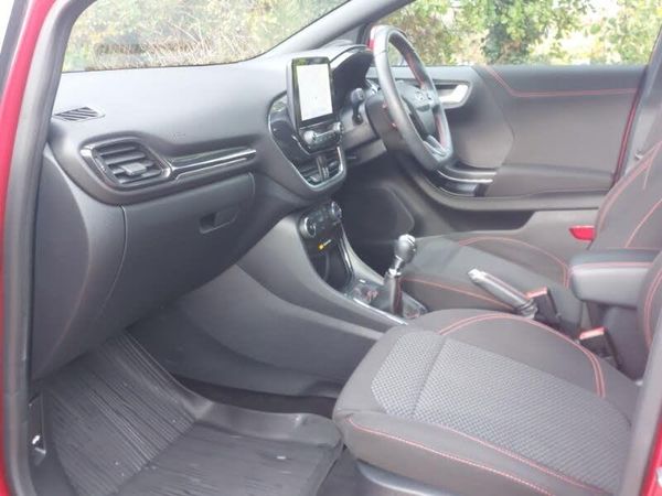 Full digital 12.3" instrument cluster, Ford SYNC 3 navigation pack - Puma, Quickclear heated windscreen, Thatcham alarm, Android Auto, Apple CarPlay, LED daytime running lights, Rear parking sensor, Lane keeping aid with lane departure warning, Power start button, Selectable drive modes(Normal, sport, Eco, trail, slippery), Power foldable heated door mirrors with puddle lamps, Automatic headlights with auto high beam, ST-Line body styling kit with unique grille, Manual 2 way passenger seat adjustment, Manual 4 way driver seat adjust with lumbar adjustment, ST- Line cloth trim with red stitching, ST-Line flat bottomed sensico leather steering wheel with leather handbrake and aluminium gear knob, Electronic stability control (ESC) and hill start assist, Tyre pressure monitoring system (TPMS)