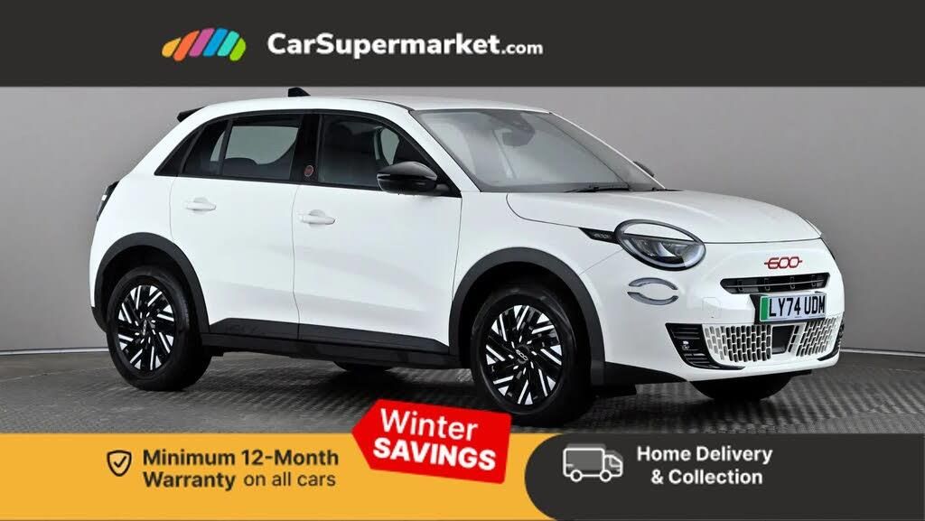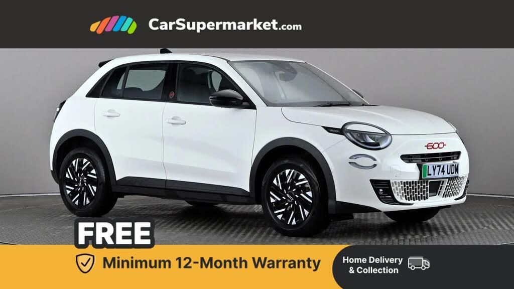 7" TFT digital cluster,Bluetooth connectivity,Connected services,Cruise control,Driver attention assist,E-call,E-Mode selector - Eco, Normal and Sport,Intelligent speed assist,Lane departure warning,Lane keeping assistant (LKA),Power assist steering,Rain and dusk sensors,Rear parking sensors,Traffic sign recognition,Wireless apple car play/android Auto,11 kW Onboard charger,DC fast charging 100kW,Mode 3 charging cable 22kW,1st Row USB type-A and USB type-C,4 speaker audio system,Uconnect infotainment 10.25" touchscreen with DAB,Automatic headlights,Black DLO,Black rubber window surround,Body colour rear skid plate,Body coloured door handles,Electric adjustable door mirrors,Front and rear power windows,Front and rear Red 600 logo,Full body cover,Gloss black finish B pillar,Gloss black finish C pillar,Gloss black fog lamp bezels,Gloss black shark fin antenna,Glossy black door mirrors,LED 3rd brake light,LED daytime running lights,LED Fog lamps with cornering function,LED front signature lighting,LED rear lights with chromed dots,LED rear signature lighting,LED reflector headlamps,Lower grille painted in body colour,Manual day/night rear view mirror,Matt black side skirts with 600 embossed logo,Matt black wheel arches,Rear bumper embossed 600 logo with Italian flag,Rear side wing doors,Rear wiper,Red logo on B-Pillar,2 Spoke synthetic leather steering wheel with audio control,3 seat bench in 2nd row,3rd Rear head restraint,4 way manually adjustable passenger seat,6 way manually adjustable drivers seat,Automatic climate control,Auxilliary 12V power socket,Chrome interior door handles,Dark metachrome dashboard ring,Dark Metachrome door panel C-shape,English handbook,Front centre armrest,Front headrests,Front passenger grab handle,Front seatback pockets,ISOFIX attachment on front passenger and rear passenger seats,Metachrome central compartment bezel,Rear seat 40/60 split,Recycled fabric upholstery,Red painted dashboard fascia,Single front passenger seat,Smart 15L storage central tunnel with RED tunnel pad cover,Sunvisors with vanity mirrors,3x3 point rear seatbelts,6 airbags,ABS,Autonomous Emergency Brake (AEB) & Vulnerable Road User (VRU) Protection,Child locks on rear doors,Electronic parking brake,ESC (Electronic Stability Control),Front passenger airbag deactivation,Seatbelt reminder and pretensioners for all seats,Keyless Go,Remote central locking,16" Steel wheels with bicolour covers,Fix and go puncture repair kit,White,Recycled Fabric - Fiat Black Monogram with Red Details