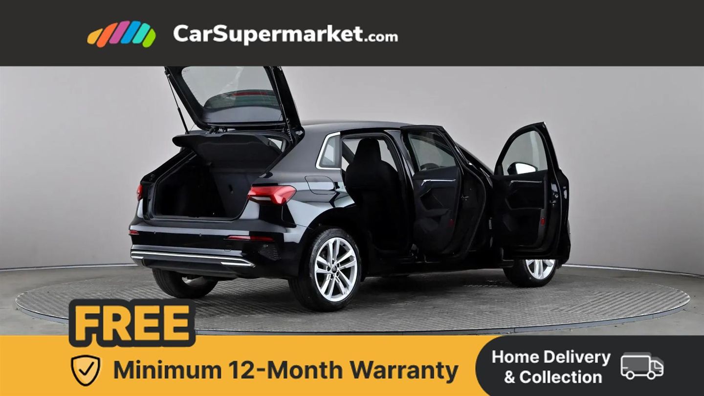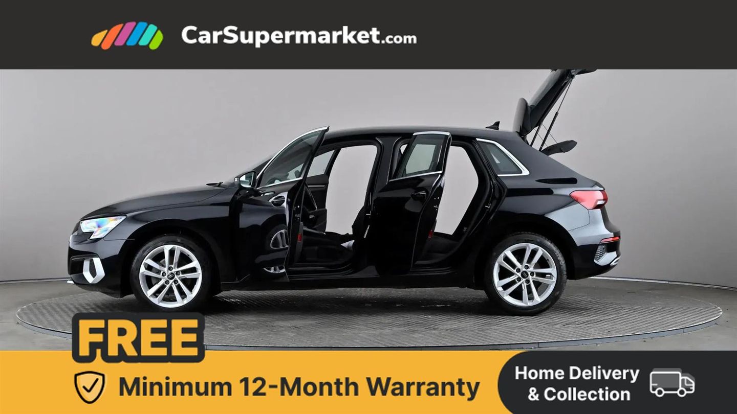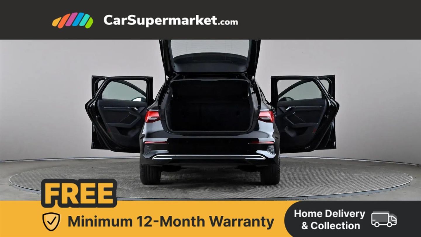 Audi drive select (Auto, Comfort, Dynamic and Individual),Audi smartphone interface,Audi Virtual Cockpit - 10.25" digital and colour instrument cluster,Automatic start/stop system with recuperation,Bluetooth interface,Camera based traffic sign recognition,Collision avoidance assistant,Cruise control,e-Call (emergency call),Electromechanical power speed sensitive steering,Lane departure warning system,MMI Navigation Plus with high resolution 10.1" colour touch screen display,Rear parking sensors,Service indicator,Trip computer,Voice control system with natural language interaction,Standard suspension,2xUSB-C connection with data and charging functions,6 passive loudspeakers,DAB Digital radio,3rd brake light,Acoustic glass windscreen,Aluminium window trim,Auto dimming frameless rear view mirror,Body colour exterior mirrors,Body colour roof spoiler,Electrically adjustable/heated/folding/auto dimming door mirrors with integrated LED indications + kerb view function for passenger side,Front electric windows,LED daytime running lights,LED headlights and halogen rear lights,Light and rain sensors,Rear electric windows,Rear side wing doors,Rear window, rear door windows and rear side windows in clear glass,Rear wiper,12V socket and storage compartment in front centre console,3 seat bench in 2nd row,3 spoke leather multifunction steering wheel,4 way electrically adjustable lumbar support for driver and front passenger,60/40 split folding rear seat bench,Dual zone electronic climate control,Front and rear headrests,Front centre armrest,Front door sill trims with aluminium inlay,Height and reach adjustable steering wheel,Interior lighting - Front and rear roof module including reading lights, glove compartment light and right hand side,Interior lighting - glove compartment light and right hand side,Luggage compartment floor covering,Manual boot compartment lid,Manually adjustable front seats,Routine cloth upholstery with front sports seats,Seat side bolsters,Single front passenger seat,Steel grey cloth headlining,Aluminium interior elements pack - A3 Sportback,LED interior lighting pack - A3 Sportback,Sport styling pack - A3 Sportback,3x3 point rear seat belts,Driver and front passenger airbag with passenger airbag deactivation,Electronic Stabilisation Control (ESC) including ABS, ASR and EDL,First aid kit with warning triangle and 2 safety vests,Front side airbags with head airbags and interaction airbag,Pre-sense front with pedestrian and cyclist detection,Seatbelt monitoring,Tyre pressure loss indicator,Anti theft alarm,Anti-theft wheel bolts,Electronically operated child locks,Immobiliser,Remote control central locking,Inlays with silk effect paint in platinum grey,Mythos Black