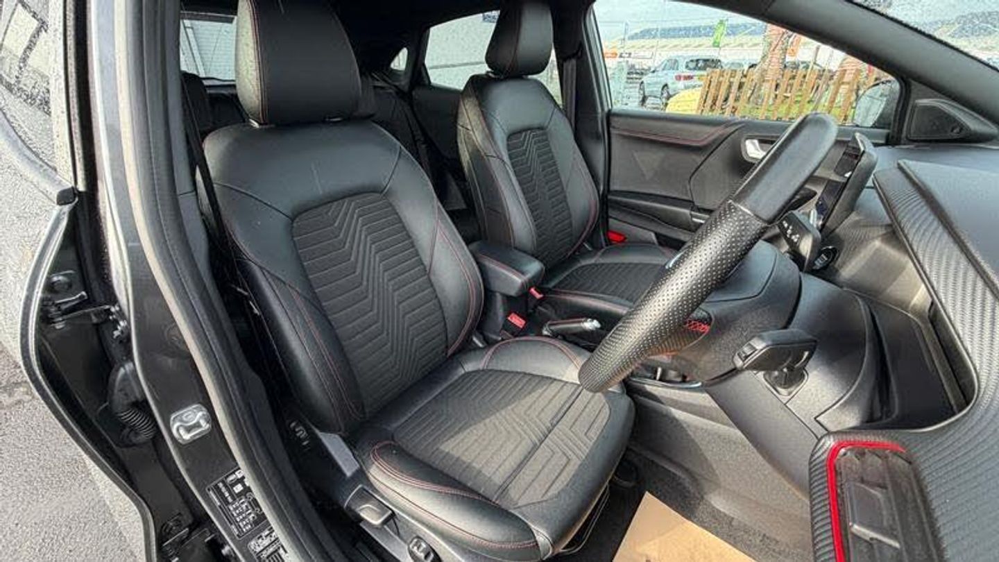 18in Alloy Wheels - 5-Spoke - Matt Black Machined Finish, ABS - Anti-lock Braking System, Acoustic Laminated Windscreen, Active Grille Shutter, Automatic Dimming Rear View Mirror, Automatic Headlights with Rain-Sensing Wipers and Auto High Beam, B&O Premium Audio System and Ford SYNC 3 Navigation, Carbon-Look Interior Deco Spears, Centre Console - Premium with Openable Stowage Area with USB Connectivity - 2 Cupholders and 12v Power Point, Courtesy Lights - Ambient LED Courtesy Lighting - Single Colour, Cruise Control with Intelligent Speed Assist, Drivers Manual 4-Way Seat Adjustment with Manual Lumbar Adjust, ESC - Electronic Stability Control and Hill Start Assist, Ecoboost Hybrid Tailgate Badge, Electric Windows - Front and Rear, Electronic Air Temperature Control - EATC, Emergency Brake Warning - Automatic Hazard Warning Lights, First Aid Kit Strap, Ford MegaBox Extended Bootspace, Ford Power Starter Button, Front Bumper - Unique ST-Line Sport Design - Body Colour, Front Floor Mats, Front Fog Lights with Cornering lights and LED Rear Lamps, Front Seats - Sports Style, Full Digital 12.3in Instrument Cluster, Gear Knob - Aluminium, Handbrake - Black Sensico Trimmed with Stitching, Headliner - Deluxe, Instrument Panel - High Level, Intelligent Speed Assistance, Lane Keeping Aid with Lane Departure Warning, Large Rear Spoiler - Body Colour with Centre High Mounted Stop Light, Locking Wheel Nuts, Lower Bodyside Moulding - Body Colour, Passenger 4-Way Seat with Lumbar Adjustment, Post Collision Braking, Power Steering, Power-Foldable Heated Door Mirrors with Puddle Lamps, Pre-Collision Assist with Autonomous Emergency Braking and Pedestrian-Cyclist Detection, Privacy Glass, Projector Headlamps with LED Daytime Running Lights, Puma Badge, Quickclear Heated Windscreen, Rear Bumper Body Colour - Diffuser, Rear Parking Sensors, Rear Seats - 2-Way Head Restraint Up-Down, Rear Seats - Second Row 60-40 Folding Seats, Remote Central-Double Locking, Restrain Device Pack, ST-Line Badge, ST-Line Body Styling Kit, ST-Line Flat-Bottomed Leather Steering Wheel with Unique Red Stitching, Selectable Driving Modes - Normal - Eco - Sport - Slippery and Trail, Soft-feel Gearshift Boot with Red Stitching, Speed Limiter, Sports Suspension, Tailgate - Manual, Thatcham Alarm, Traction Control and Emergency Braking Assistance, Trip-Fuel Computer, Tyre Inflation Kit, Tyre Pressure Monitoring System - TPMS, Wireless Charging Pad with Electronic Air Temperature Control EATC