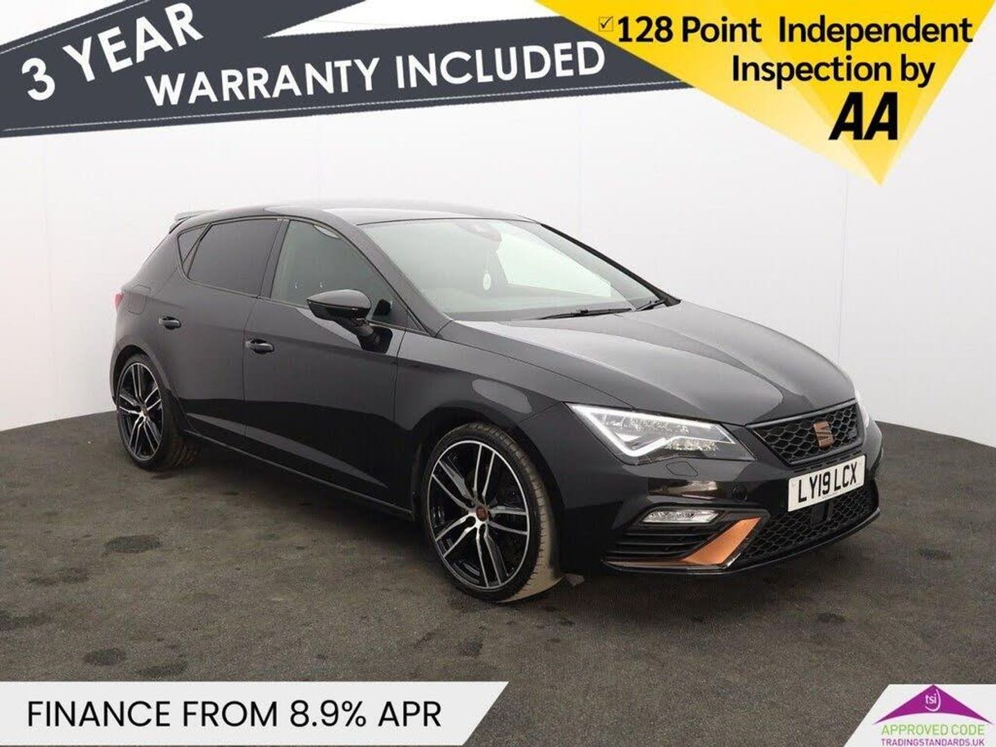12V Power Supply in Centre Console, Media System Plus, Navigation System, SEAT Full Link Smartphone Integration - Mirror Link - Apple CarPlay - Google Android Auto, USB Cable for Apple and Android Compatibility, 19in Alloy Wheels - CUPRA Machined, Brake Callipers - Black, Bumpers - Exclusive Cupra Front and Rear, Dark Tinted Rear Windows, Electrically Adjustable and Heated Door Mirrors, Electrically Foldable Exterior Mirrors with Parking Position and Passenger-Side Mirror with Lowering, Front and Rear Electric Windows, Gloss Black Door Mirrors with Integrated LED Indicators, Radiator Grille Frame in Glossy Black, Radiator Grille in Black, Visual Dual Exhaust Pipes, Armrest - Front with Storage Compartment, Black Interior Roof Lining, Boot Storage Net, Cargo Rings in the Boot, Convenience Pack Plus, Digital Cockpit, Driver and Passenger Seat Height Adjustment, Driver and Passenger Sunvisor with Covered and Illuminated Mirrors, Drivers Seat Lumbar Adjustment, Dual Zone Climate Control, Electrically Adjustable Driver Seat, Flat Bottomed-Perforated Leather Steering Wheel with White Stitching and CUPRA Logo, Front Seat Back Storage Pockets, Illuminated Aluminium Front Door Sill with CUPRA Logo, Instrument Lighting with Brightness Control, Interior CUPRA - Black, Interior Detailing - Black, LED Interior Illumination Pack, Multi Coloured Ambient Lighting, Pedals in Aluminium, Seats - Passenger Lumbar Adjustment, Split Folding Rear Seats 60-40 with Armrest, Steering Wheel-Mounted Gearshift Paddles, Two Height-Adjustable Front and Rear Headrests, Winter Pack, Electro-Mechanical Progressive Power Steering, ESC Switch-Off Key, Full LED Headlights, Leather Sports Seats - Black, Lights Left On Warning Buzzer, Lower Suspension - 15mm, Mechanical Limited Slip Differential, Midnight Black, 7 Airbags, ABS and Traction Control System - TCS - Electronic Stability Control - ESC - and Electronic Differential Lock System - XDS, Adaptive Cruise Control - ACC, Alarm - Volumetric, Digital Clock, Electric Parking Brake Including Autohold Function, ESC - Electronic Stability Control and Tyre Pressure Warning Light Indicator, Front and Rear Parking Sensors, Front Assist with Pedestrian Protection, Gearshift Indicator, Hill Hold Control, ISOFIX Points in Outer Rear Seats with Top Tether Anchorage Points, Keyless Entry and Go - KESSY and Wireless Phone Charger, Low Fuel Warning Light, Multi-Collision Braking System, Outside Temperature Gauge, Remote Central Locking with Deadlocks, RPM Counter, SEAT Drive Profile, Seatbelt Reminder - Front, Trip Computer