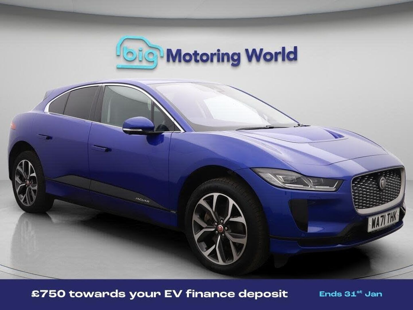 £750 towards your finance depo-Our Jaguar I-PACE is finished in Blue. Specification includes a range of fantastic features including £750 towards your finance deposit, All Wheel Drive, Leather Seats, Apple CarPlay, Adaptive Cruise Control, Meridian Speakers, Lane Assist, Android Auto, Satellite Navigation, Privacy Glass Specification information is supplied by CAPHPI and may vary to the actual car. This data does not form any part of a buying contact. Please check specification prior to purchase in-store. The MOT is valid until September 2026, visit bigmotoringworld.co.uk for more photos, a 360 tour, service history and a free HPI report.Were BIG on peace of mind and this Blue Jaguar I-PACE has completed our comprehensive 200 point inspection and passed all checks. Its ready for you to drive away with immediate collection in-store. We include a 90-day warranty as standard plus an option to extend for up to 3 years.Reserve this car exclusively for you, safely and securely at bigmotoringworld.co.uk, with a fully refundable £99 deposit. Test drive before you buy, with no commitment, no hassle and a completely haggle free experience. Still searching and want to see thousands more cars? We are BIG on choice with over 8000 cars to choose from.Visit our award winning web site bigmotoringworld.co.uk.Were Big Motoring World and were BIG on what matters to you.