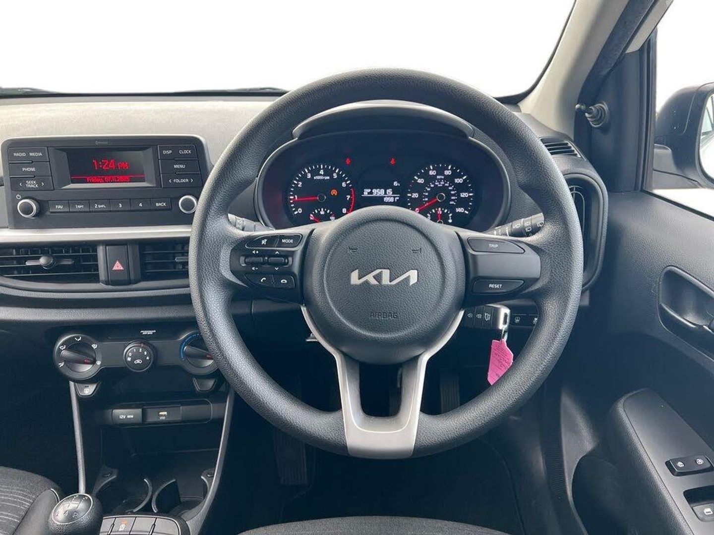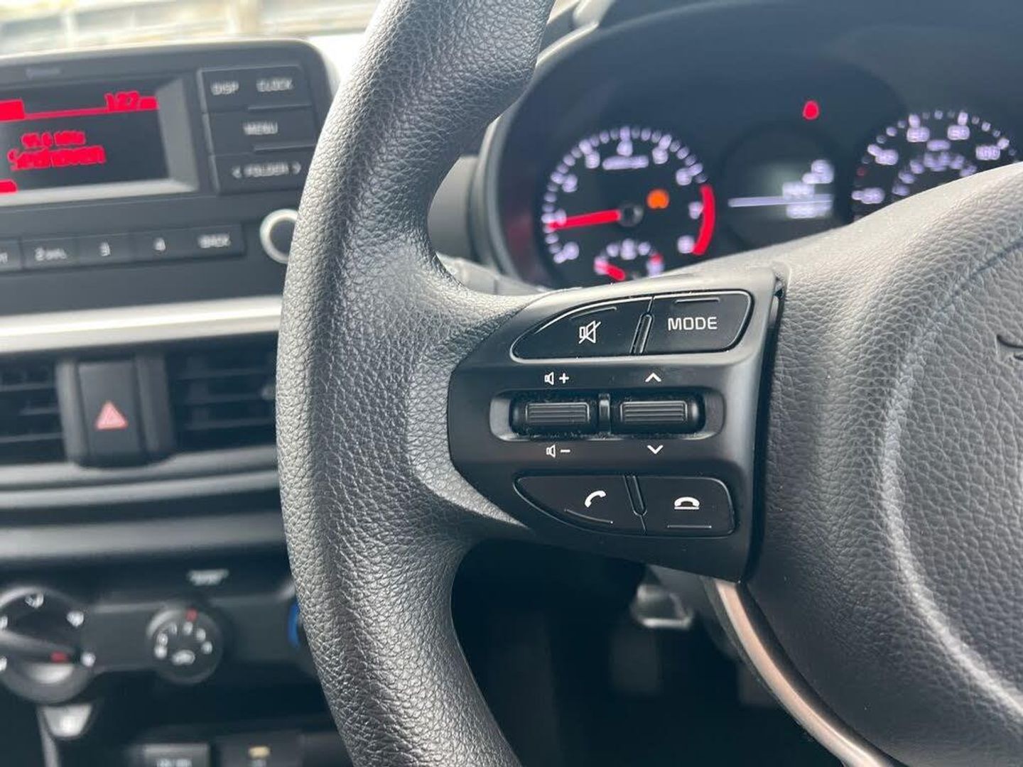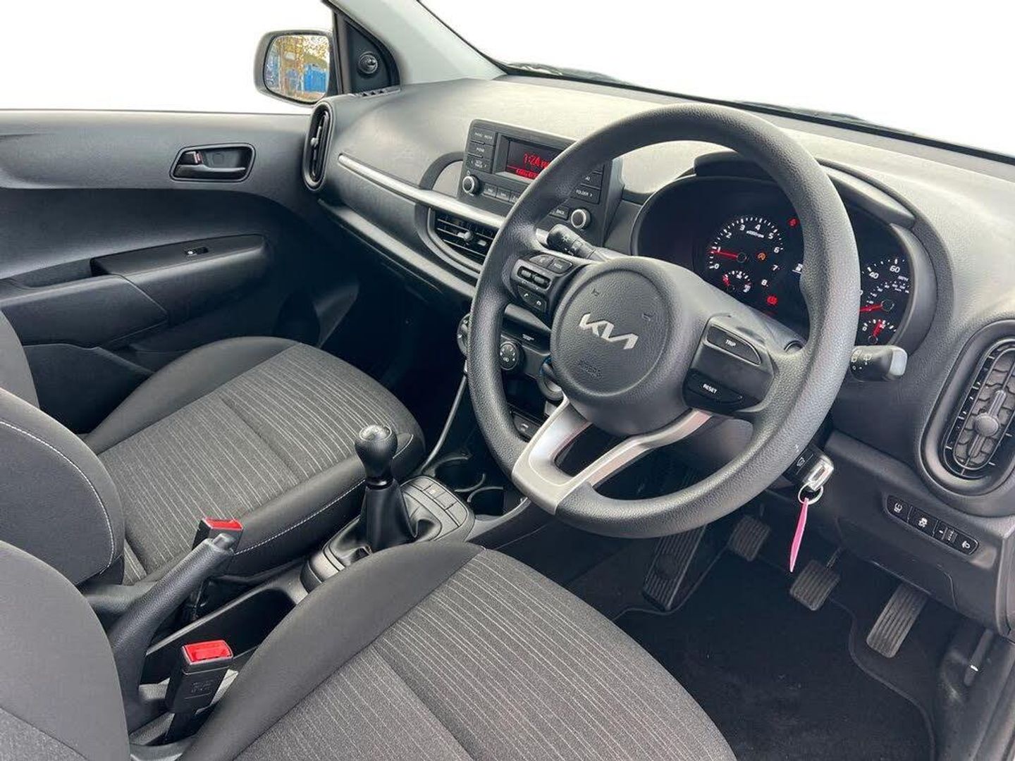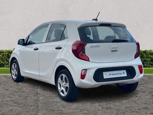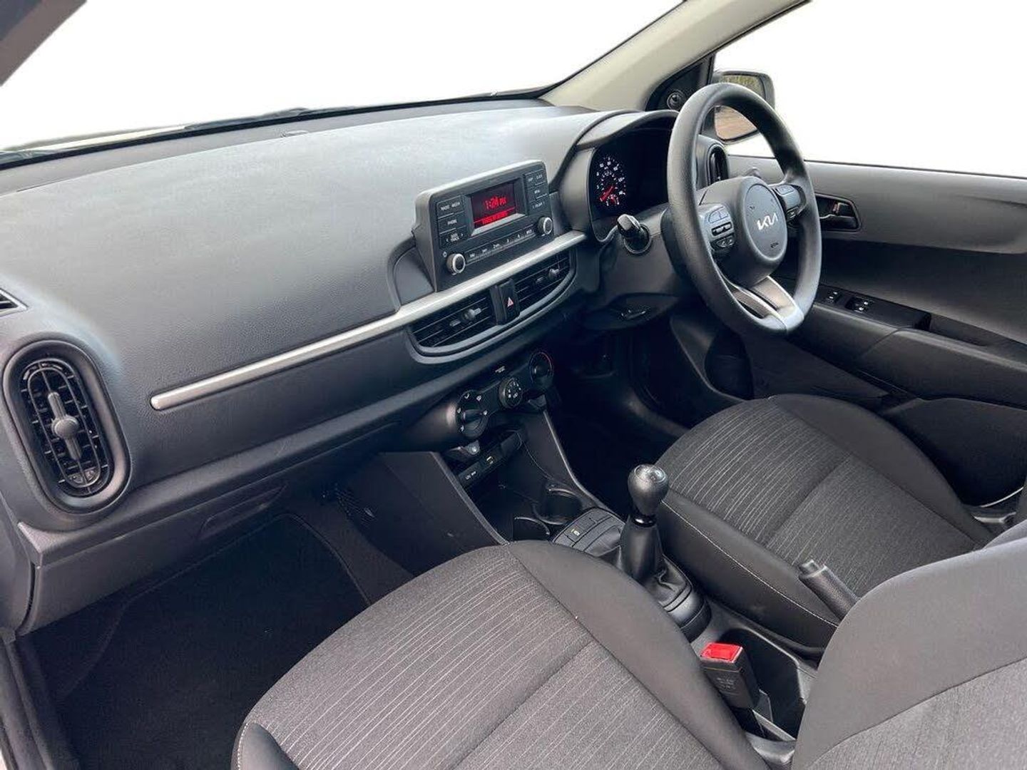 3.8" monochrome audio display with RDS and DAB, Emergency call service, Emergency stop signalling system, External temperature gauge, Motor driven power steering, Tachometer, Tailgate, Trip computer, 2 speakers, Bluetooth with music streaming, Steering wheel mounted controls, USB ports for connection of a media device, Automatic headlight control system, Black grille with silver surround, Body colour bumpers, Day/night rear view mirror, Daytime running lights, Front electric windows with drivers auto up and down function, Headlamp levelling, Heated rear window, High mount brake light, Manually adjustable door mirrors, MFR - Multi Focus Reflector halogen headlights with black bezel, Rain sensor, Rear fog lights, Rear side wing doors, Rear wash/wipe, Speed variable front wipers, Tinted glass, Visible VIN plate, Welcome and follow-me home light functionality, 1 x rear coat hook, 12V power point front, 2 seat bench in 2nd row, 3 x passenger assist grips, 60/40 split/folding 2nd row of seats, All round height adjustable headrests, Black interior door handles, Cloth upholstery, Cupholders in centre console, Driver and front passenger sunvisor with vanity mirror, Front cabin lights, Glovebox, ISOFIX Child seat top tethers and anchor fixings, Luggage area light, Luggage area parcel shelf, Single front passenger seat, Slide/reclining front seats, Tilt adjustable steering wheel, Advanced Driver Assistance Pack - Picanto, 2 x 3-point rear seatbelts, ABS/EBD, Automatic unlocking of doors in case of impact, Dual front airbags, ESC + BAS + VSM + HAC, Front passenger airbag cut-off switch, Front seatbelt pretensioners + load limiters, Hill hold control, Knee airbags, Rear child proof door locks, Seatbelt warning, Side impact protection, Torque vectoring brake based and straight line stability (SLS), Traction control, Twin curtain airbags, Twin front side airbags, Tyre pressure monitoring system, Anti theft alarm, Engine immobiliser, Folding key, Remote central door locking, 14" steel wheels with cover, Tyre mobility kit