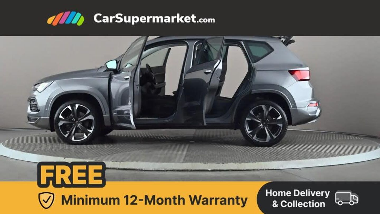 Cruise control system with speed limiter,Digital cockpit,Driving profile selection and conventional shock absorber,E-call,Electric tailgate with virtual pedal,Outside temperature gauge,Progressive power assisted steering,Rear view camera,Self parking functionality (includes front and rear parking sensors),Trip computer,Wireless full link smartphone integration,Wireless phone charger,Front and rear shock absorption, chassis with increased ride height,Steering wheel mounted audio/phone controls,Body colour bumpers with dark aluminium diffusor,Body coloured wheel arch surrounds,Dark tinted rear windows,Daytime running lights,Door mirrors with welcome CUPRA light silhouette,Dynamic headlight range control with self adjusting whilst driving,Electric adjustable/heated/folding door mirrors,Front and rear electric windows,Front grille frame in chrome,Full LED headlamps with lens and LED front fog lamps with cornering function,Gloss black door mirrors,Gloss black roof rails,Gloss black side mouldings,Gloss black side window trim,Illuminated aluminium front door sill,LED rear tail lights with dynamic indicators,Rear fog lights,Rear side wing doors,Rear spoiler,Rear wash/wipe,Specific CUPRA design front bumper,Standard rear exhaust tailpipes,Third brake light,12v socket in front,3 seat bench in 2nd row,60/40 split folding rear seat,Aluminium pedals,Cupra steering wheel emblem,Dual zone climate control,Electric driver seat with memory function,Front and rear head restraints,Front centre armrest,Front seat back storage pockets,Grey roof lining,Heated front seats,Heated steering wheel,Height adjustable driver and passenger seat with lumbar adjustment,ISOFIX points in outer rear seats with top tether anchorage points,Leather sport bucket seats,Leather steering wheel and gear knob,Multicoloured ambient lighting with LED interior illumination,Pedal cluster,Rear armrest and easy back seat release mechanism from boot,Single front passenger seat,Sports steering wheel,Steering wheel mounted gearshift paddles,Storage compartment in roof console for sunglass,Storage compartment under driver's seat,Convenience pack - Ateca,Interior lighting pack - Ateca,Navigation system plus pack with DAB - Ateca,Safety and driving pack - Ateca,3x3 point rear seatbelts,ABS, Traction control system (TCS), Electronic stability control (ESC) and Electronic differential lock system (XDS),Airbags - Driver and front passenger airbag with deactivation, front side, two curtain and driver's knee airbags,Black brake callipers with CUPRA logo,Electric parking brake with auto hold function,Front and rear seatbelt reminder,Front assist with autonomous emergency braking,Hill hold control,Manual rear child locks,Single tone horn,Tiredness recognition system,Tyre pressure monitoring system,Alarm,Keyless entry,Locking wheel bolts,19" Sport machined alloy wheels 36/3 in black/silver