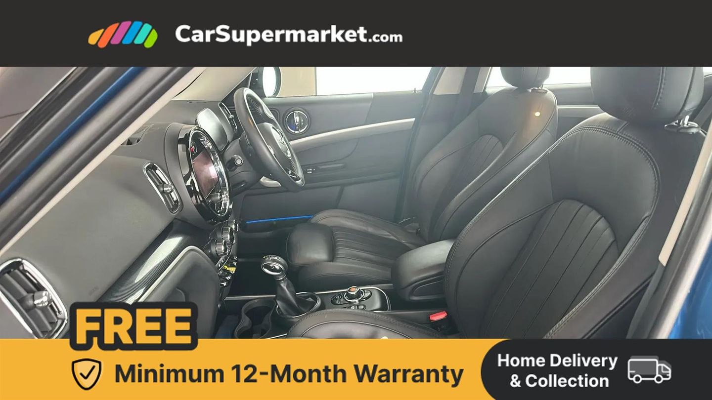 Active Guard incl speed limiting and lane departure functions with auto steering, and front collision warning with brake intervention,Automatic start/stop function with brake energy recuperation,Compatible mobile phone bluetooth with audio streaming,eDrive button,Electro-mechanical speed dependant steering assistance,Instrument cluster,On board computer,36L fuel tank,Automatic transmission,Charging flap on front left lower A-panel,Double Vanos system,Fully variable valve control,High precision injection,Home charging cable,Performance Control,Public charging cable,FM tuner and DAB digital radio,Bonnet scoop,Chrome fuel filler cap,Day time driving lights,Dynamic brake lights,Electric windows,Heated rear window,Heated windscreen washer jets,LED fog lights,Metal door sill strips with Cooper S imprint,MINI yours exterior badge in C-Pillar, driver and passenger side,Model logo,Model logo on Tailgate,Rain sensor with auto headlights,Rear fog lights,Rear window wiper,Side scuttle panel with integrated indicator,Split rear doors,Sun/heat protection glass,White indicator lenses,12V socket in centre console,360L luggage compartment capacity,4 lashing eyes in luggage compartment,40:20:40 split folding rear seats,Anthracite headlining with grab handles and clothes hooks,Chrome interior highlights,Colour line - Carbon black,Cupholders,English handbook,Front headrests,Glove compartment,Height and length steering column adjustment,Interior lighting with 12 basic colours selectable via toggle switch in roof,Isofix rear child seat preparation,Leather gearshift lever and handbrake gaiters,LED reading lights, vanity mirror lights, front foot well light and spotlight on front seats,MINI Yours fine walk nappa leather steering wheel with contrast stitching in silver and MINI Yours badge,Multifunction steering wheel,Rear headrests,Storage compartments in doors,Sunvisors with vanity mirrors,Excitement pack - Countryman,Navigation pack - Countryman,2 tone horn,3 point seatbelts on all seats,6 Airbags - front, side, head and seat belt tensioners,Acoustic pedestrian protection,Anti-lock braking system (ABS),DSC - Dynamic Stability Control,Electronic handbrake,Front and rear disc brakes,Hill start assist,Tyre pressure monitoring system,Alarm system with tilt sensor, monitoring doors, bonnet interior and tailgate,Auto drive away locking,Deadlocking function,Electronic vehicle immobiliser,Locking wheel bolts,Start/stop toggle with keyless go,Tool kit,Automatic Operation of Tailgate,Comfort Plus Pack,Island Blue,MINI Yours Lounge Leather - Carbon Black,Roof and Mirror Caps - Black
