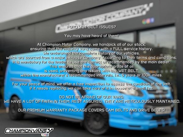 Welcome to Champion Vans LTD, we are a family run business with 60 years combined experience through 3 generations within the motor trade specialising in high quality used vans! WE ARE THE MAIN SUPPLIER OF DE-FLEET BRITISH GAS VANS IN THE UK. Upgrade your van today because image is everything! Enhance your professional presence and make a statement with our top-quality vans!, This has been meticulously maintained from new, using the correct wet belt oil for longevity of the belt. But for piece of mind we can do a free in house belt inspection with photographs as proof or a replacement for a small cost. 34,000 Miles, Sport Body Kit + Wheel Upgrades: , - Colour Coded Rear Bumper, Front Splitter , Rear Spoiler, - Side Bars, - Load Rated Alloys , - Front Ford Letter Gloss Black Grill With DRL Lights. Specification: , - Heated Seats, - Traction Control , - Drive Mode , - Parking Sensors , - Heated Windscreen , - A/C, - Cruise Control, - 6 Speed Gear Box, - 12v Sockets , - Apple Car Play, - Sliding Door , - Barn Doors, , Supplied with 6 months warranty, All vehicles are supplied with a new MOT and service if due. Part exchange available at trade price, delivery options available, , --FINANCE PACKAGES AVAILABLE--, VISIT OUR WEBSITE - WWW.CHAMPIONMOTORCOMPANY.CO.UK, *RESERVE THIS VEHICLE WITH A 99 DEPOSIT*, *DETAILED WALK AROUND VIDEO SENT VIA WHATSAPP ON REQUEST*, All of the vehicles sold at Champion Motor Company are accompanied with a 100 POINT CHECK, SERVICE and a NEW MOT (if the current one is less than 6 months). Only OE quality parts are utilised when servicing our vehicles, this assures the service is completed as recommended by main dealer. We provide a 6 month warranty as standard with every purchase, extended warranty options are also available. Please note, all our vehicles are subject to a customer support pack at a fee of 125+VAT. This includes a HPI check, inspection report, preparation checks and a full valet and machine polish. Champion Motor Company offers UK wide delivery. Please contact a member of staff for prices. DEPOSITS ARE NON REFUNDABLE WHEN AGREEING TO OUR STOCK