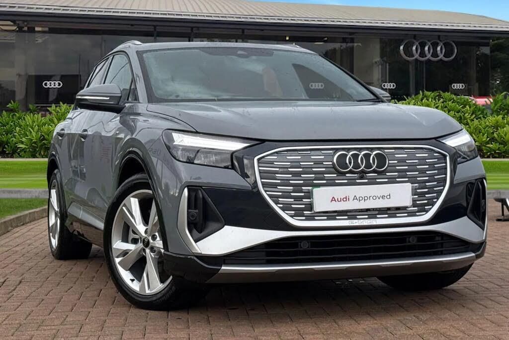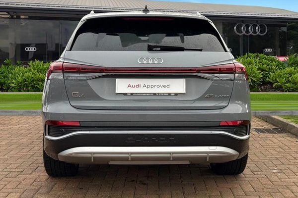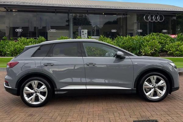 Ambient Lighting, Alloys;Striking, sophisticated, and fully electric ? this Approved Used Audi Q4 e-tron 45 S line perfectly balances progressive design with everyday practicality. Finished in elegant Pebble Grey, it stands out with its bold proportions, sharp S line styling, and distinctive 20-inch alloy wheels, giving it a commanding presence on the road. Powered by a refined 82 kWh battery producing 286 PS, the Q4 e-tron 45 delivers instant electric performance and a range of up to 290 miles (WLTP). Smooth, quiet, and responsive, it provides the effortless driving experience you?d expect from Audi, with confident traction and stability in all conditions. Inside, the Q4 e-tron 45 S line offers a premium, driver-focused environment. S line sport seats, high-quality materials, and ambient lighting create a refined atmosphere, while the Audi Virtual Cockpit and MMI touch display put cutting-edge technology right at your fingertips. Every detail has been designed for comfort, convenience, and modern connectivity. As part of the Audi Approved Used programme, this vehicle has passed a comprehensive 149-point inspection and includes a minimum 12-month warranty, Audi Roadside Assistance, and full service history ? giving you complete confidence and peace of mind. ?This vehicle is compliant with Clean Air Zone (CAZ) or Ultra Low Emission Zone (ULEZ) regulations, meaning it produces low emissions and helps to improve air quality in our cities. We offer flexible finance packages* Terms & conditions apply....