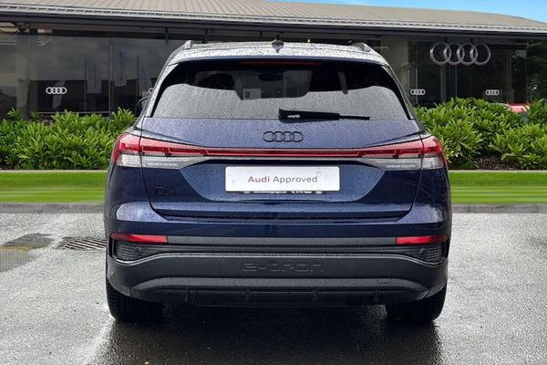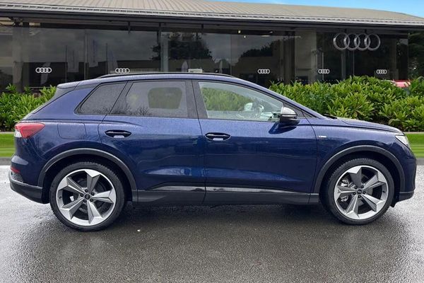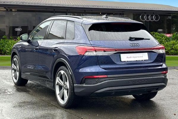 Ambient Lighting, Alloys;This Approved Used Audi Q4 e-tron 45 Black Edition in striking Navarra Blue combines bold S Line styling with advanced electric performance. Powered by an 82kWh battery offering up to 334 miles range, it supports AC and DC charging, reaching 80% in just 28 minutes on a public 150kW ultra-rapid charger. Its sporty exterior features 21-inch 5-arm rotor Evo alloys, S Line bumpers and side skirts, black styling pack, Matrix LED headlights with dynamic digital light signatures, LED rear lights with light strip, black roof rails and contrast accents. The interior blends luxury and technology, with S Line Twin Leather front sport seats, heated seats, 4-way electric lumbar support and dark matt brushed aluminium inlays. The twin-spoke leather multifunction steering wheel with S emblem and shift paddles, ambient lighting package plus, stainless steel pedals and illuminated S Line door sills add a premium sporty feel. Practical features include split-folding rear seats, 12V & 2x USB-C ports in rear and a power-operated tailgate. Infotainment is comprehensive with MMI Navigation Plus 11.6-inch touchscreen, Audi Virtual Cockpit 10.25-inch display, SONOS premium sound system, Audi Phone Box, Bluetooth, DAB radio and Audi Smartphone Interface. Safety includes Audi Pre-Sense Front with pedestrian and cyclist recognition, lane departure warning with emergency assist, swerve and turn assist, rear seat occupant reminder, camera-based traffic sign recognition, rear-view camera and Parking Sys...