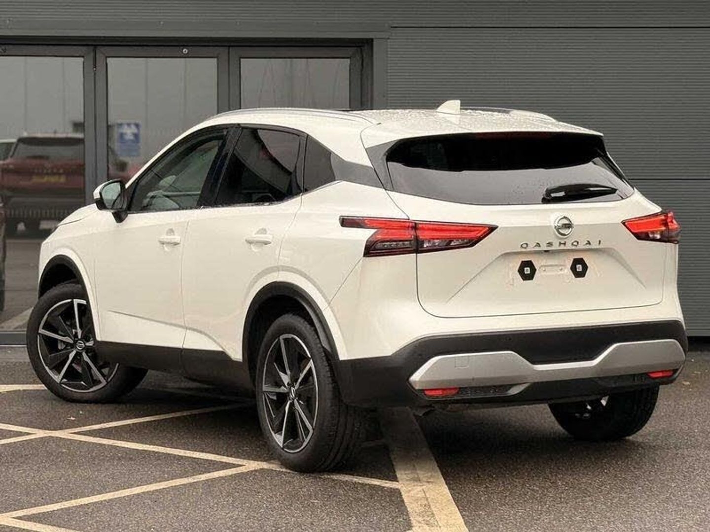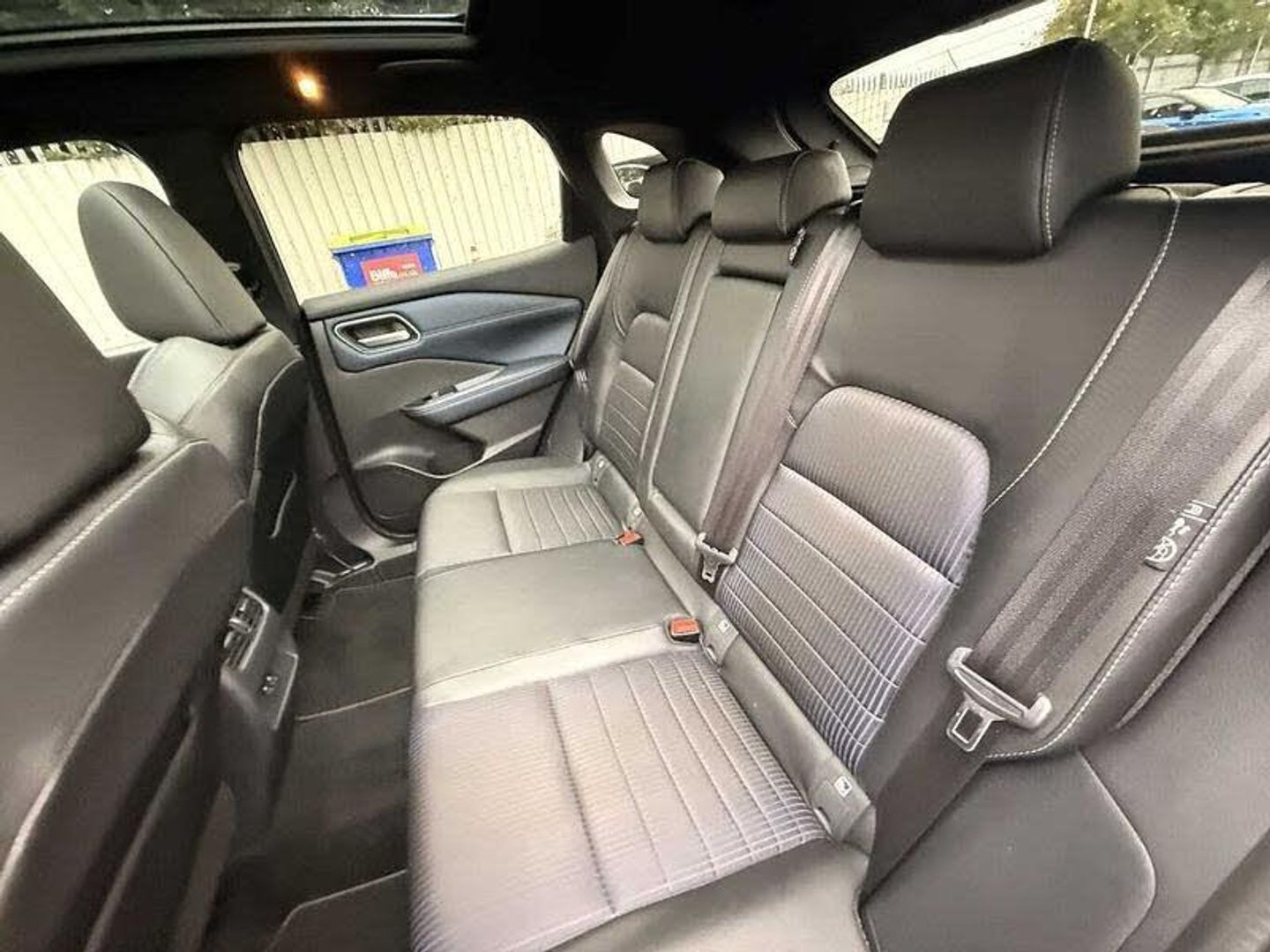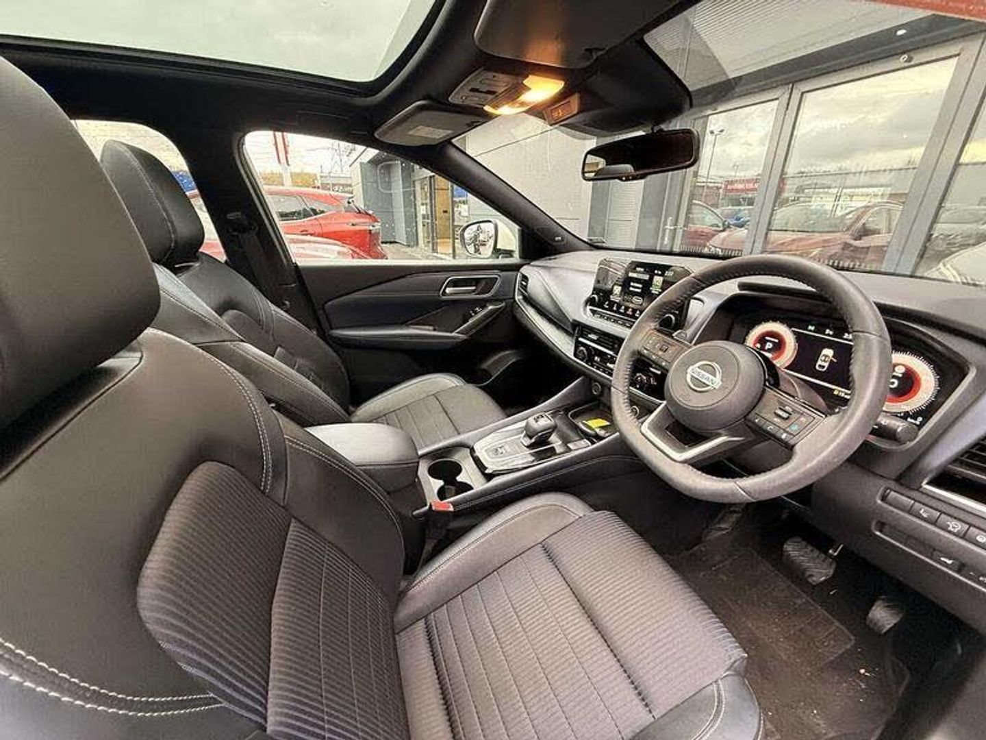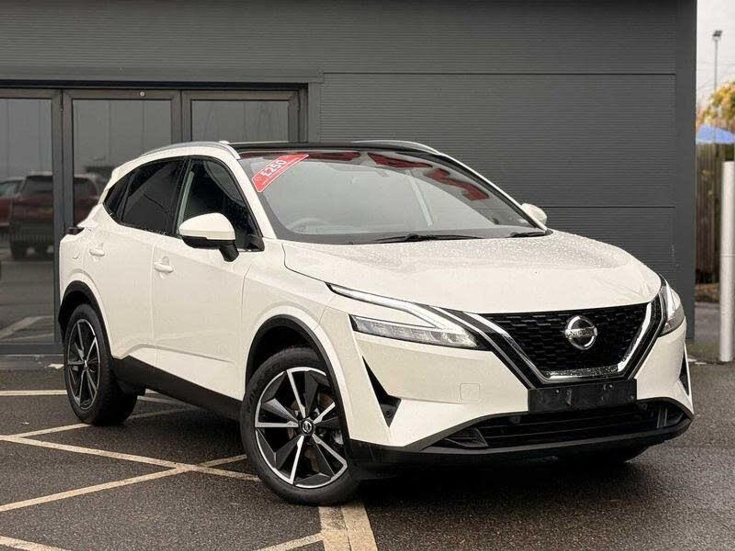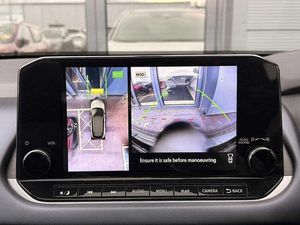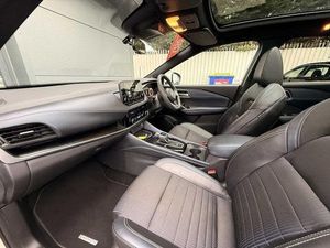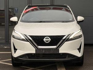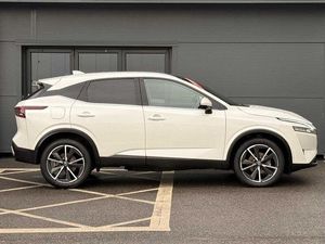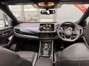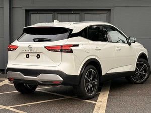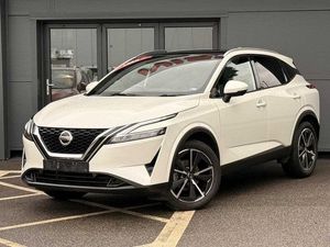 Exterior Features, Pearlescent paint, Wheels, Tyre puncture repair kit, Paint - Pearlescent, Pearl - Storm white, Trim - Part Leather, Cloth/syntech leather monoform - Blue black, Exterior Features, Auto rear wiper when reversing, One touch front and rear electric windows with remote opening and closing, Privacy glass, Splash free rain sensing wipers, Super UV and infrared cut glass, Body coloured door handles, Bodyside mouldings, Chrome side window finisher, Fixed panoramic glass roof with electric sunshade, Partially body coloured bumpers, Rear roof spoiler, Rear styling plate, Roof rails, Shark fin antenna, Follow me home headlights, Intelligent auto headlights, LED daytime running lights, LED signature rear lights, Three blink turn signal, Safety, ABS, ESP, EBD and brake assist, Active brake limited slip, Auto hold function, Electronic parking brake, Hill start assist, Intelligent blind spot intervention, Intelligent front emergency braking with pedestrian, cyclist recognition and junction assist, Intelligent rear automatic braking, Vehicle dynamic control, Blind spot warning, Drive modes (sport, normal, eco), Electric speed sensitive power steering, Front and rear parking sensors, Intelligent Cruise control (ICC), Intelligent driver alert system, Intelligent forward collision warning, Intelligent lane intervention, Lane departure prevention, Lane departure warning system, Moving object detection, Rear cross traffic alert, Traffic sign recognition with legal speed adjustment, Auto dimming rear view mirror, Body colour mirror caps, Electric auto folding door mirrors, Electrically adjustable and heated door mirrors with LED turn indicator, 3x3 point rear seatbelt pretensioners + load limiters, Child locks on rear doors, Curtain and front side, far side airbags, Driver and passenger airbags, Driver, passenger and 2nd row rear seat belt reminder, Front seatbelt pretensioners + load limiters, Height adjustable front seatbelts, Tyre pressure monitoring system, Driver Convenience, Hands free power tailgate, Idle stop/start system, Push button starter, Miscellaneous, Emergency and breakdown call, Full Digital 12.3 inch TFT Digital Combimeter, Trip computer, Audio / Communications, 6 speakers, AM/FM audio system with DAB, Bluetooth audio streaming, Front USB connections (Type-A and Type-C), Rear USB charging only ports (Type-A and Type-C), Interior Features, Dual zone automatic climate control with pollen filter, 12v power socket in dashboard and luggage, 2x Rear coat hooks, 4 grab handles, 6 Luggage hooks - 4 on floor, 2 on side, Centre console storage tray, Chrome interior door handles, Cloth/syntech leather monoform upholstery, Dark headlining, Front centre console and armrest, Front cupholder, Front door with bottle holders, Hard trunk cover, Leather steering wheel, Luggage board system, Multifunction steering wheel, Rear armrest with 2 cupholders, Rear door bottle holders, Soft PVC kneepad, Steering wheel gearshift paddles, Steering wheel switches, Tilt/telescopic adjustable steering wheel, Ambient lighting around centre console, Ambient lighting in front doors, Glovebox with light, Luggage space lighting, Welcome light and doors with console tray ambient lighting, Driver and front passenger sunvisors with illuminated vanity mirrors, Packs, Connectivity Pack - Qashqai, Heat pack - Qashqai, Tech Pack (ProPILOT + HUD), Trim, 2 way electrical driver lumbar adjustment, 3 rear headrests, 60/40 split folding rear seat, 8 way electric adjustable drivers seat, Driver seat back pocket, Height adjustable front headrests, Manual lumbar support on passenger seat, Manually adjustable passenger (slide recline + lifter), Passenger seat back pocket, Two rear isofix child seat anchorage points with top tether, Security, Capless fuel filler, Engine immobiliser, Nissan i-key, Remote central door locking with deadlocking, Thatcham Cat.1 alarm, Wheels, 19 inch Alloy wheels