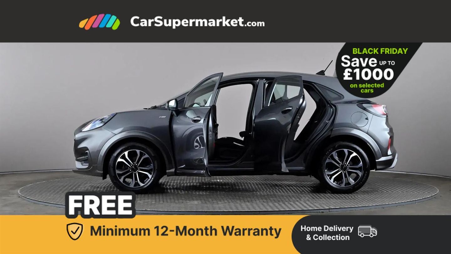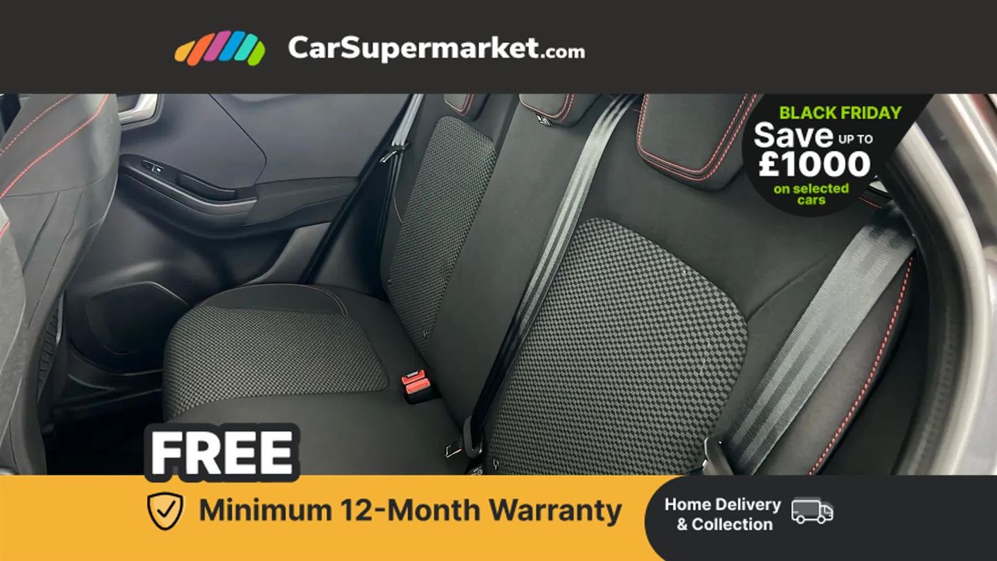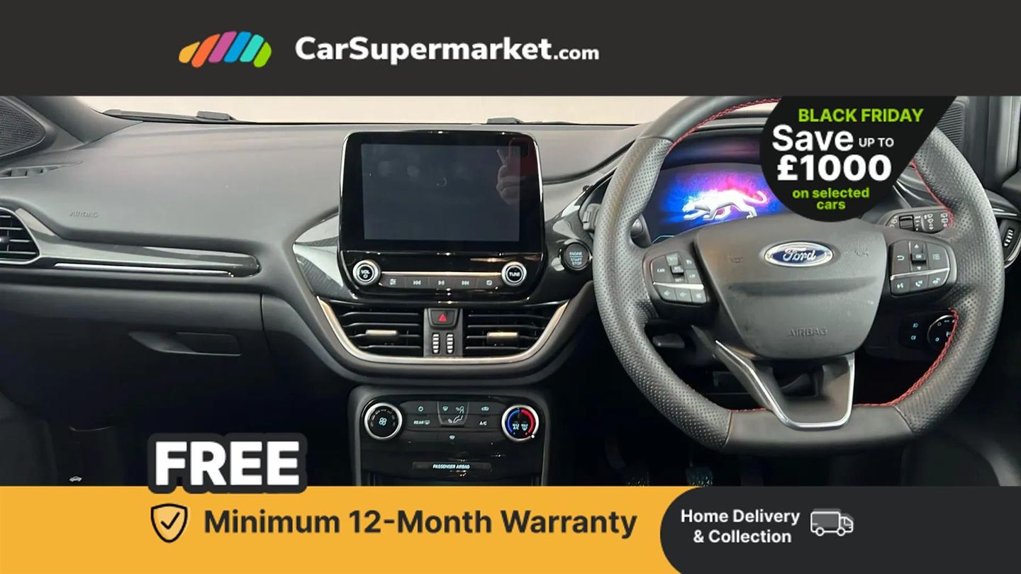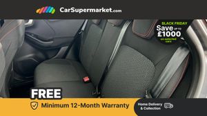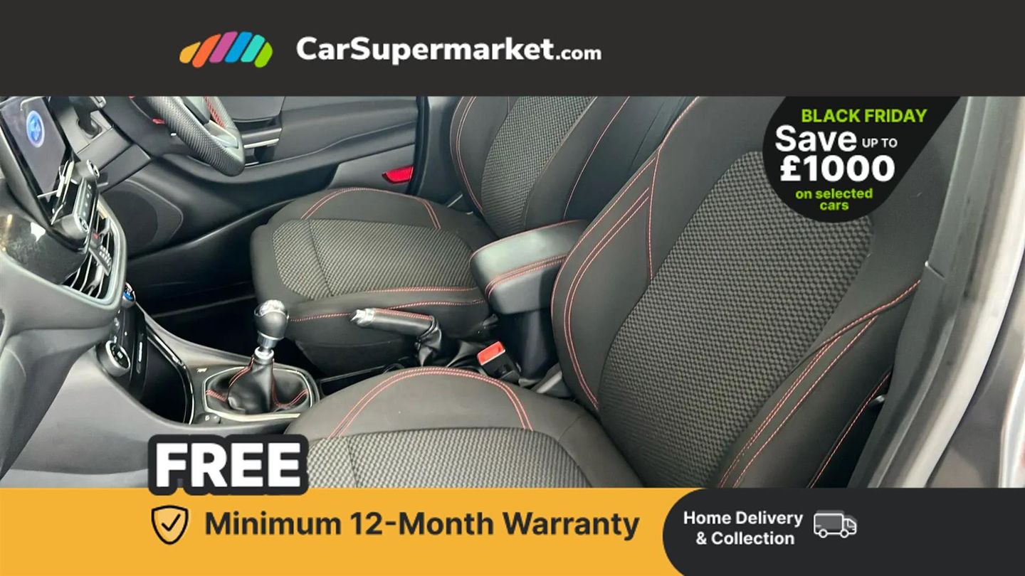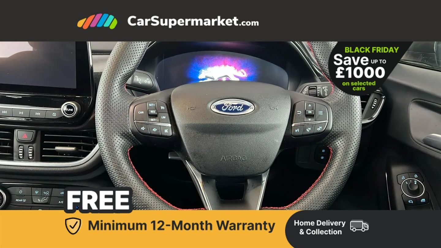Driver impairment monitor,Emergency call service,Ford easy fuel,Full digital 12.3" instrument cluster,Lane keeping aid with lane departure warning,Power assist steering,Power start button,Rear parking sensor,Selectable drive modes(Normal, sport, Eco, trail, slippery),Speed sign recognition,Sport suspension,Automatic headlights with auto high beam,Automatic rain sensing wipers,LED rear lamps,Power foldable heated door mirrors with puddle lamps,Projector headlamps with LED day time running lights and front fog lamps,Quickclear heated windscreen,Rear side wing doors,Rear wiper,ST-Line body styling kit with unique grille and large body colour rear spoiler,Third brake light,3 seat bench in 2nd row,Centre console with armrest and stowage,Ford megabox extended bootspace,Front and rear head restraints,Manual 2 way passenger seat adjustment,Manual 4 way driver seat adjust with lumbar adjustment,Single front passenger seat,ST- Line cloth trim with red stitching,ST-Line flat bottomed sensico leather steering wheel with leather handbrake and aluminium gear knob,Ford SYNC 3 navigation pack - Puma,3 rear seatbelts,Child safety lock,Electronic stability control (ESC) and hill start assist,Pedestrian/cyclist detection & post-collision braking,Pre collision assist with autonomous emergency braking,Tyre pressure monitoring system (TPMS),Thatcham alarm,Magnetic