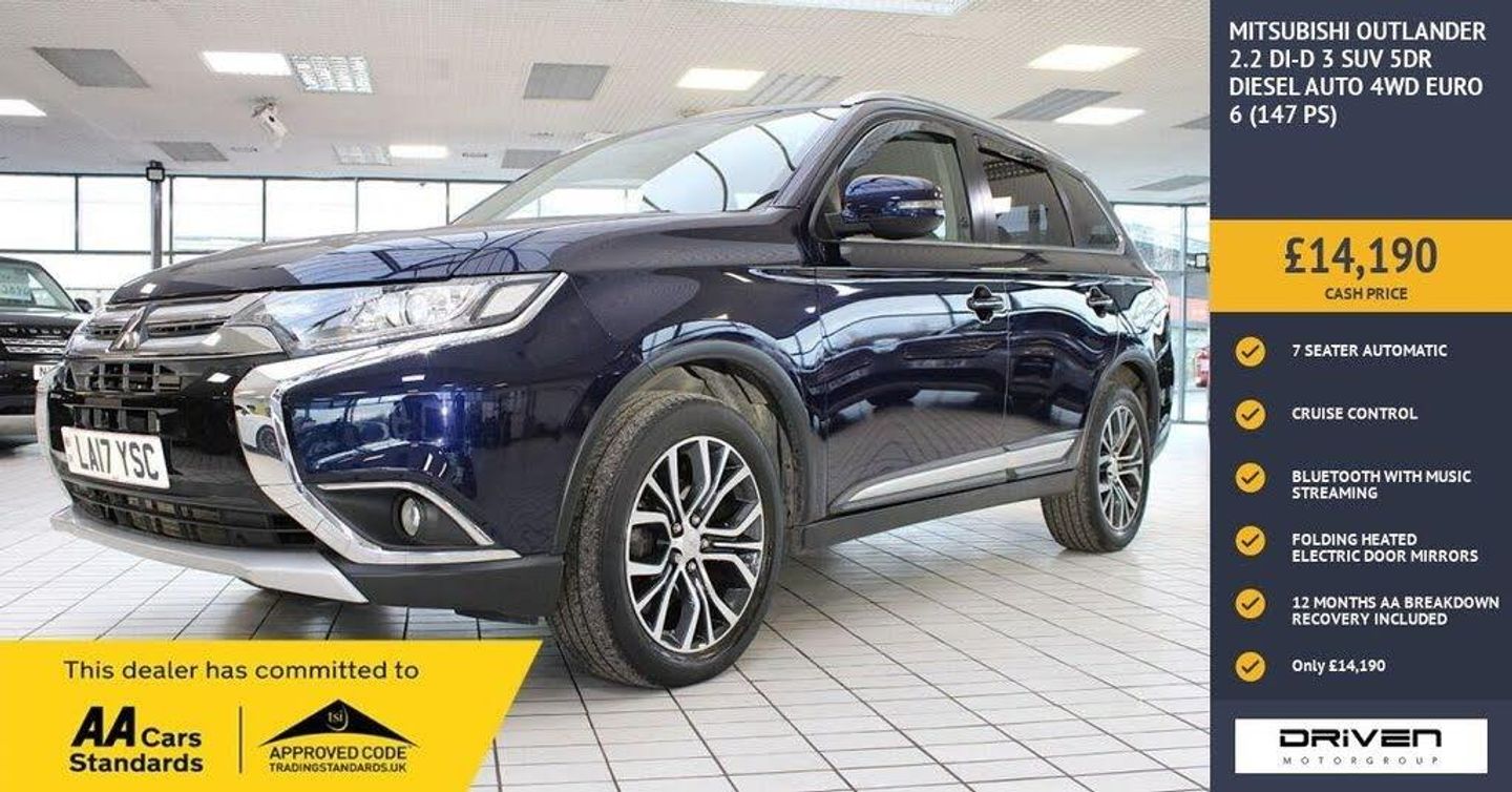 MITSUBISHI OUTLANDER 2.2 DI-D 3 SUV 5DR DIESEL AUTO 4WD 7 SEATER FINISHED IN TANZANITE BLUE AND COMPLIMENTED WITH TWO TONE CHARCOAL INTERIOR, THIS VEHICLE HAS BEEN VERY WELL CARED FOR AND MAINTAINED WITH DOCUMENTED HISTORY PLUS COMPREHENSIVE PRE DELIVERY HEALTH CHECK AND SERVICE COMPLETED PRIOR TO SALE AT 31453 MILES. KEY FEATURES INCLUDE ALLOY WHEELS, CLIMATE CONTROL, ALARM, BLUETOOTH WITH MUSIC STREAMING, CRUISE CONTROL, DAYTIME RUNNING LIGHTS, ELECTRIC HEATED FOLDING DOOR MIRRORS, IMMOBILISER, REAR PARKING SENSORS, PRIVACY GLASS, RADIO WITH MP3 AND RDS, AUTO DIMMING REAR VIEW MIRROR, SPEED LIMITER, STEERING WHEEL AUDIO CONTROLS, RAIN SENSITIVE WIPERS, USB CONNECTOR PLUS MUCH MORE. COMMITTED TO AA CARS STANDARDS: 3 MONTHS OR 3000 MILES WARRANTY INCLUDED WITH AN OPTION TO UPGRADE: 12 MONTHS AA BREAKDOWN RECOVERY INCLUDED: £75.00 CONTRIBUTION TOWARDS YOUR NEXT SERVICE/MOT AT ANY AA CARS STANDARD APPROVED WORKSHOP: WE STAND BY THE QUALITY OF OUR VEHICLES. WITH THE PURCHASE OF THIS VEHICLE, YOU WILL RECEIVE 3 MONTHS OR 3000 WARRANTY, 12 MONTHS AA BREAKDOWN RECOVERY, GIVING YOU ADDITIONAL PEACE OF MIND AND PROTECTION. ALL OUR CARS COME WITH AT LEAST 6 MONTHS MOT AND PRE SALE HEALTH CHECK AND ROAD TEST. OUR PROFESSIONAL TEAM ENSURES YOUR VEHICLE STAYS IN TOP CONDITION, AND YOU ENJOY A HASSLE-FREE OWNERSHIP EXPERIENCE. 4.6 STARS ON GOOGLE WITH OVER 550 REVIEWS: JOIN OUR COMMUNITY OF SATISFIED CUSTOMERS! OUR DEALERSHIP IS PROUD TO HAVE A 4.6 STAR RATING ON GOOGLE, BACKED BY OVER 550 POSITIVE REVIEWS. WE ARE COMMITTED TO PROVIDING EXCELLENT SERVICE AND HIGH-QUALITY VEHICLES. This Vehicle Comes Equipped with High Specification, Which Includes: - Drive this car home with complete confidence and satisfaction: All cars proudly offered by driven group are rigorously inspected, hpi checked and prepared to the highest standard To drive this car home, visit www.drivegroup.co.uk or call 01642-601999 to arrange an appointment with our sales team Please note we do not operate an organised distance selling scheme as defined by the consumer contracts (cancellation, information and additional charges) regulations 2013. Therefore, even if you choose to not view your vehicle at our premises prior to purchase,you will not be entitled to cancel your order under any 14 day cancellation period. All other statutory rights remain unaffected. Whilst every effort has been made to ensure the accuracy of the information contained in this website, please check with us about any item which may affect your decision to purchase. Driven motor group shall not be liable for any errors, inaccuracies or delays in content.