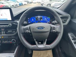 12.3" digital colour instrument cluster, Ford easy fuel, Ford SYNC 3 with 8" TFT LCD touchscreen, App Link, andriod auto/apple carPlay, emergency assistance and navigation with Ford pass connect, Front and rear parking sensors, Hands free power tailgate, Lane keeping aid with lane departure warning, Power assist steering, Rear view camera, Selectable drive modes, Service interval indicator, BO premium audio system with 10 speakers and subwoofer, 2 USB ports, DAB radio/CD, Auto headlamps with high and low beam, Black roof rails, Body colour bumpers, Day/night rear view mirror, Front LED fog lamps, Large rear roof spoiler, LED daytime running lights, LED rear lights, Power folding, electrically adjustable and heated door mirrors with puddle lights, Power front/rear windows with global close, Quickclear heated windscreen, Rain sensing wipers, Rear privacy glass, Rear side wing doors, Rear wiper, ST Line body styling kit with unique front and rear fascia and bumper, rear painted diffuser, front painted skid plates, dark mesh upper grille, ST Line front scuff plates, Third brake light, Twin exhausts, 2nd row sliding seats with 60:40 split, Alloy pedals, Centre console with electronic parking brake, Dark headlining and pillars, Electronic automatic temperature control (EATC), Flat bottomed leather steering wheel in sensico with red stitching, Front and rear head restraints, Partial premium touch Sensico with black cloth inserts and red stitching, Rear centre head restraint, Single front passenger seat, Sports seats, ST Line front and rear floor mats, Engine immobiliser, Keyless entry and Ford power start button (Keyless start), Locking wheel nuts, Remote powered central double locking doors, Thatcham category 1 alarm, Technology Pack, Winter Pack, Luggage Compartment Mat