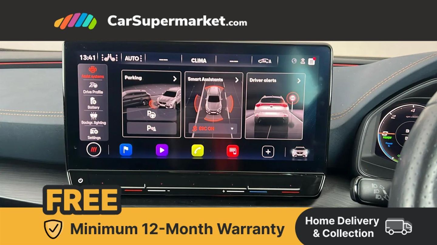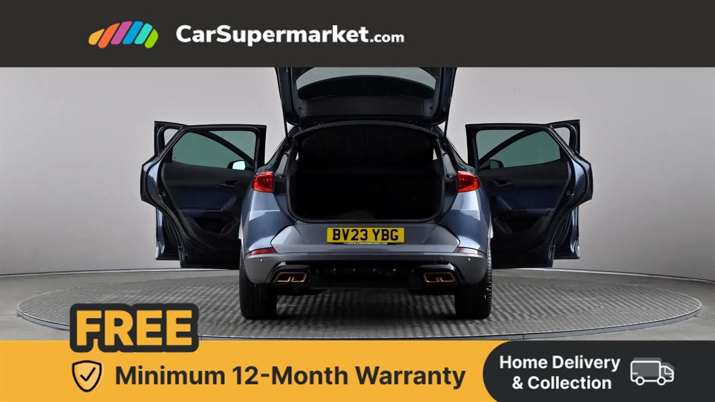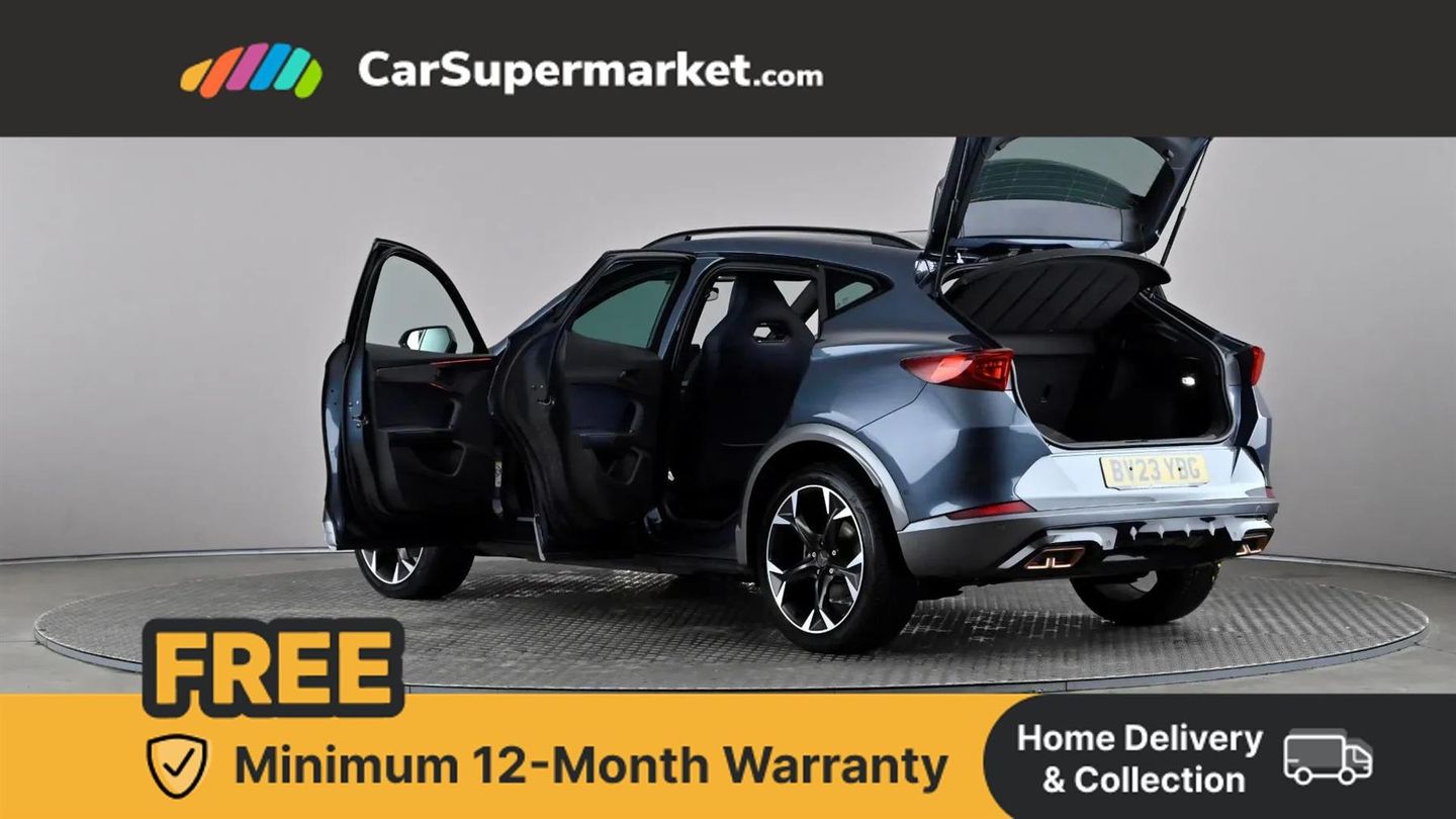 Digital cockpit and configurable dashboard,Driver alert system,Driving profile selection,Forward collision warning with automatic braking,Lane assist,Navigation system with 12'' Touchscreen Display,Park assist (inc front/rear parking sensors),PAS,Predictive adaptive cruise control with speed limiter,Rear view camera,RPM, trip computer, outside temp gauge, instrument light brightness, low fuel warning light, lights on reminder, gearshift indicator,Service interval indicator,Start/stop system with regenerative braking,Voice control system,Wireless apple carplay,Wireless phone charger,10 amp mode 2 charging cable,16 amp mode 3 charging cable,3.6 kw On-board charger,Electronic locking differential and dynamic traction support,Standard suspension,2 front and 2 rear USB type C sockets,6 speakers,DAB radio,Auto dimming rear view mirror,Body colour door handles,Body coloured bumpers,Dark grey wing mirror,Daytime running light with automatic headlight control and coming home feature,Dynamic headlight range control,Electric front/rear windows,Electrically adjustable heated and folding door mirrors with memory function,Front fog lamps with cornering function,Gloss black roof rails and window surrounds,LED Headlights,LED Taillights with dynamic indicator,Rain sensing wipers,Rear diffuser with black simulated exhaust pipes,Rear side wing doors,Rear wash/wipe,Third brake light,Tinted rear windows,Welcome lights,12V socket,2 front and 2 rear reading lights,3 seat bench in 2nd row,60/40 split rear bench seat with armrest and mechanical seat release,Black headlining,Dust/pollen filter,Front and rear head restraints,Front centre armrest,Height/reach adjust steering wheel,Illuminated interior front door sills,Illuminated sunvisor with mirror,Isofix,Leather multi function heated steering wheel with gear shift paddles,Single front passenger seat,Three zone climate control with control panel in rear,Wraparound lighting,Genuine Nappa leather Pack - Cupra,3 point seatbelts on all rear seats,ABS,Brake control system - ESC and brake booster,Child proof door locks,Driver and front passenger airbags with front passenger airbag de-activation,Electronic parking brake,Front and rear disc brakes,Front side curtain airbags,Hill hold control,Public e-call,Seat belt reminder for front and rear seats,Tyre pressure monitoring system,Anti theft alarm system,Keyless entry and start system (KESSY),Locking wheel bolts,Copper and aluminium interior detailing,19" 'Exclusive' machined sport matte black and silver alloy wheels,Tyre repair kit