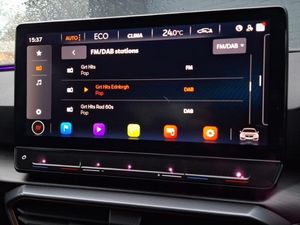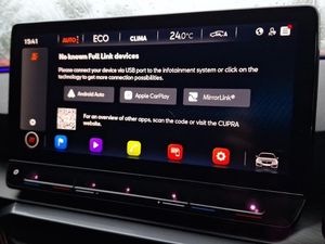 Android Auto, Apple CarPlay, Heated steering wheel, LED daytime running lights, LED Headlights, MirrorLink, Rear parking sensor, Steering wheel audio controls, CUPRA drive profile selection with 4 modes (Comfort/Cupra/Sport/Individual), throttle response and gearshift mode, Digital cockpit, Lane assist, Service interval indicator, Start/stop system with regenerative braking, Black headlining, CUPRA Leather flat bottomed, heated, perforated steering and gearshift paddles, Cupra sports pedals, PVC/Cloth upholstery with copper stitching + Cupra embossed logo on headrest, ABS, Hill hold control, Tyre pressure monitoring system, 19" Machined black and silver alloy wheels with 91Y tyres