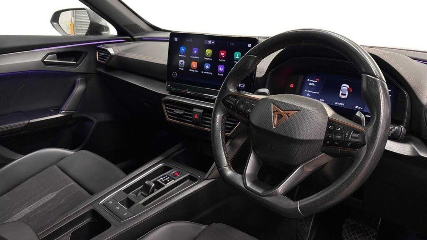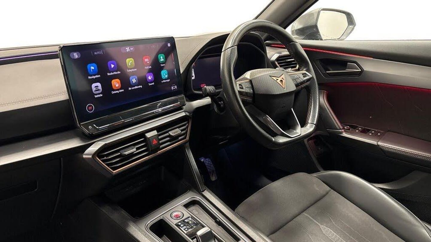 18in Alloy Wheels - Performance Machined Sport - Black and Silver, 12V Socket in Front, 60-40 Rear Seats with Central Armrest and Mechanical Seat Release, ABS - Anti-Lock Braking System, Airbag on Driver and Front Passenger Side with Front Passenger Airbag Deactivation, Anti-Theft Alarm, Auto Dimming Rear View Mirror, Black Sports Seats with Copper Stitching, Breakdown Kit, CUPRA Connect - Safety - Service - Remote and Online, Charging Cable - Mode 2 - 10amp, Charging Cable - Mode 3 - 16amp, Copper and Aluminium Interior Detailing, Daytime Running Lights with Automatic Headlight Control and Coming-Leaving Home Lights, Digital Cockpit and Configurable Dashboard, Door Mirrors Electrically Adjustable - Folding and Heated, Driver Alert System, Driving Profile Selection, Dynamic Headlight Range Control, Electric Window - Front, Electronic Locking Differential with Dynamic Traction Support, Electronic Parking Brake, Forward Collision Warning with Automatic Braking, Front Centre Armrest, Front Fog Lights with Cornering Function, Front Side Curtain Airbag, Front and Rear Head Restraints, Gloss Black Roof Rails and Window Surrounds, Headlining - Grey, ISOFIX, Illuminated Interior Front Door Sills, Illuminated Sunvisor with Mirror, Interior Ambient Lighting, Kessy - Keyless Entry and Start, LED Headlight, LED Taillights with Dynamic Indicator, Lane Assist, Leather Multi-function Steering Wheel - Heated with Gear Shift Paddles, Leather Multifunction Steering Wheel, Locking Wheel Bolts, Manually Adjustable Height and Lumbar Support for Front Seats, Navigation System, Power Steering, Predictive Adaptive Cruise Control with Speed Limiter, Rain Sensing Wipers, Reading Lights - 2x Front - 2x Rear, Rear Diffuser with Black Simulated Exhaust Pipes, Rear Parking Sensors, Safety and Driving Pack M, Seat Belt Reminder, Three Zone Climate Control with Control Panel in the Rear, Tinted Rear Windows, Tyre Pressure Monitoring System, USB Type C x4 - x2 Front and x2 Rear, Welcome Lights, Wireless Phone Charger