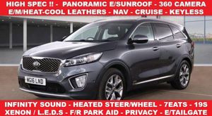 HIGH SPEC - TOP OF THE RANGE KX-4 MODEL + PRACTICAL VERSATILE AND SPACIOUS 7 SEAT, 4WD SUV + 2.2 CRDI TURBO DIESEL (197 BHP) + AUTO-TIPTRONIC + ECO-NORMAL-SPORT DRIVING MODES + 1 PREVIOUS KEEPER + DOCUMENTED SERVICE HISTORY RECORD, 7 SERVICES PERFORMED + COMES WITH 12 MONTHS MOT AND ENGINE OIL SERVICE + GRAPHITE METALLIC PAINTWORK AND FULL BLACK PERFORATED LEATHER UPHOLSTERY + ELECTRIC-MEMORY-HEAT-COOL FRONT SEATS AND HEATED REAR SEATS + EASY EXIT DRIVER'S SEAT MEMORY + HIGH GLOSS PIANO BLACK INTERIOR TRIM WITH CHROME HIGHLIGHTS + E-TILT / SLIDE PANORAMIC SUNROOF WITH E/SUNBLIND + XENON HEADLIGHTS WITH JET WASH AND LED DAYTIME RUNNING LIGHTS + STOP-START + SPEED SIGN ASSIST + 360 CAMERA- REVERSE CAMERA- FRONT CAMERA- SIDE CAMERAS AND FRONT-REAR PARKING AID PLUS AUTO PARALLEL PARK ASSIST + BLIND SPOT MONITOR + DIFFERENTIAL LOCK + HILL DESCENT CONTROL + TRACTION CONTROL + AUTO HOLD BRAKES + 19 INCH ALLOYS + PRIVACY GLASS + WINDOW BLINDS + ROOF RAILS + ROOF SPOILER + KEYLESS ENTRY-LOCK-START + SATELLITE NAVIGATION + BLUETOOTH + DRIVING ASSIST + LANE KEEP ASSIST + ADAPTIVE CRUISE CONTROL + INFINITY SOUND SYSTEM + DAB RADIO-CD-DVD PLAYER-AUX-USB + MULTI-ZONE CLIMATE CONTROL- AIR CON + REAR A/C AND VENTILATION + HEATED MULTIFUNCTIONAL LEATHER STEERING WHEEL + P/STEERING + REMOTE C/LOCKING + E/WINDOWS + POWER FOLDING E-MIRRORS + AUTO- LIGHTS, WIPERS, DIMMING REAR VIEW MIRROR + ALARM-IMMOBILISER + 12V SOCKETS + ISOFIX + TYRE PM + ILLUMINATED DOOR SILLS + E/TAILGATE + DETACHABLE TOWBAR ++++ PART EXCHANGE WELCOME +++ 3, 6, 12 MONTHS WARRANTIES AVAILABLE +++ DELIVERY POSSIBLE NATIONWIDE (ASK FOR QUOTE) +++ WE ARE 'FCA' APPROVED AND CAN ARRANGE IN HOUSE FINANCE +++ Every effort has been made to ensure the accuracy of the above vehicle's information but errors may occur. Please check with a salesperson any details that are important to you and may influence your decision whether to buy or not, thank you