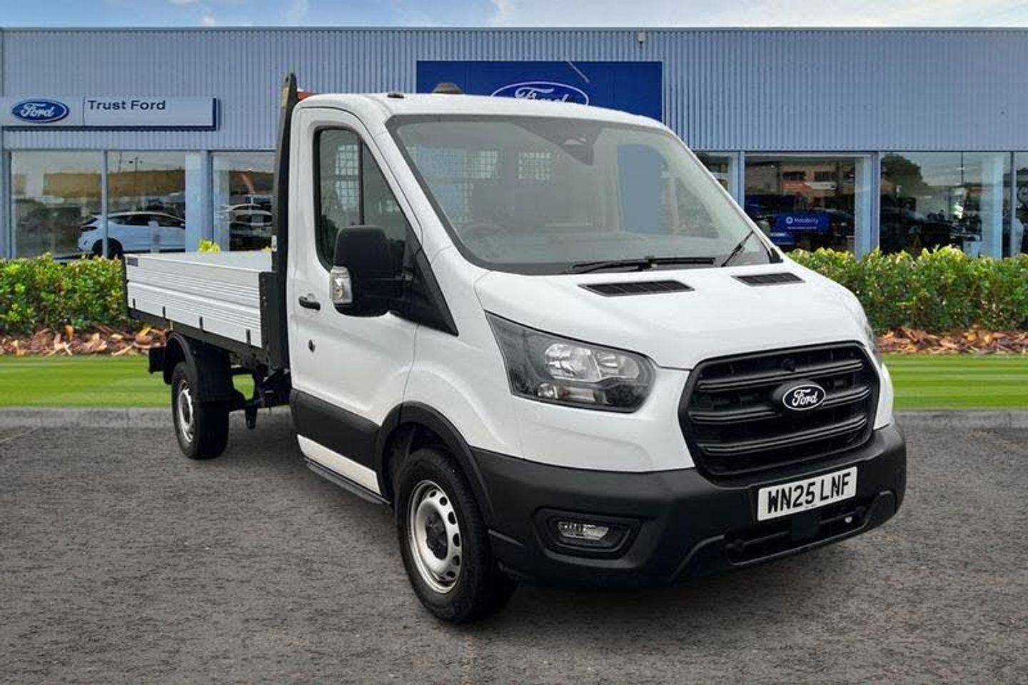 REAR VIEW CAMERA shows whats behind you on a screen in front of you on the dashboard - the system activates when you select reverse gear and using virtual guidelines can help you park, QUICKCLEAR HEATED WINDSCREEN uses ultra thin filaments that superheat to de-ice and de-mist your windscreen as well as help de-freeze the wipers and works in seconds, HILL START ASSIST temporarily stops you rolling backwards or forwards when making a hill start - maintaining pressure to the braking system for an extra 25 seconds giving you more time and control as you move your foot from the brake to the accelerator, BLUETOOTH HANDS FREE WITH VOICE CONTROL allows you to operate both your mobile phone and Ford audio system - controlling several functions using a set list of simple voice commands, CRUISE CONTROL provides extra comfort on longer journeys allowing you take your foot off the acceleration whilst just focusing on steering the vehicle, Recirculation heater, Centre console, Warning lights, Key operated bonnet release, Reach and rake adjustable steering column, Powder coated white aluminium sideboards and tailboards with auto rear tip feature, Audio controls mounted on steering wheel, 2 x 12V power outlets, Part body colour front bumper, Front door map pockets, Hill start assist, Gearshift indicator light, Daytime running lights, Rope hooks, Low roof line, Electronic dynamic cornering control, Emergency brake assist, Roll stability control, Side wind mitigation, Tablet holder, Intelligent Speed Assist, Emergency assistance, Visible Vehicle Identification Number (VIN), Overhead console, Vehicle maintenance monitor, Emergency brake warning, Rear fog lamps, Electronic Stability Control (ESC), Tyre pressure monitoring system, Curve control, Rear axle Alt A - Narrow track, Electric power assisted steering (EPAS), Driver one touch up/down power windows, Driver and passenger seatbelt reminder, Non limited slip differential front axle, 4 Front speakers (2 woofers and 2 tweeters), Brakes - ESP/HLA/FBS, Day/Night inside mirror, Quad beam headlamps, Complete tinted glass, Collision mitigation system, Unperforated cab back panel, Wireless Apple CarPlay and Android Auto, Wrong way alert, Driver's airbag, Start/stop system, Less load compartment loops, Multi stage vehicle, Multi channel door entry remote, Exhaust exit behind muff down, 8 Part digital instrument cluster, Adaptive front lighting system, Front axle rating - 1850KG, Door mirrors - Blind spot eliminator and integrated side indicator, Self colour door handles, Self colour front grille, Halogen projector headlights, Automatic on/off headlights, Front independent MacPheron struts, linear rate coil springs, stabiliser bar, gas pressured shock absorbers and rear leaf springs, Battery - Cold start function (-20 degree C), Twin, 2 litre bottle capacity, fascia mounted bottle holder, Driver's side storage compartment on facia top, Underseat storage compartment (Under dual passenger seat), Roof mounted fin antenna, Header mounted courtesy lights front with theatre dimming, 2-way head restraints on front seats, Automatic front wipers with rain sensor, 4-Spoke Polyurethane steering wheel, Sngle fuel tank - 70 Litres, Ford Easy Fuel capless refuelling system with misfuel inhibit, AdBlue aftertreatment system - 24 Litre, Anti-lock braking system (ABS) with electronic brake-force distribuition (EBD), Load adaptive control, Front passenger's airbag including airbag deactivation switch, Front side and curtain airbags, 3-point diagonal inertia reel seatbelts for all front seats, Driver seatbelt pre-tensioner, Immobiliser - Safeguard passive anti-theft system (PATS), Audio mis-lock feedback, audible signal if a door is ajar when locking activated, Auto locking on drive away, doors automatically lock at 5 mph, Remote control central locking with 1 key fob, Power central locking, Dual circuit front and rear discs with self adjusting servo assistance, Cab easy clean rubber floor covering, Cab moulded he