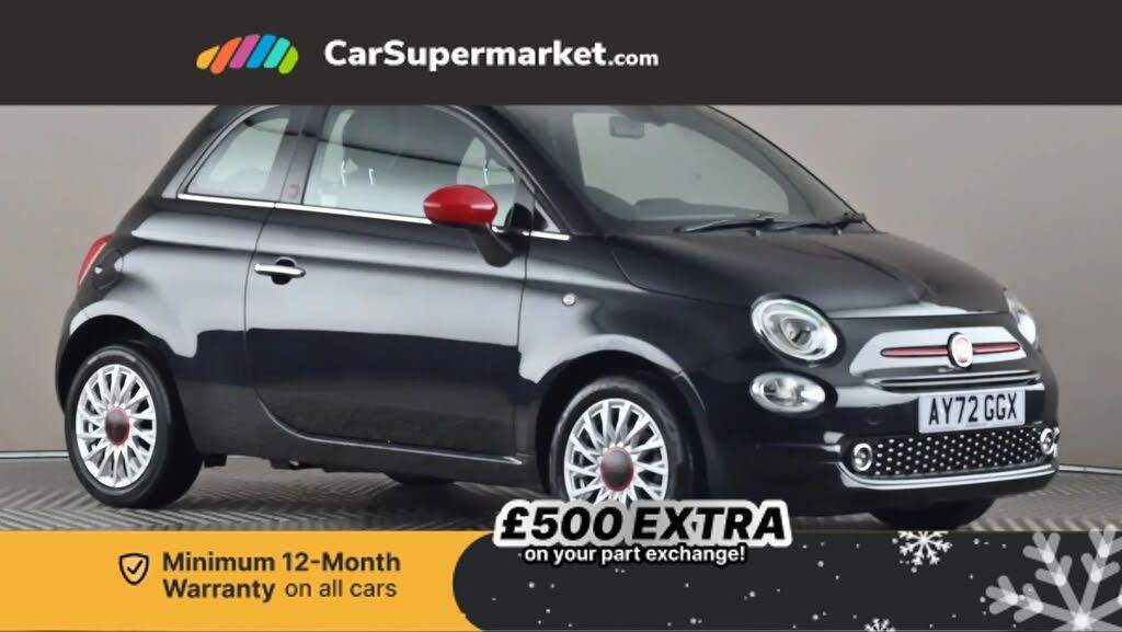 Apple car play/Android Auto,Cruise control,E-call,External temperature gauge,Power assist steering,Rear parking sensor,Speed limiter,Stop/start system,Trip computer,4 speakers,7" HD Touchscreen Radio, Bluetooth, USB and DAB,Rear speakers,3rd brake light,Auto headlights,Body colour bumpers,Chrome plated exterior door handles,Dusk and rain sensors,Electric front windows,Electrically adjustable and heated door mirrors,Fixed glass sunroof with sunblind,Front fog lights,Halogen headlamps,Heat insulated glass,Heated rear windows with wash wipe,LED daytime running lights,Rear side wing doors,Rear wiper,Red logo on B-Pillar,Unique exterior red finished door mirror covers,Unique exterior red finished front logo and moustache,Unique exterior red finished wheel centre hubcaps,1 passenger grab handle,2 seat bench in second row,50/50 split folding rear seats with height adjustable rear headrests,Air conditioning,Auxilliary 12V power socket,Chrome kit,Fabric upholstery with red detailing,Front headrests,Height adjustable drivers seat,Height adjustable steering wheel,Isofix child seat preparation,Single front passenger seat,Techno leather steering wheel with audio controls,Red kit pack - 500/500C,7 airbags - Driver, passenger, side, window and drivers knee airbags,ABS/EBD,ESC + ASR/MSR + HBA + Hill holder,Passenger airbag deactivation system,Traction control,Tyre pressure monitoring system,Automatic door locking,Immobiliser,Locking fuel filler cap,Remote central locking,15" Alloy wheels,Crossover Black,Fabric - Black with Black Ambience