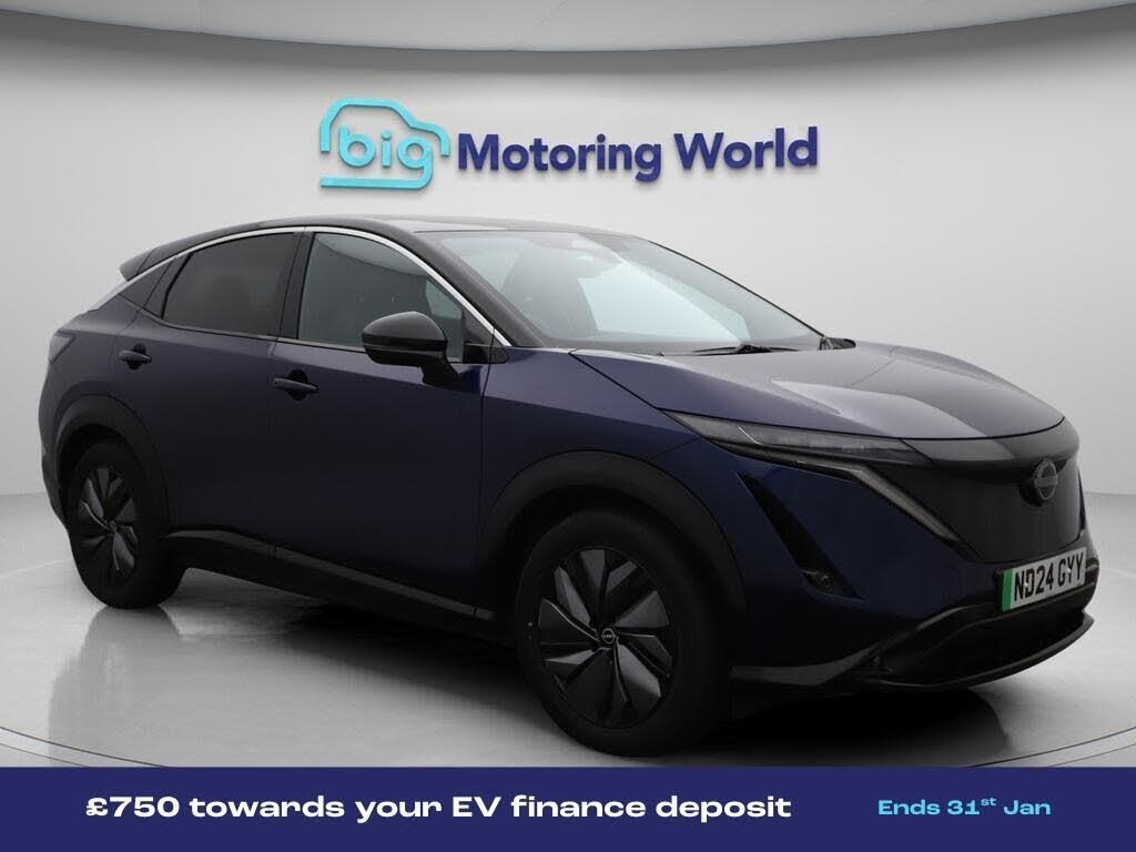 £750 towards your finance depo-Our Nissan ARIYA is finished in Blue. Specification includes a range of fantastic features including £750 towards your finance deposit, Part Leather Seats, Satellite Navigation, Privacy Glass, Heated Seats, Heated Windscreen, Rear View Camera, Heated Steering Wheel, Bluetooth, Blind Spot Assist Specification information is supplied by CAPHPI and may vary to the actual car. This data does not form any part of a buying contact. Please check specification prior to purchase in-store. The MOT is valid until June 2027, visit bigmotoringworld.co.uk for more photos, a 360 tour, service history and a free HPI report.Were BIG on peace of mind and this Blue Nissan ARIYA has completed our comprehensive 200 point inspection and passed all checks. Its ready for you to drive away with immediate collection in-store. We include a 90-day warranty as standard plus an option to extend for up to 3 years.Reserve this car exclusively for you, safely and securely at bigmotoringworld.co.uk, with a fully refundable £99 deposit. Test drive before you buy, with no commitment, no hassle and a completely haggle free experience. Still searching and want to see thousands more cars? We are BIG on choice with over 8000 cars to choose from.Visit our award winning web site bigmotoringworld.co.uk.Were Big Motoring World and were BIG on what matters to you.