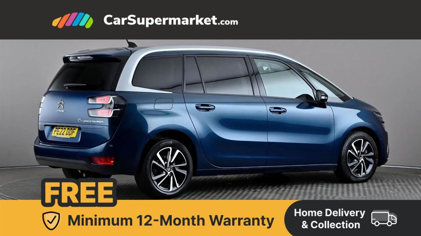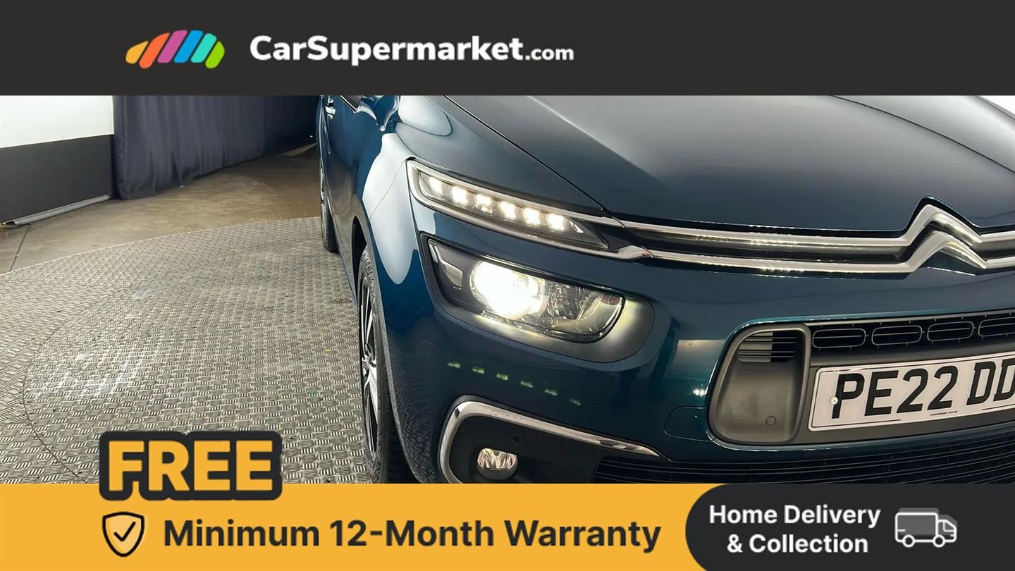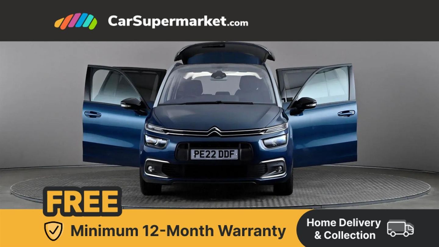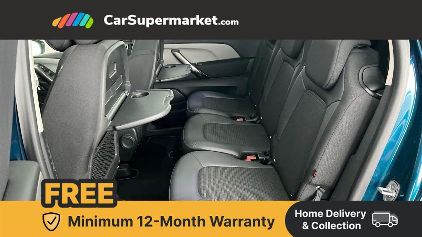 12" Panoramic HD central display,7" Touch drive interface,Active cruise control with speed limiter and braking function,Active lane departure warning system,Audible lights on warning,Citroen connect box emergency assist system,Citroen Connect Nav,Coffee Break Alert,Driver attention alert system,Electric power assisted steering,Find my car feature,Forward collision warning,Front parking sensor,Mirror screen with Apple CarPlay and Android auto,Park assist and blind spot monitoring (with LED alert on door mirrors),Rear parking sensors,Reversing camera,Service indicator,Speed limit recognition and recommendation,Trip computer,Bluetooth handsfree and media streaming with USB socket,DAB Digital radio,RDS radio with 6 speakers and Aux socket,Steering wheel mounted controls,3D effect LED rear lights,Aluminium front sill scuff protectors,Aluminium side profile with integrated roof bars,Auto dimming electrochrome rear view mirror,Automatic activation of hazard warning lights,Automatic lights and windscreen wipers,Black electrically heated, folding and reverse dipping door mirrors with LED courtesy light,Body colour bumpers,Body colour painted door handles,Chrome lower front bumper insert,Dark tinted side windows and rear windscreen,Double xenon headlights,Foot operated motorised tailgate,Front and rear electric windows with anti pinch and one touch operation,Front fog lights,High level LED brake light,Intelligent beam headlights,LED daytime running lights,LED front indicators,Panoramic athermal windscreen with sliding interior sun blinds,Panoramic glass sunroof with dark tinted glass/electric sunblind,Rear fog lights,Rear side wing doors,Rear wiper,Windows total closure mode,12 volt accessory power socket in central storage compartment,8 lashing eyes in boot,Air vents for row 2 rear seat passengers,Automatic digital dual zone air conditioning,Black panel on/off instrument lighting,Boot light,Child observation mirror,Cup holders,Driver and front passenger seats adjustable armrests,Driver/passenger sunvisors and vanity mirrors,Fabric load cover (parcel shelf),Fixed centre storage box with sliding lid,Fold-down aircraft style tray tables (integrated into back of front seats),Front and rear courtesy reading lights,Front door pockets with bottle holders,Front headrests,Height adjustable front passenger seat,Height and reach adjustable leather steering wheel with control zones,Height/tilt adjustable driver's seat,Illuminated and ventilated glove box,Illuminated central storage compartment (housing USB and 12 volt connection),Integrated retractable rear side window sun blinds,Ondulice cloth/leather upholstery with hype grey ambience,Rear underfloor storage [row 2],Seats with individual sliding fore/after adjustment in row 2,Single front passenger seat,Storage under driver's seat,Three individual full size seats with adjustable recline angle and retractable headrests in row 2,Three ISOFIX mounting points with top tether on all row 2 rear seats,Two individual seats with retractable headrests in row 3,ABS with Electronic brakeforce distribution and Emergency braking assistance,Active safety brake,Automatic electronic parking brake,Driver, front passenger, front lateral and curtain airbags,Electronic Stability Control (ESC) with intelligent traction control (auto re-activation 30mph+),Five 3 point inertia reel seat belts,Front inertia reel seatbelt with pre-tensioners and force limiters,Hill start assist function,Manual child lock in rear doors,Mono-tone horn,Passenger airbag deactivate switch,Tyre under inflation indicator,Unfastened seatbelt visual warning system on all seats + audible warning for driver/front passenger (front passenger presence detection),Immobiliser,Keyless entry and start,Perimetric and volumetric anti theft alarm,Remote central locking + deadlocks,Aluminium dashboard trim and air vent surrounds,17" Shamal diamond cut alloy wheels
