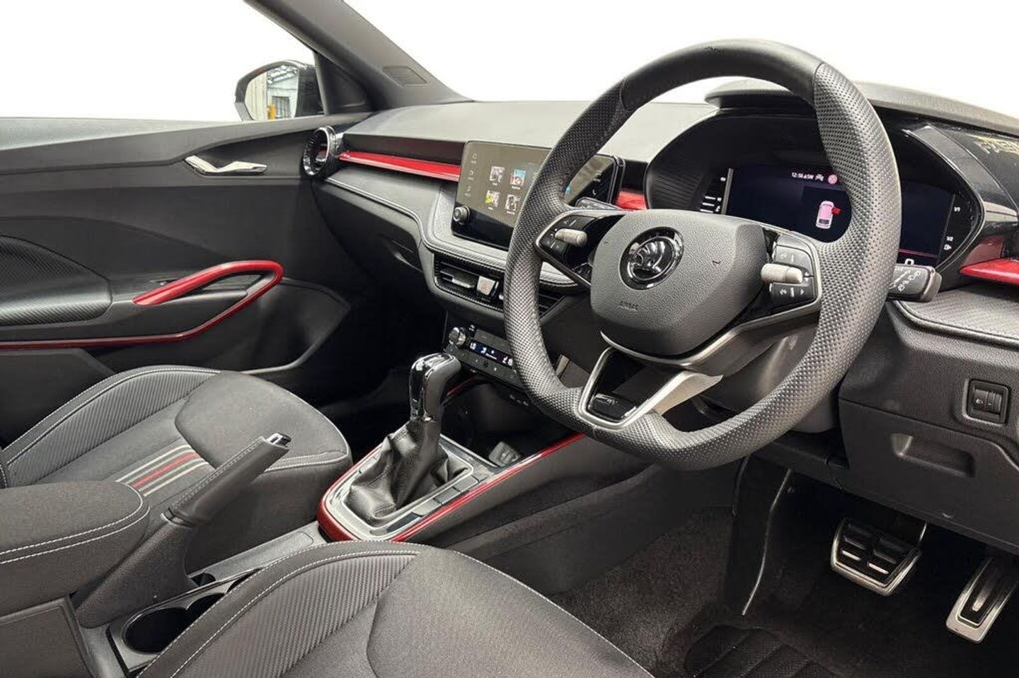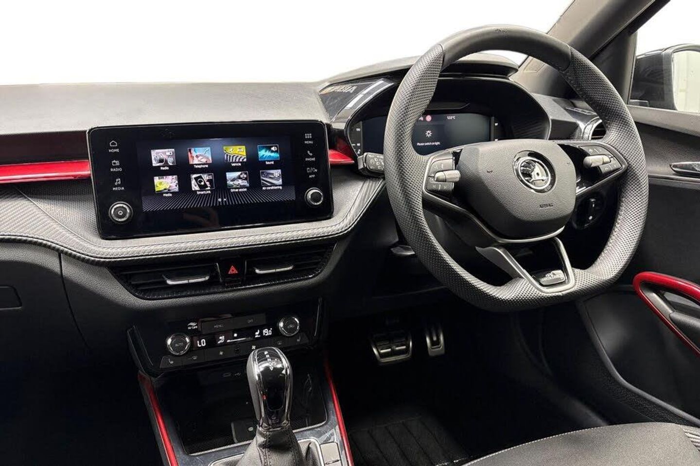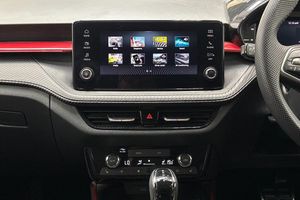 Advanced driver attention and drowsiness monitor, Bluetooth connection, Electromechanical power steering, Exterior temperature gauge, Service interval indicator, Traffic sign recognition, Virtual cockpit with 10.25" colour display, Wireless SmartLink for Apple CarPlay and Android Auto, 6 Speakers (4 in front and 2 in rear), Auxiliary socket for external MP3 player, DAB digital radio reception, Auto dimming rear view mirror, Black radiator grille, Body coloured bumpers, Door mirror integrated indicators, Front and rear electric windows, Front window wiper intermittent control, Headlight range control - Automatic, Ice scraper in fuel cap, LED daytime running lights with coming and leaving home feature, LED rear lights, Monte Carlo badging, Privacy glass, Rear LED fog light, Rear side wing doors, Rear window wiper with washing nozzles, Roof mounted spoiler, SKODA tailgate lettering in black, Sports bumpers, Third brake light, 2 reading lights in front and 2 reading lights in rear, 3 rear headrests, Aluminium pedals, Backrest split and folding, Black headlining, Central console with removable cup holder and storage box, Chrome handbrake release button, Door sills with fabia badging, Dual zone air conditioning with climatronic electronic control, Fabric/artificial leather upholstery, Front centre armrest, Front sports seats, Gearshift knob/handle in leather, Hand brake lever handle in leather, Height adjustable front headrests, Height adjustable front seats, Height adjustable steering wheel, ISOFIX and TopTether anchorage points to the outer rear seats, ISOFIX and TopTether on the front passenger seat, Luggage compartment lighting, Manually adjustable lumbar support in front seats, Metallic painted red central console cover, Metallic red interior door handles, Pollen filter, Rear seat bench unsplit, Single front passenger seat, Sun visors with mirror and airbag label on passenger side, Textile floor mats, Ticket holder, Umbrella in drivers door, 3-point height adjustable front seats belts with pretensioner and force limiter, Automatic warning lights in case of crash, Driver and passengers airbag with switch off function, e-Call+, ESC including ABS, MSR, ASR, EDS, HBA and XDS, Front and rear seat belt warning, FRONT ASSIST (AEB City and AEB Inter Urban), Front side airbags, Head airbags, Hill hold control, One tone horn, Pedestrian protection, Three rear 3-points safety seat belts with pretensioner and force limiter including stop function for outer rear seat belts, Tyre pressure monitoring system, Anti-theft alarm system including immobiliser, interior monitoring, backup horn, and towing protection, Central locking with radio remote control, interior controls, SAFE function and 2 foldable keys, Carbon effect door and side trim panels, Carbon effect lower decorative trim with white stitching, Monte carlo air vents, Red metallic upper decorative trim, Anti-theft wheel bolts protection, Super-low rolling resistance tyres