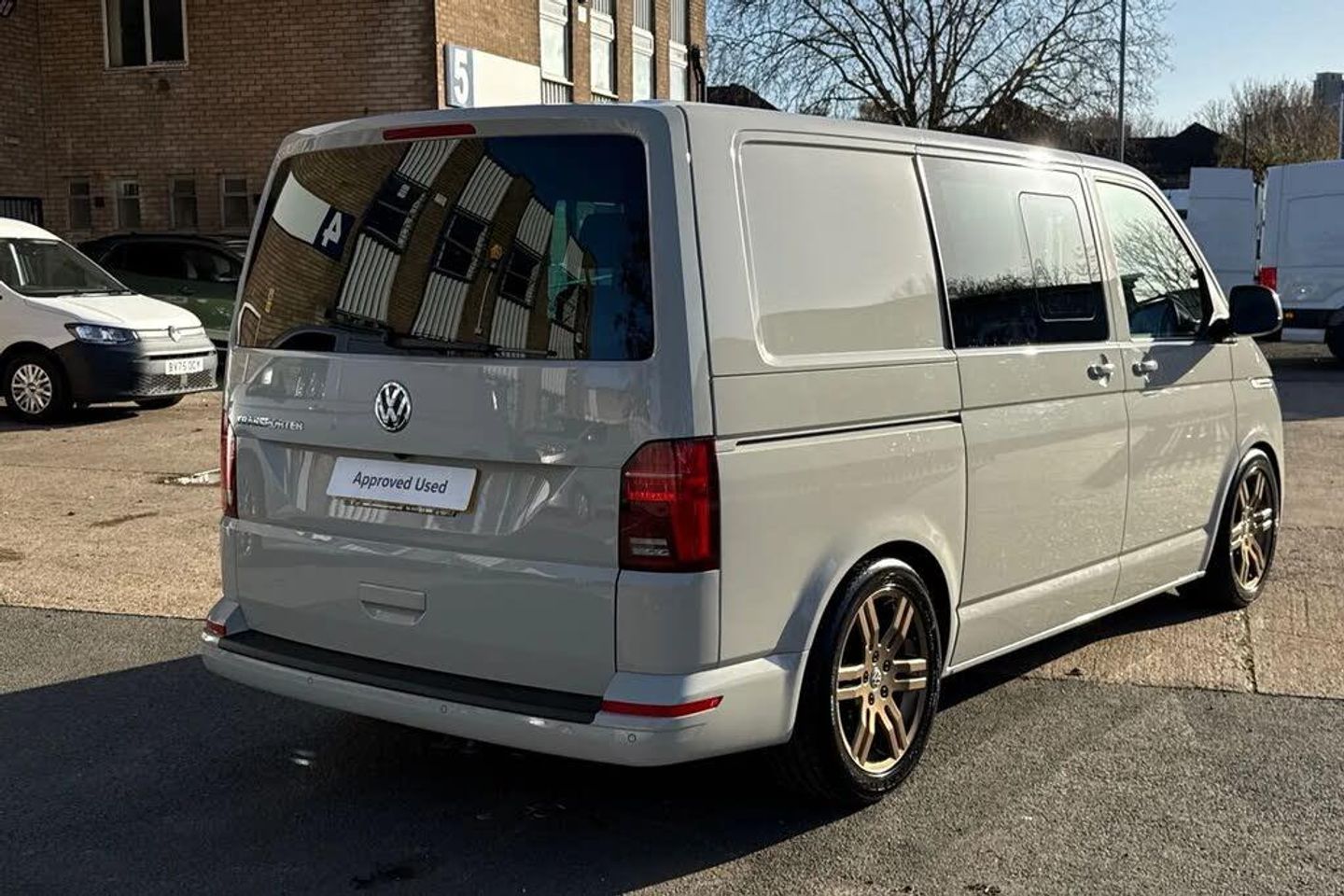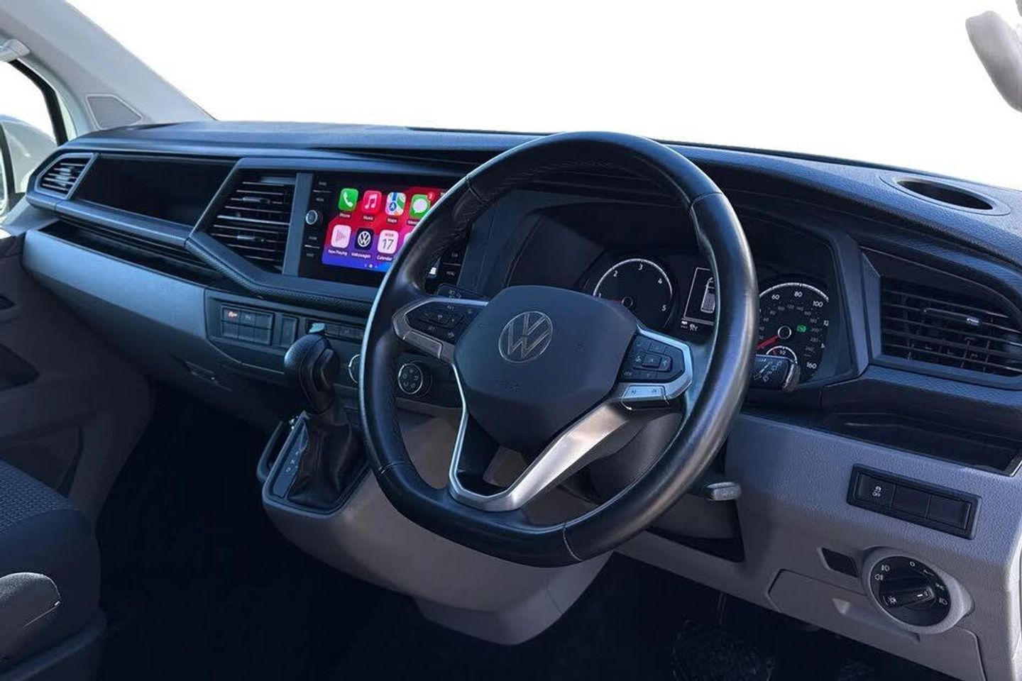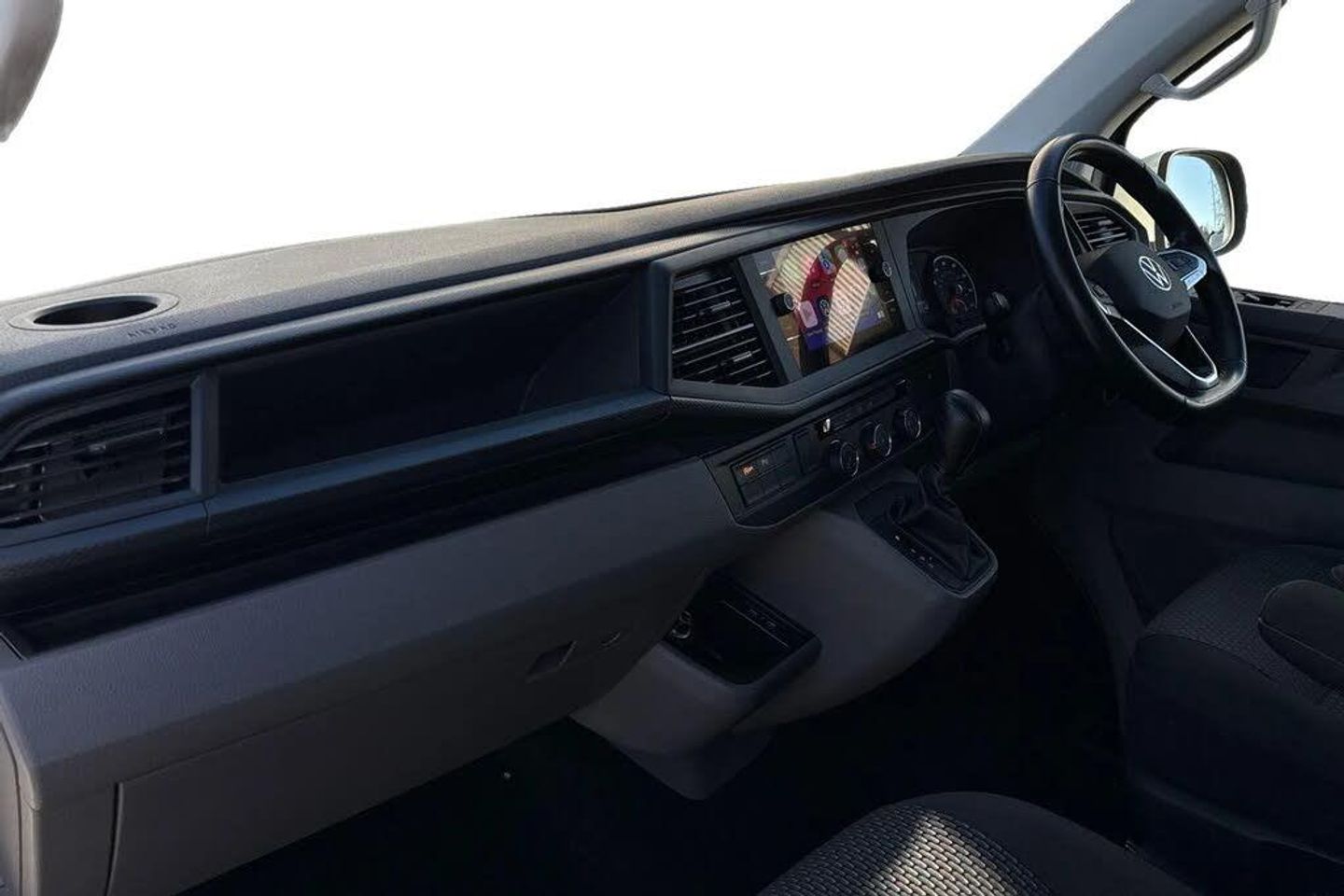 Ascot Grey-Solid paint,LED headlights with LED daytime running lights,Rear combination lamps,Adjustable suspension,Parking sensors front + rear,Rear view camera system,Twin sliding side load doors,Tailgate with heated rear window and wash wipe system,Adaptive cruise control,Leather trimmed,multifunction steering wheel,Lights + Vision package,2 bench seats on driver side and individual seat with easy entry on the passenger side in 2nd row seats,Passenger side swivelling seat,Fully insulated/sound deadening/carpet lined to rear,2 remote control folding keys,Thatcham category 1 cab alarm system,Solid - Ascot Grey,Bricks woven fabric - Titanium/Palladium black,18" VW Sportline alloy wheels in bronze,Steel spare wheel with original equipment tyre,Green heat insulating glass,Heated laminated windshield,Privacy glass in passenger compartment,Rear window with heated insulating glass,heated rear window wiper and washer system,Windshield wiper intermittent control with rain sensor for windshield wipers,16" chassis with 16" brake system,Radiator grille with 2 chrome trims,Transporter nameplate on the rear fender,Without adhesive film,Automatic headlight control,leaving home and manual coming home feature,Front fog lamps with cornering light,Illuminated steps in passenger/load compartment,Electronic stability control,ABS,ASR with deactivation button,electronic differnetial lock,hill start assist and brake assist system,Start/stop system with regenerative breaking,Adaptive cruise control including speed limiter and city emergency braking,Cross wind assist,Electromechanical speed sensitive power steering,height and longitudinally adjustable steering column,Front assist with autonomous emergency braking,Left convex exterior mirror,Power adjustable and heated,power folding,folding possible via vehicle key exterior mirrors,Right convex exterior mirror,3 point height adjustable seat belts on outer seats cab with electric pretensioners,Driver and front passenger airbag with front passenger airbag deactivation,Power operated child safety lock,Single tone horn,Warning buzzer and light for driver seat belt not fastened,Mobile phone interface,Without voice control,2 USB interfaces type C in dashboard,4 speakers with 2 tweeters and 2 woofers,Composition colour radio with 6.5" touchscreen,Digital radio reception (DAB+),Volkswagen app connect,Tailgate closing with unlatching from the inside,Tailgate with window aperture,Dimmable illuminated instruments,Driver alert with black and white multi function display plus,Headlight range control,Child seat anchors ISOFIX and top tether in 2nd row of seats,eCall emergency system,Forward collision warning front assist with autonomous emergency braking,70 L volume fuel tank,Diesel particulate filter,Dust/pollen filter,3 spoke leather wrapped multi function steering wheel,Additional sound deadening measures in cab and passenger compartment,Auto dimming breakaway interior rear view mirror,Comfort headliner in cab,hardboard roof trim in passenger and load compartment,Folding grab handles and storage compartments on cab seats,reading light,Glove compartment with illumination,Heavy duty tool kit and jack,Medium height for vehicles with window aperture hardboard side trim panels in passenger/load compartment,Refrigerant R134a,Rubber floor covering in passenger/load compartment with loading edge protection in rear,Standard lower part dashboard in palladium,Without partition,LED Interior lighting in load and passenger compartment,Interior plastic loading edge protection,Lashing rings for load restraint system,Comfort pack - Transporter,Exterior pack without fog light- Transporter,Non smoker pack - Transporter,Armrests for both front seats,Front seats on the right in 1st row of seat,Without seats in 3rd row of seats,Anti theft alarm system with interior monitoring in cab,backup horn and towing protection,Lockable wheel bolts