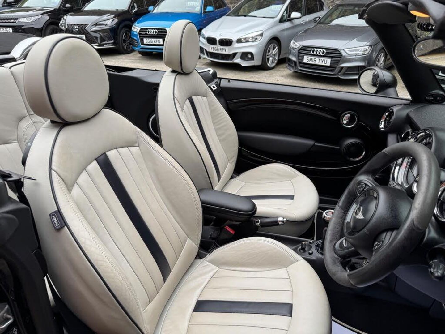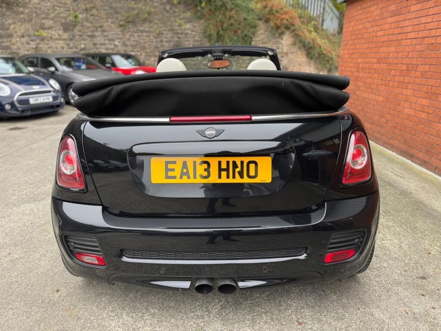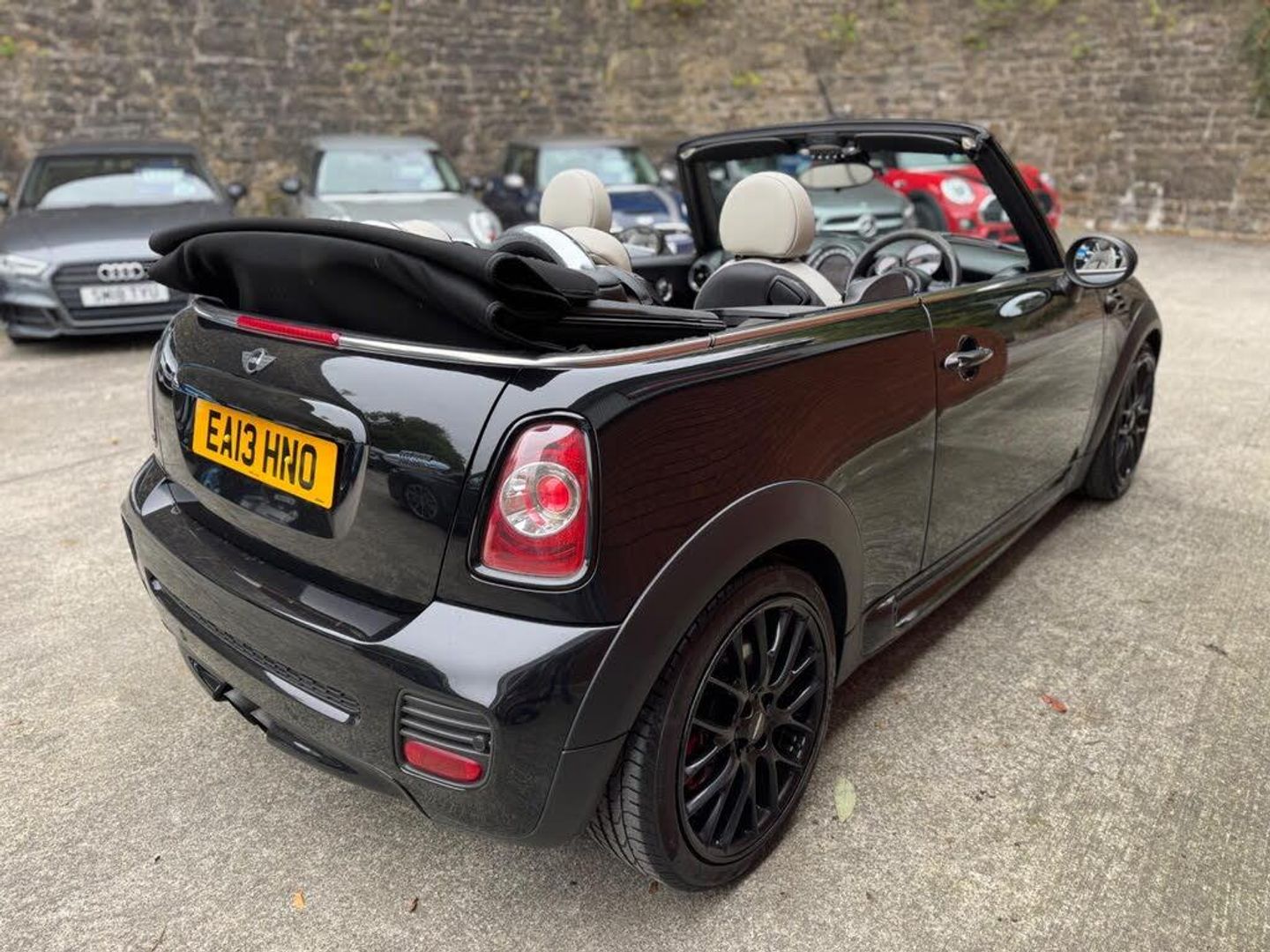 17in Alloy Wheels - Light Cross Spoke Challenge, 3rd Brake Light, 6 Speakers System, ASC+T - Automatic Stability Control and Traction, Additional Decor Rings, Air Conditioning - Manual, Airbags - Driver, Airbags - Front Passenger, Airbags - Front Passenger with Deactivation Switch, Airbags - Front Side, Airbags - Head, Alarm - Thatcham CAT1, Anti-Lock Braking System - ABS, Automatic Door Window Lowering by Approx 6mm When Door Opens, Aux-In Connection, Body Coloured Fuel Filler Cap in Rear Right Side Panel - Linked to Central Locking, Brake Assist, Brake Energy Regeneration- iGR, Brake Force Display, Brake Pad Wear Indicator, CBC - Cornering Brake Control, Car Jack, Central Locking - Remote, Child Seat ISOFIX Attachment, Cooled Glovebox, Crash Sensor - Fuel Cut-Off, Crash Sensor - Hazard Warning Flashers and Interior Light, Crash Sensor - Unlocking Doors, Cupholders - Front x2 - Rear x1, DAB Tuner, DTC - Dynamic Traction Control, Decorative Rings Surrounding Dashboard Instruments, Door Handles - Chrome Plated, Door Handles - Interior - Chrome Plated, Door Mirrors - Electrically Adjustable, Door Mirrors - Heated, Door Sill Finishers - Black Line Look, Dynamic Stability Control - DSC, EBD - Electronic Brake-Force Distribution, EDLC - Electronic Differential Lock Control, Easy Load Function, Electric Windows - Front - One Touch Up and Down, Electronic Power Steering - Speed Related, Electronic Vehicle Immobiliser, Embellisher at Bottom Edge of All Windows - Chrome Plated, Engine Scoop in Body Colour, Exhaust Tailpipe - Visible Double Central Stainless Steel Diameter 85 mm, External Visible VIN, Floor Mats - John Cooper Works Design with Red Piping, Floor Mats - Velour, Footrest in Stainless Steel, Front Fog Lights, Gearshift-Selector Lever and Handrake Lever Gaiters in Sensatec, Glovebox - Lockable, Halogen Lights for Low Beam and High Beam Headlights, Handbrake-lever grip - plastic with chrome plated handbrake push button, Headlight - Beam-Throw Control Electrical with Manual Adjustment, Headlights - Chrome Bezels, Headlights - Follow Me Home, Headrests For All Seats - Manually Adjustable, Heated Front Windscreen Washer Jets, Heated Rear Window with Automatic Deactivation, Heater with Mechanical Control and Recirculating-Air Button, Hill Assist, Interior Lighting Integrated into Centre Front Headliner Above Interior Mirror, Interior Mirror - Mechanical Anti-Dazzle, Interior Surface in Piano Black, Interior Surfaces - Piano Black, Interior World - Carbon Black, John Cooper Works Aerodynamic Kit, Knee Roll in Hard Plastic on Dashboard in Carbon Black, Lashing Eyes in Luggage Compartment, Luggage Compartment - Light, MINI John Cooper Works - Side Air Inlets Chrome Plated without S Lettering, Microfilter, Multiple Control Arm Rear Axle, Non Smoker Package, PDC - Park Distance Control - Rear, Personal Profile, Radiator Grille - Black-Honeycomb, Radio BOOST CD, Rev Counter, Roll-Over Protection System, Run-Flat Tyres, Seats - Drivers Memory Function, Seats - Easy Entry Access, Seats - Height Adjustable Drivers, Seats - Sports Front, Second Radio Remote Key, Security Locking Wheel Bolts, Single Joint Spring Strut Front Axle, Soft-Top Black, Soft-Top with Fully Automatic Electric Actutation with Continuously Variable Sunroof Function, Speedometer Centred in Instrument Panel, Sport Button, Steering Column Height and Length Adjustment, Steering Wheel - John Cooper Works Accessory 3-Spoke Sport Alcantara, Storage Options in the Trim Panels of Each Front Panel as well as Centre Console, Sun Visors with Integrated Vanity Mirrors on Drivers and Passengers Sides, TPWS - Tyre Pressure Warning System, Tailgate Handle - Body Colour, Tailgate With Low Loading Sill-Maximum Load-Bearing Capacity 80 kg, Tool Kit in Luggage Compartment, White Direction Indicators Lights, CHILI Pack, Media Pack, MINI Navigation System, Harman Kardon Hi-Fi System, Full Bluetooth Telephone Preparation with USB Audio, Headlights - Bi-Xenon, Convertible Pack, Air Condition