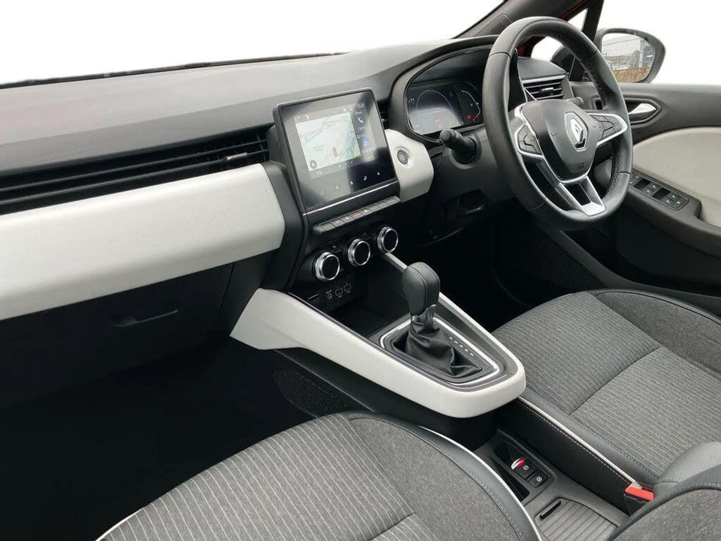 7" driver information display cluster,Apple car play/Android Auto,Cruise control + speed limiter,E-call,Easy link navigation with 7" touchscreen+4x20W amplifier+FM DAB double tuner, sound auditorium, 2xUSB/1xjack/bluetooth, smartphone integration plus,Eco mode driving function,Emergency call system,Front parking sensors,Gear change indicator,Lane departure warning system,Lane keep assist,Over speed prevention warning,Rear parking sensors,Rear view camera,Traffic sign recognition,Trip computer,Variable assistance electric PAS,Wireless phone charger,E-TECH battery,Auto dimming rear view mirror,Auto high beam assist,Auto light control and rain sensing wiper,Automatic headlights,Black wing mirrors,Body colour door handles,Body colour rear roof spoiler,Body coloured bumpers,Chrome front grille,Chrome insert on lower side doors with Clio embossing,Chrome side window surrounds,Drivers one touch window with anti-pinch feature,Electric front windows,Electric rear windows,Exterior rear hidden door handles,Extra tinted glass on rear windows + tailgate,Front and rear LED roof light x 2,Full LED front and rear headlamps integrating daytime running lights at the front and rear,Heated rear windscreen,LED front fog lights,LED reverse light,Manual folding wing mirror mechanism,Manually adjustable door mirrors,Rear fog lights,Rear side wing doors,Rear wiper,Shark fin antenna,Third brake light,Variable speed on front windscreen wipers,12V Accessory socket,3 rear height adjustable headrests,3 seat bench in 2nd row,3D Fabric velvet upholstery,6.2L front glovebox,60/40 split and fixed base rear seat bench,Air recirculation control,Auto climate control,Black headlining,Black hooks on boot floor x 4,Centre console with storage and armrest,Front cupholders,Front door storage bin,Grey dashboard and door panel,Height adjustable front headrests,Height/reach adjust steering wheel,Isofix system on outer rear seats,Luggage nets in boot,Matted grey interior roof lining and a pillar,Mechanical height adjustable front seats,Multi function steering wheel,Multisense including ambient lighting and selectable drive modes,Pollen filter,Single front passenger seat,Sun visor without light,Synthetic leather steering wheel,System for Restraint and Protection SRP-front seats,Vision grey interior detail includes light grey on doors, lower part of dash and gear stick,3 point seatbelts on all rear seats,ABS,AEBS - active emergency braking system,BAS (Brake Assist System),Curtain airbags,Distance warning alert,Driver and passenger front and side airbag deactivation,Driver/Front Passenger airbags,Electronic parking brake with auto hold,ESC - Electronic Stability Control + traction control,Front side airbags(head+thorax),Height adjustable driver's seatbelt,Seatbelt warning,Tyre pressure warning,Deadlocking system,Hands free key card with push button, start and stop function,Locking fuel filler cap,RAID (Renault Anti-Intruder Device) with automatic door locking,Rear side wing door and window child locking function (front driver door control panel),Remote central locking with thatcham approved immobiliser,Grey dashboard trim,Upper dashboard soft covered with positive thermoforming type 2,17" Viva stella diamond cut alloy with grey/black inserts,3D Fabric-Velvet - Black,Flame Red