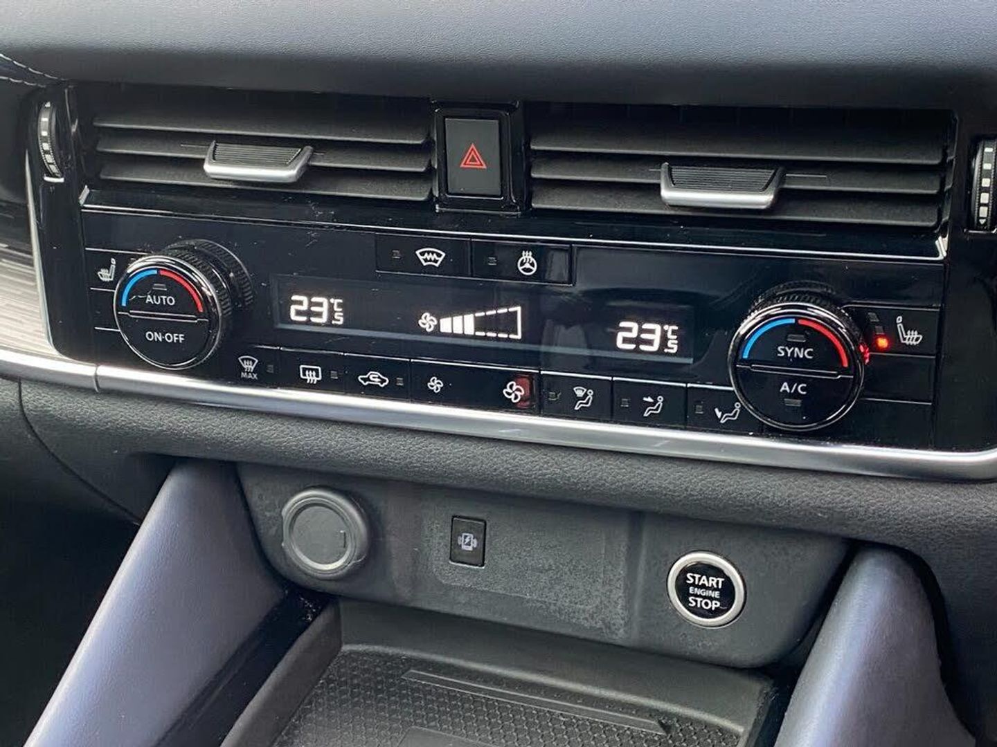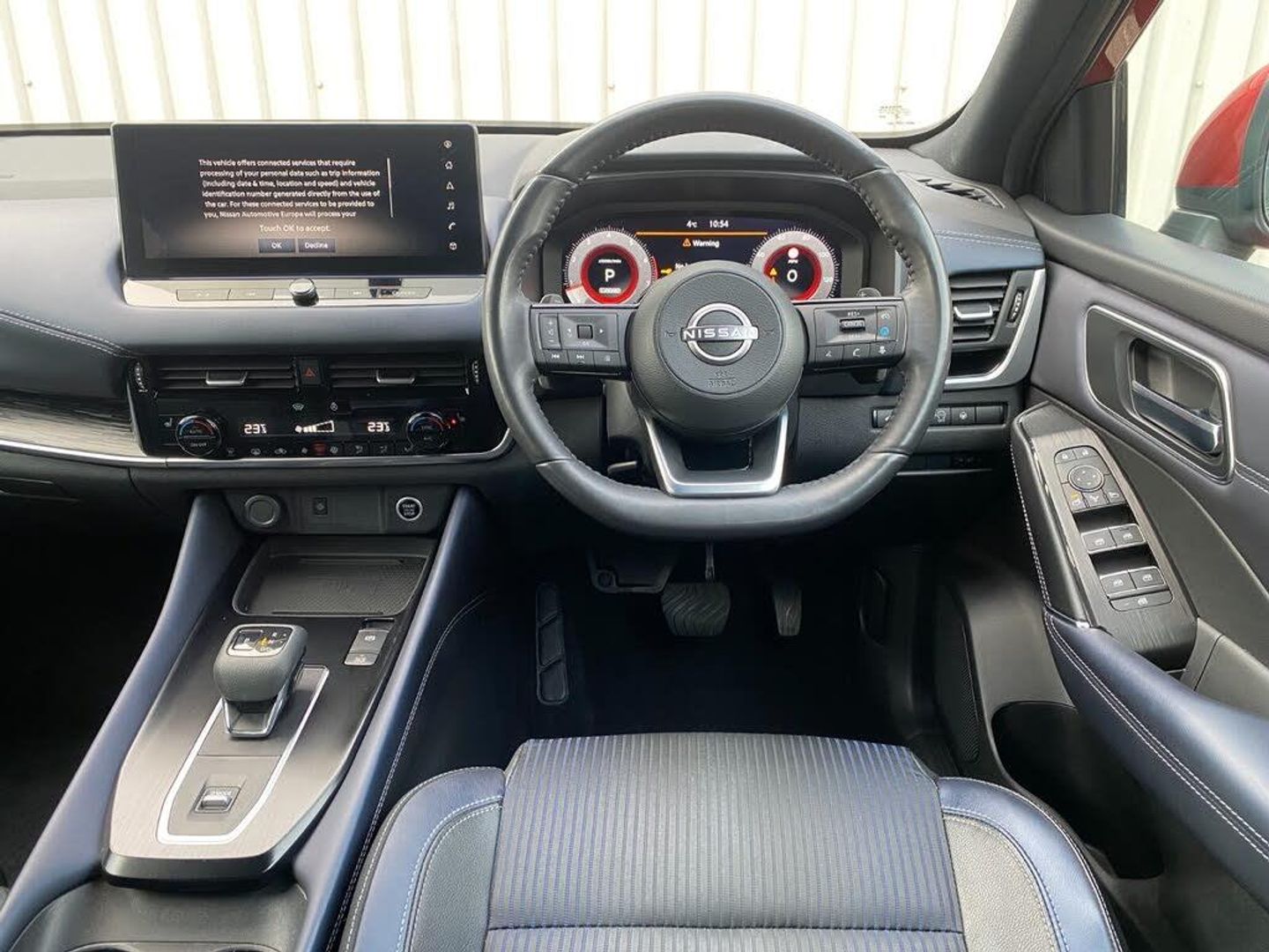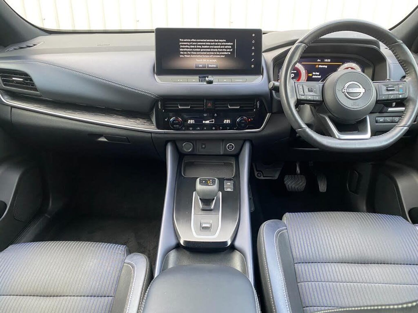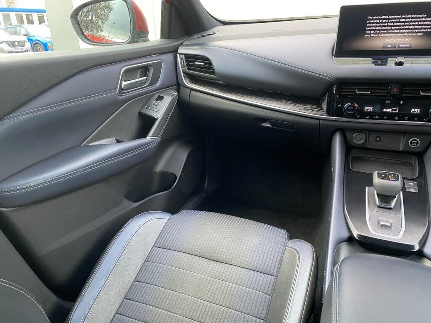 Advanced windscreen head up display, Android auto/Apple CarPlay (Wired), Blind spot warning, Drive modes (sport, normal, eco), Electric speed sensitive power steering, Emergency and breakdown call, Front and rear parking sensors, Full Digital 12.3" TFT Digital Combimeter, Google maps services - search, weather, 3D maps and Google street view, Hands free power tailgate, Idle stop/start system, Intelligent around view monitor, Intelligent Cruise control (ICC), Intelligent driver alert system, Intelligent forward collision warning, Intelligent lane intervention, Lane departure prevention, Lane departure warning system, Lane keep assist, Moving object detection, Nissan connect 12.3 inch touchscreen infotainment system, Nissan connect navigation, ProPilot, Push button starter, Rear cross traffic alert, Rear view camera, Remote control services - door locks, lights, horn and car locator, Telematics - notifications and connectivity services, TomTom live traffic services, Traffic jam pilot, Traffic sign recognition with legal speed adjustment, Trip computer, Virtual personal assistant and firmware over the air capability, Wireless apple carplay, Wireless charging pad, 6 speakers, AM/FM audio system with DAB, Bluetooth audio streaming, Front USB connections (Type-A and Type-C), Rear USB charging only ports (Type-A and Type-C), Auto dimming rear view mirror, Auto rear wiper when reversing, Automatic hazard signal with emergency stop signal, Body colour mirror caps, Body coloured door handles, Bodyside mouldings, Chrome side window finisher, Door handle with button, Electric auto folding door mirrors, Electrically adjustable and heated door mirrors with LED turn indicator, Follow me home headlights, Front and rear LED turning signals, Headlights auto levelling system, Intelligent auto headlights, LED daytime running lights, LED headlights with adaptive driving beam, LED rear lights, One touch front and rear electric windows with remote opening and closing, Partially body coloured bumpers, Privacy glass, Rear bumper with graphite insert, Rear reversing light (bulb lighting), Rear roof spoiler, Rear side wing doors, Rear styling plate, Shark fin antenna, Splash free rain sensing wipers, Super UV and infrared cut glass, Thermaclear heated windscreen, Three blink turn signal, 12v power socket in dashboard and luggage, 2x Rear coat hooks, 3 bench rear seats in 2nd row, 3 rear headrests, 4 folding assist grip, 6 Luggage hooks - 4 on floor, 2 on side, 60/40 split folding rear seat bench, Ambient lighting around centre console, Ambient lighting in front doors, Centre console storage tray, Chrome interior door handles, Cloth/syntech leather monoform upholstery, Dark black/blueish PVC wrapping, Dark headlining, Driver and front passenger sunvisors with illuminated vanity mirrors, Driver seat back pocket, Dual zone automatic climate control with pollen filter, Electrically adjustable driver seat, Electrically adjustable lumbar support for driver, Front and rear door storage, Front centre console and armrest, Front cupholders x 2, Front door with bottle holders, Glovebox with light, Hard trunk cover, Heated front seats, Heated steering wheel, Height adjustable driver's seat, Height adjustable front headrests, Height adjustable passenger seat, Leather steering wheel, Luggage board system, Luggage space lighting, Manual lumbar support on passenger seat, Manually adjustable passenger (slide recline + lifter), Multifunction steering wheel, Passenger seat back pocket, Rear armrest with 2 cupholders, Rear door bottle holders, Single front passenger seat, Soft PVC kneepad, Steering wheel gearshift paddles, Steering wheel switches, Tilt/telescopic adjustable steering wheel, Two rear isofix child seat anchorage points with top tether, Welcome light and doors with console tray ambient lighting, Glass roof pack with roof rails - Qashqai, 3x3 point rear seatbelt pretensioners + load limiters, ABS with EBD and brake assist, Active brake limited slip, Auto hold function, Child locks on rear doors, Curtain and front side, far side airbags, Driver and passenger airbags, Driver, passenger and 2nd row rear seat belt reminder, Electronic parking brake, Front seatbelt pretensioners + load limiters, Height adjustable front seatbelts, Hill start assist, Intelligent blind spot intervention, Intelligent front emergency braking with pedestrian, cyclist recognition and junction assist, Intelligent rear automatic braking, Tyre pressure monitoring system, Vehicle dynamic control, Capless fuel filler, Engine immobiliser, Intelligent Key, Remote central door locking with deadlocking, Thatcham Cat.1 alarm, Interior instrumental panel C finisher, 19" Alloy wheels, Tyre puncture repair kit