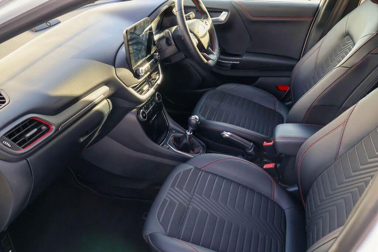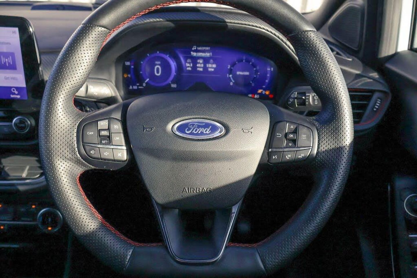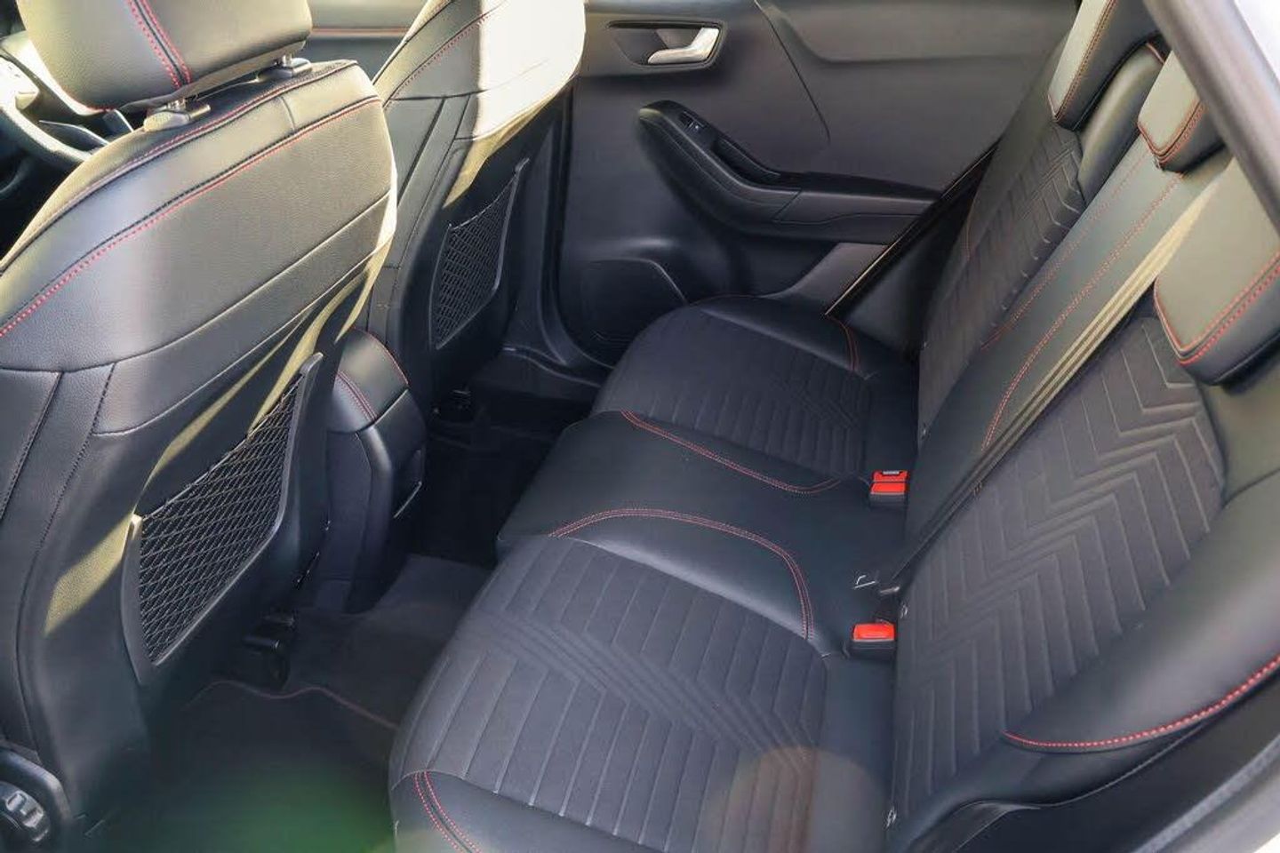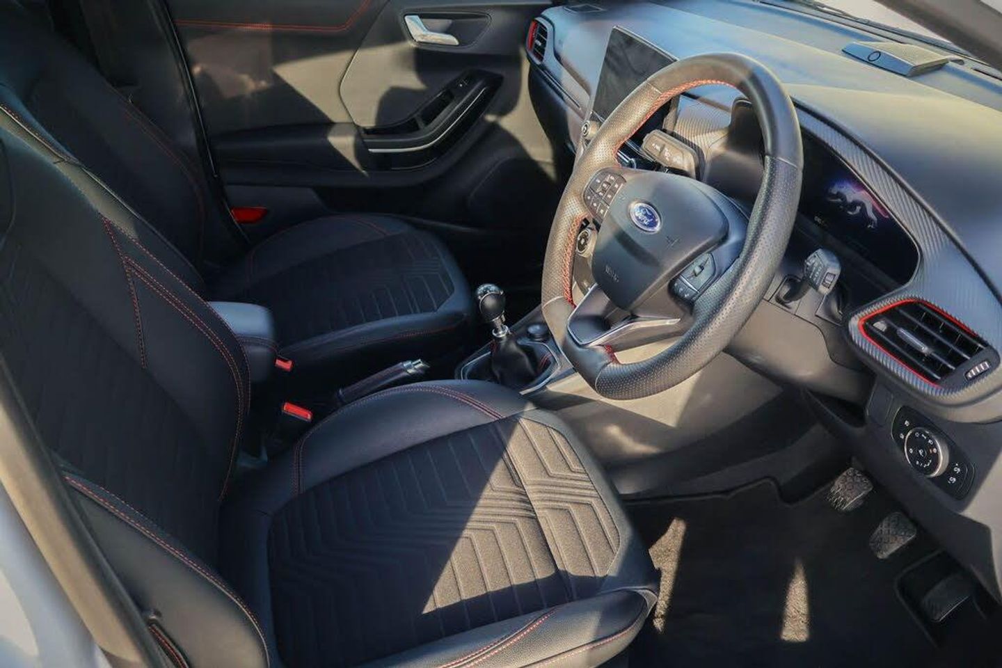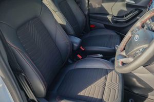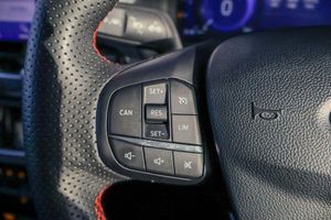 Driver impairment monitor, Emergency call service, Ford easy fuel, Full digital 12.3" instrument cluster, Lane keeping aid with lane departure warning, Power assist steering, Power start button, Rear parking sensor, Selectable drive modes(Normal, Eco, Sport, Slippery and Trail), Speed sign recognition, Automatic headlights with auto high beam, Automatic rain sensing wipers, Front fog lamps, LED daytime running lights, LED rear lamps, Power foldable heated door mirrors with puddle lamps, Privacy glass to side rear windows and tailgate glass, Quickclear heated windscreen, Rear side wing doors, Rear wiper, ST-Line body styling kit with unique grille, Third brake light, 3 seat bench in 2nd row, Centre console with armrest and stowage, Ford megabox extended bootspace, Front and rear head restraints, Front floor mats, Manual 4 way driver seat adjust with lumbar adjustment, Manual 4 way passenger seat with lumbar seat adjustment, Sensico partial premium upholstery, Single front passenger seat, ST-Line flat bottomed sensico leather steering wheel with leather handbrake and aluminium gear knob, Wireless charging pad with electronic air temperature control (EATC), Thatcham alarm, Partial Premium Sensico - Black with Red Stitching