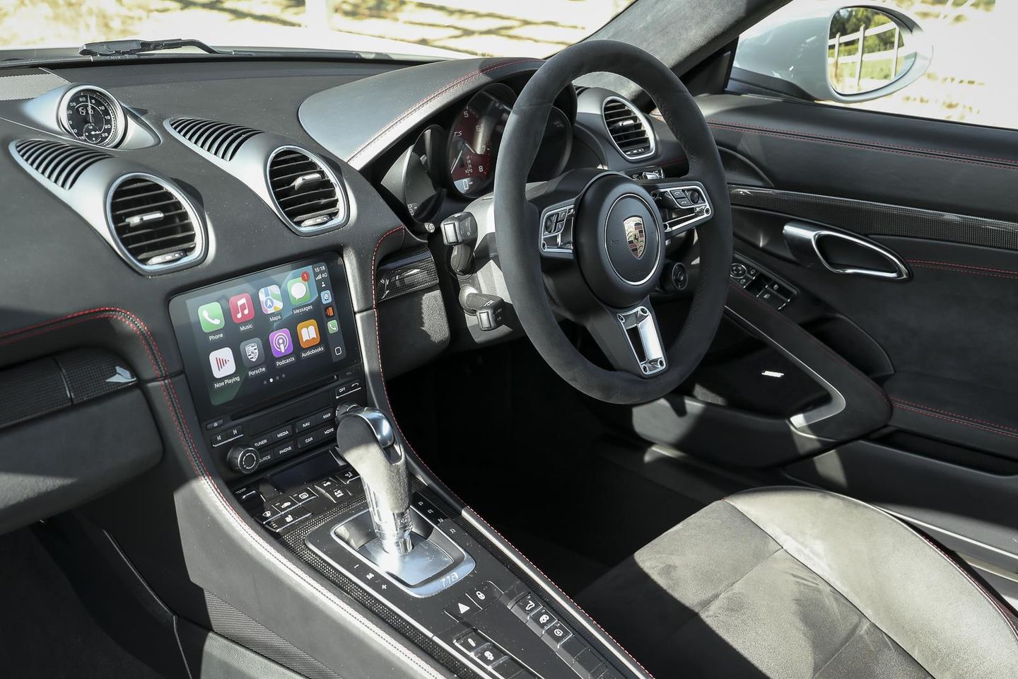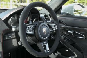 The Porsche is fitted with Sport Chrono Package Plus, which adds SPORT, SPORT PLUS, INDIVIDUAL, DYNAMIC RESPONSE and LAUNCH CONTROL modes that sharpen the throttle response, decreases shift speeds, hold gears for longer and blips the throttle on downshifts whilst also adding a dashboard mounted stopwatch to add to the sporting image of the 718 Cayman GTS. These modes are selected through the ‘Ferrari style’ manettino rotary dial located on the optional heated multifunction sports leather steering wheel.