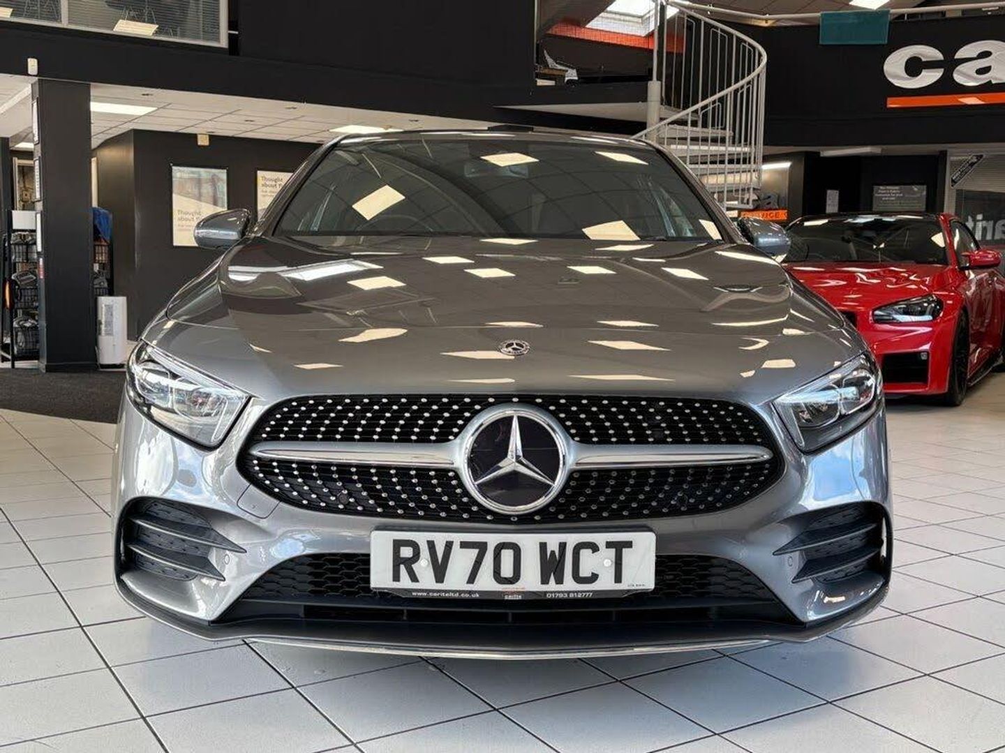 Artico Leather-Dinamica Microfibre - Black with Red Contrast Stitching, Mountain Grey, 18in Alloy Wheels - AMG 5-Twin-Spoke Design - Painted in Titanium Grey with a High Sheen Finish, ABS - Anti-Lock Braking System with BAS - Brake Assist, AMG Bodystyling - Front and Rear Apron, ATTENTION Assist, Active Bonnet - Pedestrian Safety Measure which Detects an Impact and Raises Bonnet by 65mm, Active Brake ASSIST, Active Lane Keeping Assist, Adaptive Brake Assist with Hold Function and Hill Start Assist, Adaptive Brake Lights, Air Conditioning - THERMOTRONIC Luxury Automatic Climate Control - Two-Zone with Display, Air Vents - Black with Silver Chrome Elements, Airbag - Kneebag for Driver, Airbags - Dual Stage - Driver and Front Passenger, Airbags - Windowbags for Driver and Front Passenger, Alarm System with Immobiliser and Interior Protection - Thatcham Category 1, Automatic Child Seat Recognition Sensor, Beltline Strips - Chrome, Bodystyling - Side Skirts - Body-Coloured, Brake Calipers - Mercedes-Benz Lettering on Front, Brake-Pad Wear Warning Indicator, Brushed Stainless Steel Sports Pedals with Rubber Studs, Bumpers - Body Coloured, Car Wash Mode, Centre Armrest - Front with Stowage, Childproof Locks - Manually Operated for Rear Doors and Electrically Operated for Rear Power Windows, Chrome Weather Strip, Crash-Responsive Emergency Lighting, Cruise Control with Limiter, DAB Digital Radio Tuner, Diamond Radiator Grille with Pins in Chrome - Silver-Painted Louvre and Insert in Chrome, Direct Steer Speed-Sensitive Power Steering, Door Handles - Body Coloured, Door Mirrors - Electrically Adjustable and Heated with Integrated LED Indicators, Dual Bluetooth Interfaces, Dynamic Select with a Choice of Driving Modes - ECO-Comfort-Sport and Individual, ESP - Electronic Stability Programme with ASR - Acceleration Skid Control, ESP Curve Dynamic Assist, Electric Parking Brake, Electric Windows - 4, Exhaust System - Twin Trapezoidal Tailpipes in Polished Stainless Steel, First Aid Kit and Warning Triangle, Floor Mats with Stitched Edging and AMG Lettering, Front Door Sills with Mercedes-Benz Lettering, Glass - Rear Windscreen - Heated with Timer Control, Hard-Disk Navigation, Headlamp Assist - Automatic Headlamp Activation, Heated Front Seats, Hey Mercedes - Voice Activation, High Level Third Brake Light - LED, ISOFIX and Top-Tether Child Seat Fixing Points in Rear - Two Outer Seats, Instrument Cluster - Fluid Level Warning Indicator for Fuel - Oil - Coolant and Washer Fluid, Instrument Cluster - Outside Temperature Display, Instrument Cluster - Service Indicator ASSYST, Instrument Cluster - Trip Computer in Multi-Function Display with Current Fuel Consumption Indicator, Instrument Display - 7in Display, Integrated Radio Aerial, Interior Mirror with Reading Lamps in Black and Frameless, KEYLESS-GO Starting Function, LED High Performance Headlamps with Integrated LED Daytime Running Lights, LED Tail Lights, Light Failure Indicator, Light and Sight Package, Live Traffic Information, Luggage Compartment Cover, Luggage Nets on Driver and Front Passengers Backrests, MBUX Multimedia System, Media Display - 10.25-inch with Touchscreen, Mercedes Me Connect - Standard Services, Mercedes-Benz Sound System - 100W, Mirror Package, Parking Package, Pre-Installation for Private Car Share, Privacy Glass, Rain-Sensing Windscreen Wipers with Two Sensitivity Settings, Rear Armrest with Two Cup Holders, Rear Axle - Torsion Beam, Rear Fog Light, Rear Windscreen Wiper, Remote Central Locking and Crash Sensor with Emergency Opening Function, Reversing Camera with Parking Guidelines - 180 Degree View, Roof Lining - Black, Seat Belts - Black, Seat Belts - Rear Three-Point - 3, Seat Belts Reminder - Front and Rear, Seat Comfort Package, Seat Occupancy Sensor - Front Passenger Seat, Seats - Rear Seat Backrests - Split Folding 40-20-40, Smartphone Integration, Speed Limit Assist, Sports Seats with Integrated Head Restraints, Steering Column - Manually Adjustable for Height and Reach, Steering Wheel - 3-Spoke Multi-Function - Trimmed in Leather with Flattened Bottom Section and Perforated Leather in Grip Area with Galvanised Shift Paddles, Summer Tyres, Sun Visors with Illuminated Vanity Mirrors, Suspension - Lowered Comfort Suspension, TIREFIT Tyre-Sealant Kit, Touchpad on Centre Console, Tyre Pressure Monitoring System, URBAN GUARD Vehicle Protection, USB - Type C - 2 Ports in Rear of Stowage Compartment and 1 in Front Centre Console, Window Line - Chrome, Wireless Charging