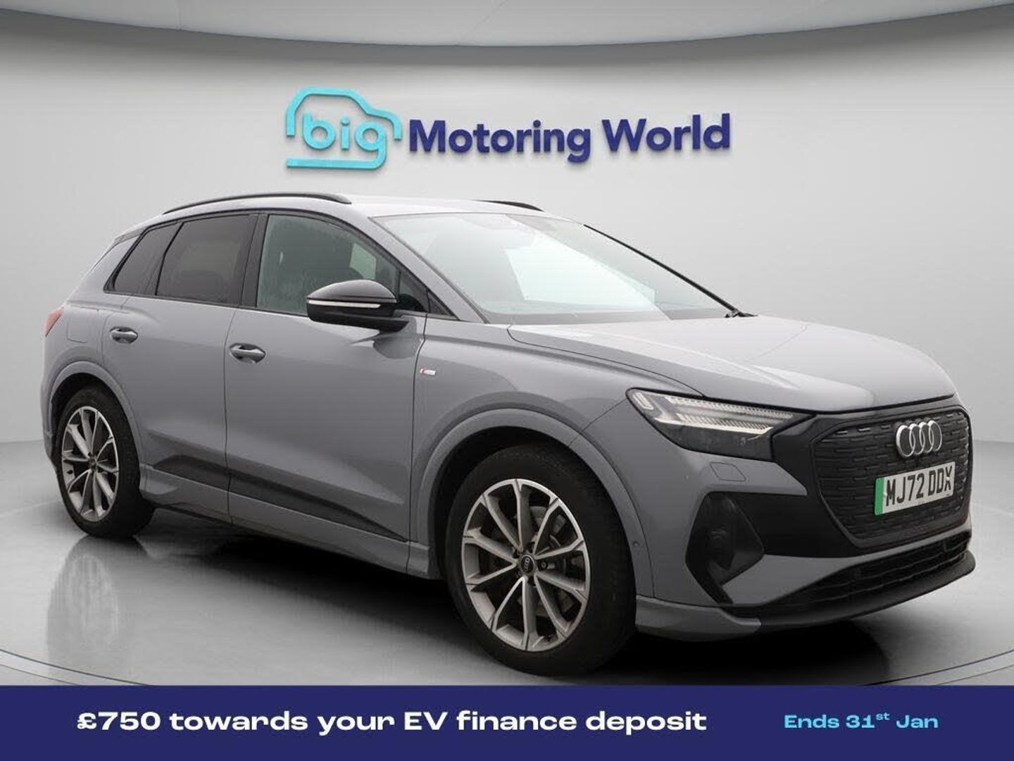 £750 towards your finance depo-Our Audi Q4 e-tron is finished in Grey. Specification includes a range of fantastic features including £750 towards your finance deposit, BMW Tech Pack, Leather Seats, Apple CarPlay, Electric Seats, Lane Assist, S Line Body Styling, Android Auto, Satellite Navigation, Privacy Glass Specification information is supplied by CAPHPI and may vary to the actual car. This data does not form any part of a buying contact. Please check specification prior to purchase in-store. The MOT is valid until October 2026, visit bigmotoringworld.co.uk for more photos, a 360 tour, service history and a free HPI report.Were BIG on peace of mind and this Grey Audi Q4 e-tron has completed our comprehensive 200 point inspection and passed all checks. Its ready for you to drive away with immediate collection in-store. We include a 90-day warranty as standard plus an option to extend for up to 3 years.Reserve this car exclusively for you, safely and securely at bigmotoringworld.co.uk, with a fully refundable £99 deposit. Test drive before you buy, with no commitment, no hassle and a completely haggle free experience. Still searching and want to see thousands more cars? We are BIG on choice with over 8000 cars to choose from.Visit our award winning web site bigmotoringworld.co.uk.Were Big Motoring World and were BIG on what matters to you.