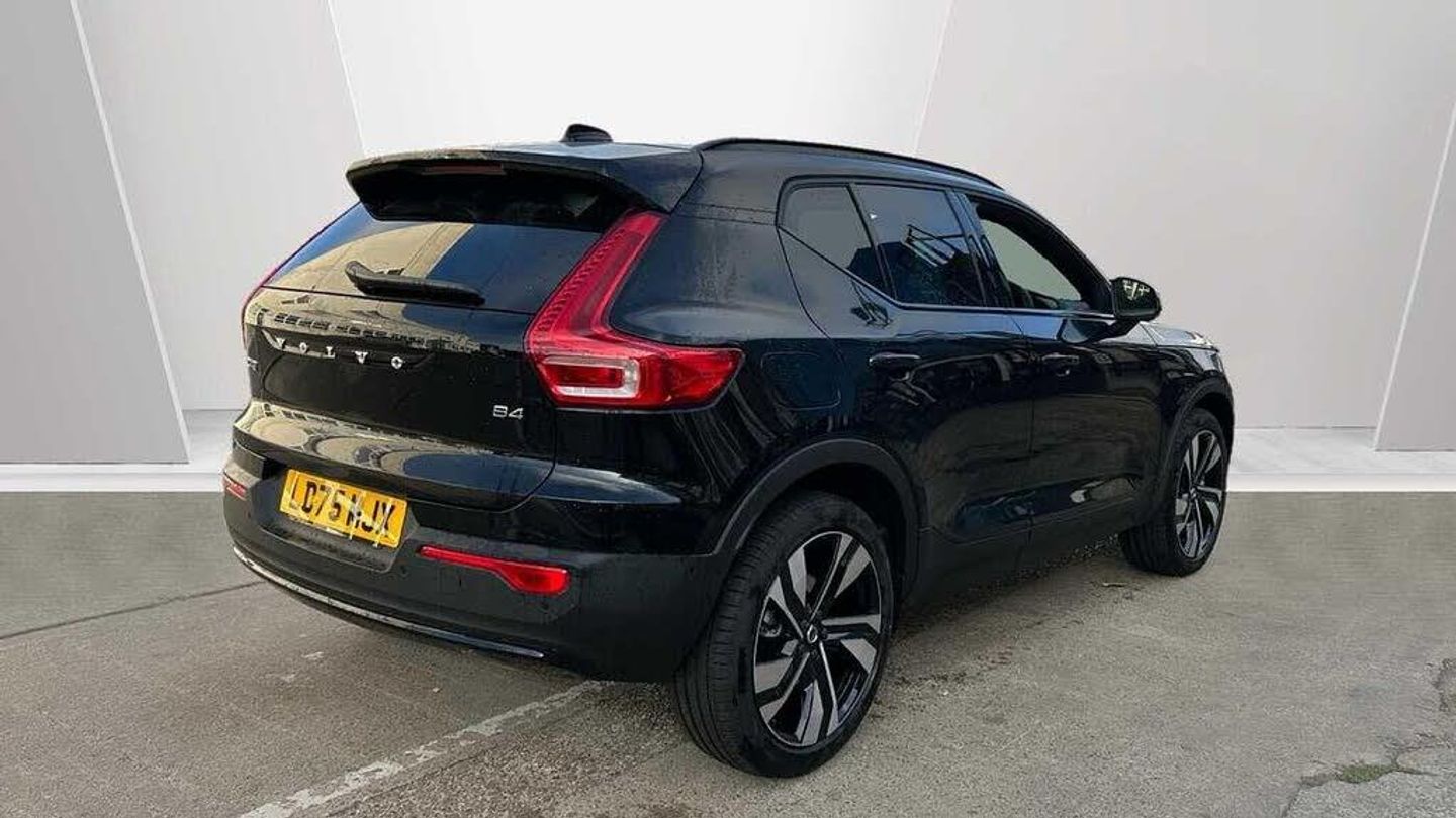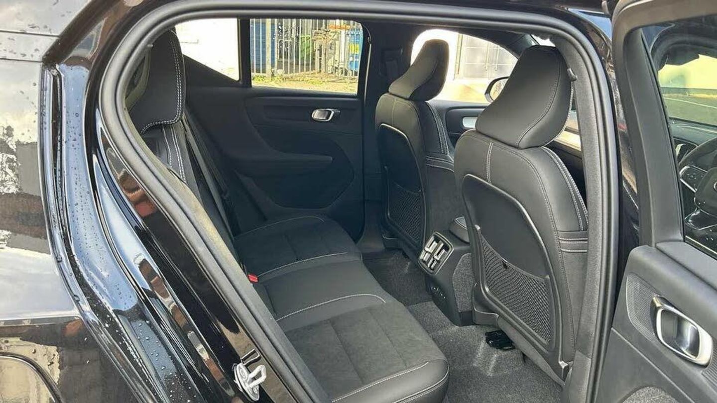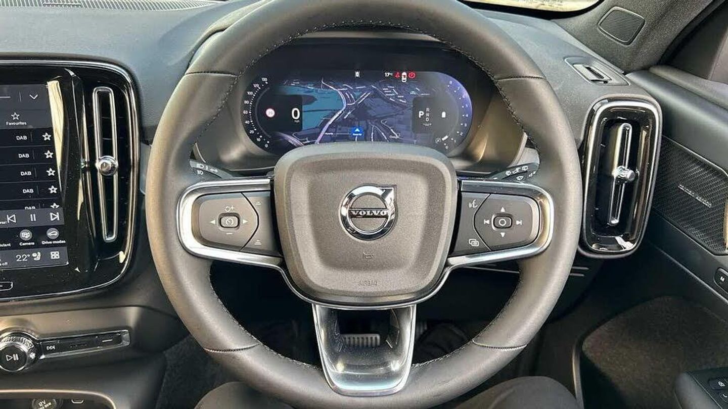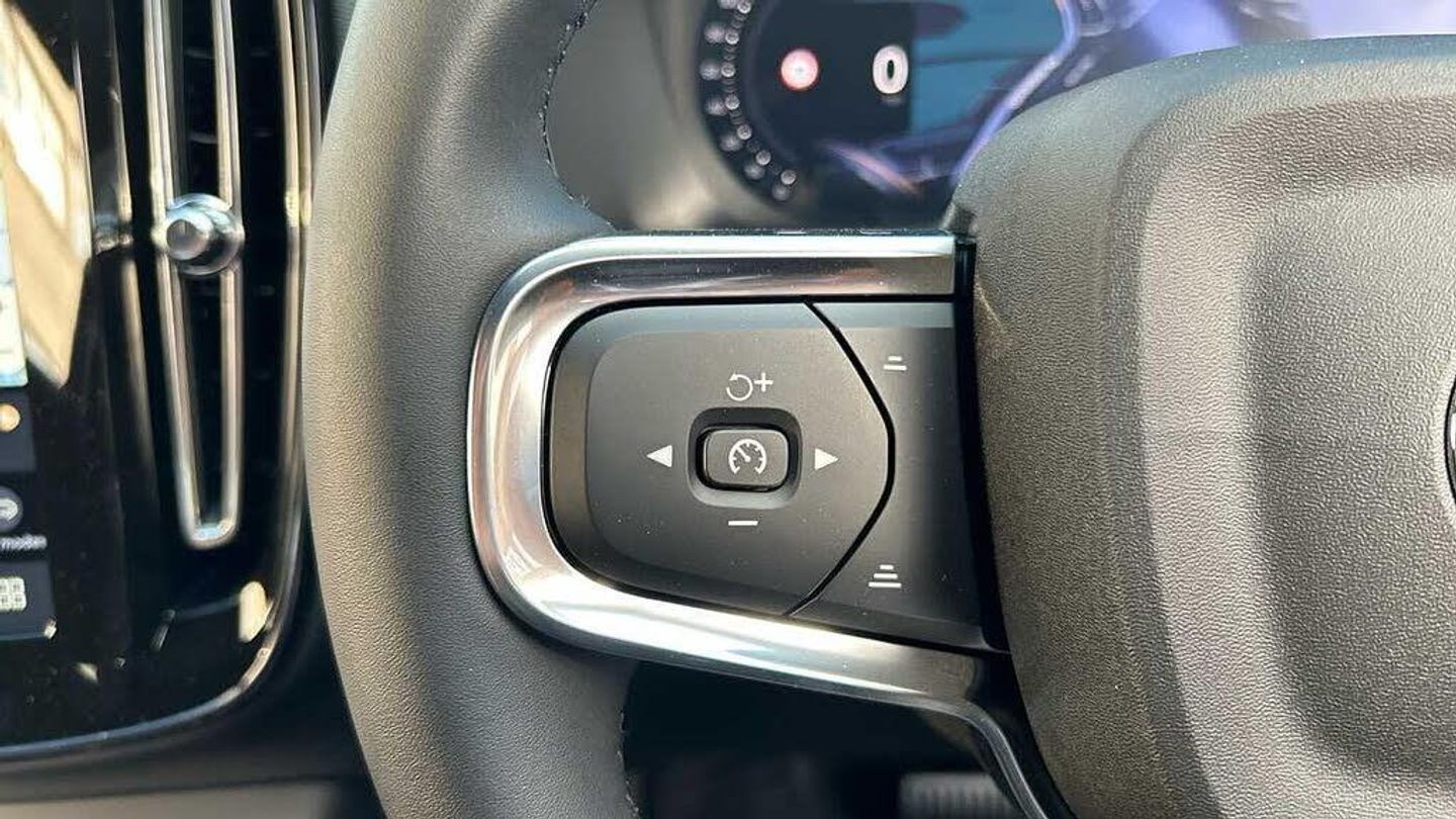 Sculpted gear shift, Charcoal headlining, Door mirror covers. colour coordinated, Urban Grid aluminium decor, Connect Suede textile/Microtech upholstery, Tailored sport steering wheel. Charcoal, 7-speed Dual Clutch automatic, Two-zone climate system, Afterrun parking climate, Passenger airbag cut-off switch, Dual-stage airbags, Knee airbag. driver side, Panoramic roof, Charcoal interior inserts, Roof top. colour coordinated, Road Sign Information, Lane Keeping Aid and Lane Departure Warning, Front grille with high-gloss black insert, Heated grill emblem, Pixel LED headlights, Headlight cleaning, Trailer lamp control, Fog lamps, 12.3-inch driver display, Google Assistant. Google Maps and Google Play Store, Adaptive cruise control, Pilot Assist, Intelligent Speed Assist (ISA), Volvo Cars App remote functions, Air-ventilated subwoofer, Digital Audio Broadcasting (DAB+), Harman Kardon Premium Sound, Power retractable door mirrors, Wireless phone charging, Automatic door locking, Remote key, Double locking, Tinted rear windows, BLIS? and Cross Traffic Alert, Alarm, Power child safety lock, Power tailgate, Keyless entry with hands-free power tailgate, Air purifier and remote cabin pre-cleaning, Folding bag hook, Digital owners manual, Power driver seat with memory, Power passenger seat, Heated front seats, Heated rear seats, Power folding rear head restraints, 5 seats, Mechanical release second seat row, Manual cushion extensions. driver and passenger, Power 4-way lumbar support, Textile interior cabin floor mats, Protection net, Foldable load floor with cargo divider and grocery bag, Rear centre armrest, Illuminated vanity mirrors, Interior illumination. high level, Power outlet. load compartment, First-aid kit, Auto-dimmed rear view mirrors, Front centre armrest, Glossy black tunnel console, Chassis, Hill Start Assist, Tyre pressure monitoring, Oncoming Lane Mitigation, Rear Collision Warning, Hill Descent Control, Slippery road alert, Emergency brake light, Heated steering wheel, Adaptive power steering, 20? 5-Double Spoke Black Diamond Cut, Temporary spare wheel, Lockable wheel bolts, Hidden tail pipes, Heated windscreen, Body-coloured door handles with ground lighting, High-gloss black side window trim, Roof rails. glossy black, Warning triangle, Volvo tread plates. aluminium, Tempered side and rear windows, Rain sensor, Park assist. front. rear and sides, Whiplash injury protection, Inflatable Curtain, Side impact protection, ISOFIX mounting points. rear seat, Steering wheel remote control, Humidity sensor, Bluetooth® connection, Safety belts, Android Auto, 360° camera, Alcohol lock software (not available in the UK), Protective cap kit. Matt Tech Grey, Apple CarPlay, Comfort front seats, 9-inch centre display