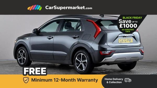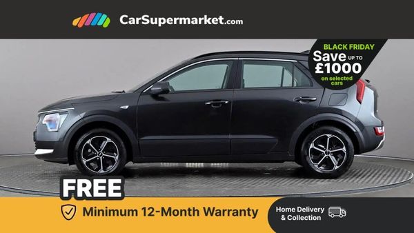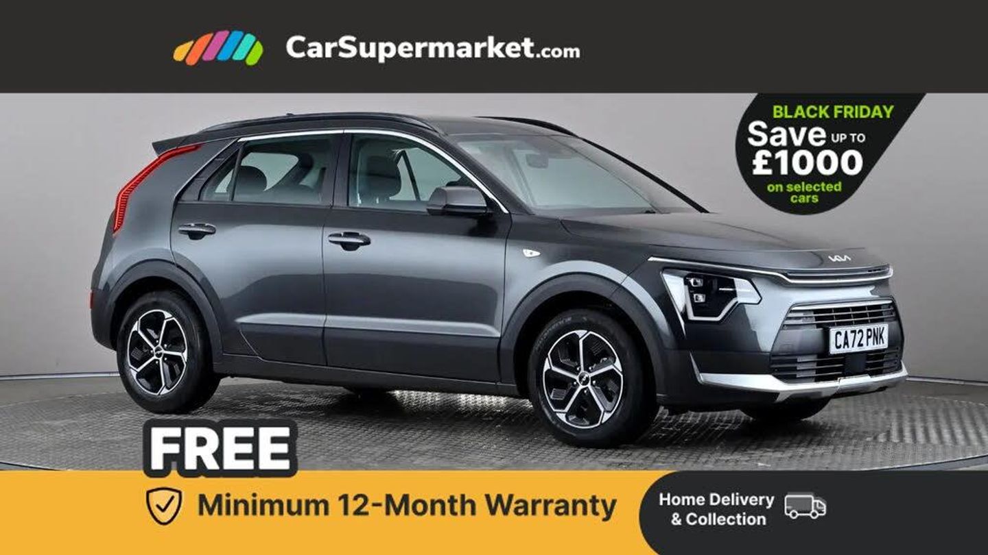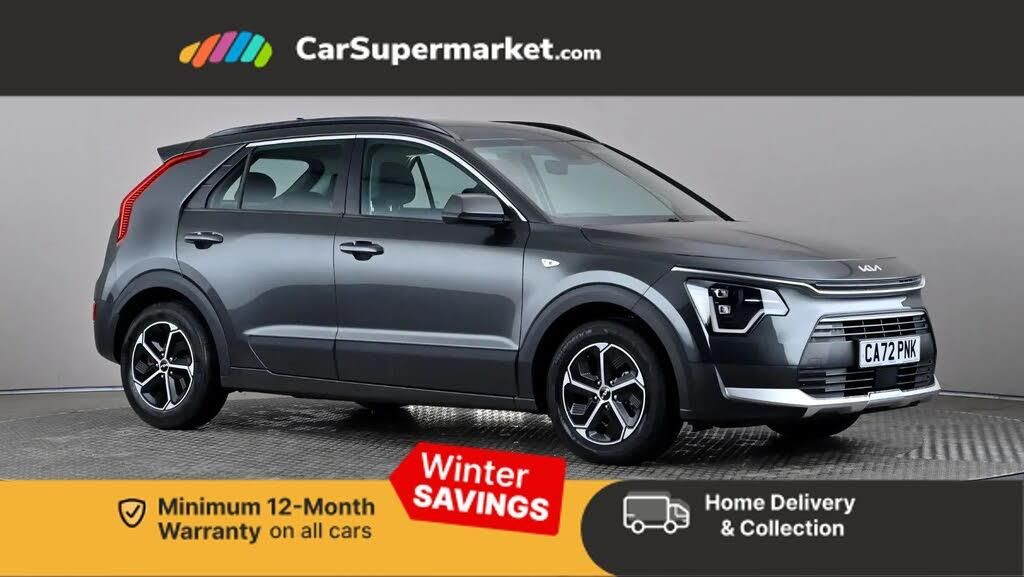 4.2" supervision colour cluster display,8" touch screen,Adaptive smart cruise control function (SCC) with stop and go,Apple car play/Android Auto with voice control,Drive mode select (Eco, sport),E-call,Emergency stop signalling system,Forward Collision-Avoidance Assist (FCA) 1.5 - City/Pedestrian/Cyclist/Junction turning,Lane Following Assist (LFA),Lane keep assist,Motor driven power steering,Rear parking sensors,Reversing camera with dynamic guide lines,Speed limit assist,Tailgate,Trip computer with distance/fuel consumption/average speed,Sports H-Matic Automatic,'Shark fin' mobile antenna,2 type C USB ports on front seats,2 USB ports in centre console including 1 type C,6 speakers,Bluetooth with music streaming,DAB Digital radio,Steering wheel mounted controls,Acoustic windshield,All round electric windows with drivers auto up/down function,Auto dimming rear view mirror,Automatic defog system,Automatic headlight control system,Black beltline mouldings,Black embossed cladding,Body colour bumpers,Body colour door mirrors,Body colour exterior door handles,Dual LED headlights (low and high projection),Electric heated door mirrors,Front and rear silver skid plates,Heated rear window with timer,LED daytime running lights,LED rear combination lights,LED third brake light,Manual folding door mirrors,Rain sensor,Rear fog lights,Rear side wing doors,Rear spoiler,Rear wiper,Roof rails,Solar glass rear windows and tailgate,Solar glass windscreen,Welcome and follow-me home light functionality,Windscreen Washer Level Warning,12V socket in front,12V socket in luggage compartment,3 seat bench in 2nd row,60/40 split/folding 2nd row of seats,All-round height adjustable headrests,Artificial leather centre console storage box,Artificial leather steering wheel,Bulb type overhead console lamp with sunglasses case,Centre console cupholder,Cloth upholstery,Driver seat manual adjustment,Driver/passenger sunvisors with illuminated vanity mirrors,Dual zone automatic air conditioning,Front and rear door storage,H-Matic gear selection,Illuminated glovebox,Interior door lock/unlock function,ISOFIX Child seat top tethers and anchor fixings,Luggage area lamp,Luggage area load cover,Luggage board,Metal paint interior door handles,Passenger seat height adjuster,Rear armrest,Seatback pocket - driver,Single front passenger seat,Tilt/telescopic adjustable steering wheel,Towing pack - Niro,3 point seatbelts on all seats,ABS,Automatic unlocking of doors in case of impact,Centre side front airbags,Curtain and side airbags,Drivers knee airbag,Dual shell horn,Electric parking brake with auto hold function,Electronic stability control,Front passenger airbag deactivation,Height adjustable front seatbelts,Hill start assist control (HAC),Manual rear child locks,Rear seat alert system,Traction control,Tyre pressure monitoring system,Alarm system and engine immobiliser,Deadlocks,Locking wheel nuts,Remote central door locking with fold away key,Visible vehicle identification number,Warranty - 7 Years/ 100,000 miles,Graphite paint centre fascia,16" alloy wheels,Tyre mobility kit