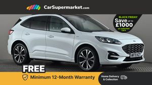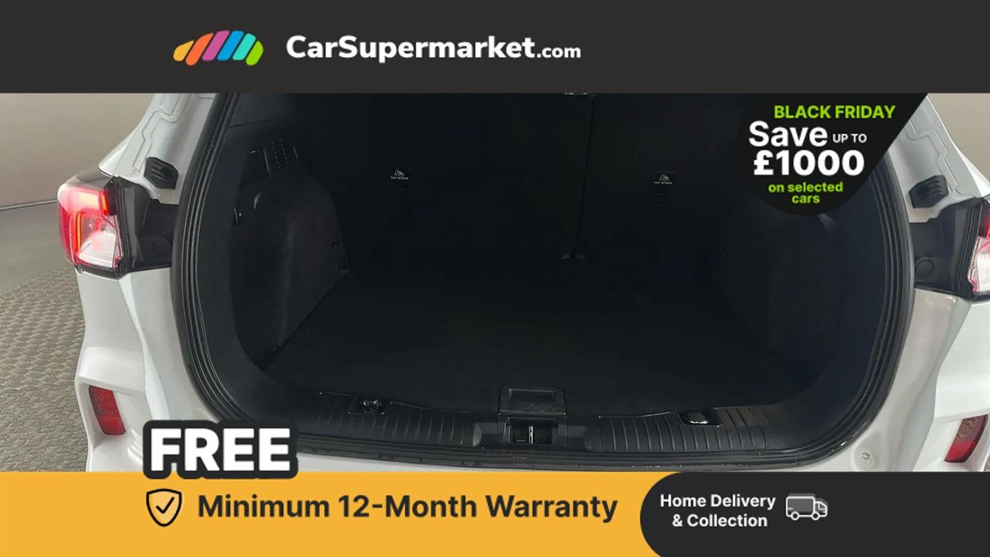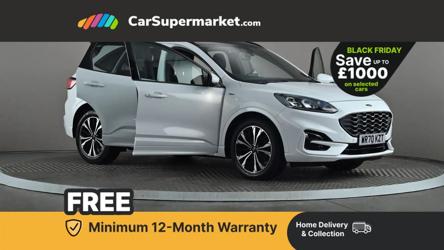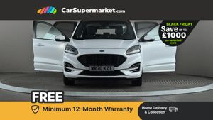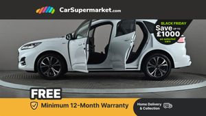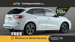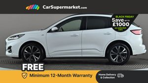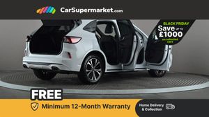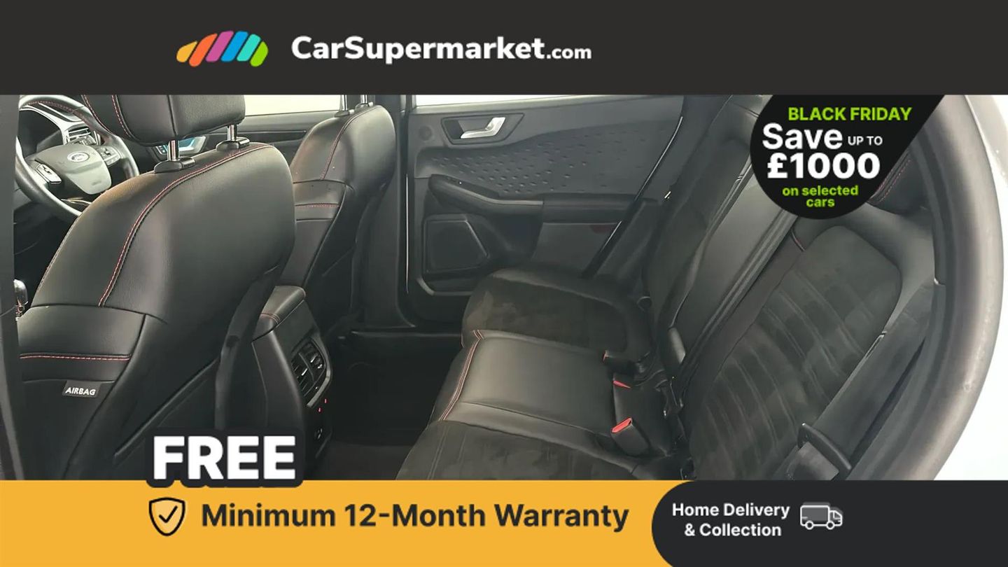 Ford easy fuel,Front and rear parking sensors,Hands free power tailgate,Lane keeping aid with lane departure warning,Mobile phone wireless charging pad,Power assist steering,Selectable drive modes,Auto headlamps with high and low beam,Day/night rear view mirror,Front LED fog lamps,Halogen Projector Headlamps,Large rear spoiler,LED daytime running lights,LED rear lights,Power front/rear windows with global close,Power opening panoramic roof,Privacy glass,Quickclear heated windscreen,ST Line body styling kit with unique front and rear fascia and bumper, rear painted diffuser, front painted skid plates, dark mesh upper grille,ST Line front scuff plates,Twin exhausts,10 way power adjustable drivers seat,2nd row sliding seats with 60:40 split,Alloy pedals,Centre console with electronic parking brake,Dark headlining and pillars,Dual electronic automatic temperature control,Flat bottomed leather steering wheel in sensico with red stitching,Front and rear head restraints,Heated passenger and driver seats,Heated rear seats,Rear charging point,Sensico partial premium leather upholstery,Sports seats,ST Line gear knob,B&O with large instrument cluster pack - Kuga,3x3 point rear seatbelts,Airbags - front driver/passenger, front and rear curtain,Drivers knee airbag,Electronic stability control (ESC) and ABS,Ford MyKey Gen 2 safety system,Manual child proof rear door locks,Post collision braking,Pre collision assist with autonomous emergency braking,Red brake calipers,Tyre pressure monitoring system,Engine immobiliser,Keyless start with 'Ford Power' starter button,Locking wheel nuts,Remote powered central double locking doors,Thatcham category 1 alarm,Tyre inflation kit,Frozen White,Partial Sensico - Rapton Cloth - Ebony with Red Stitching