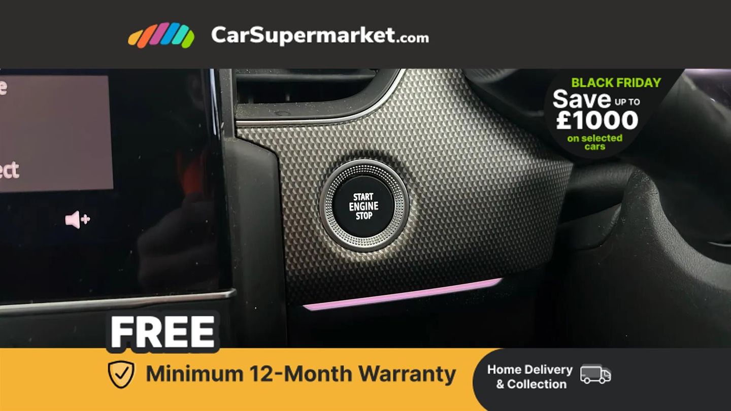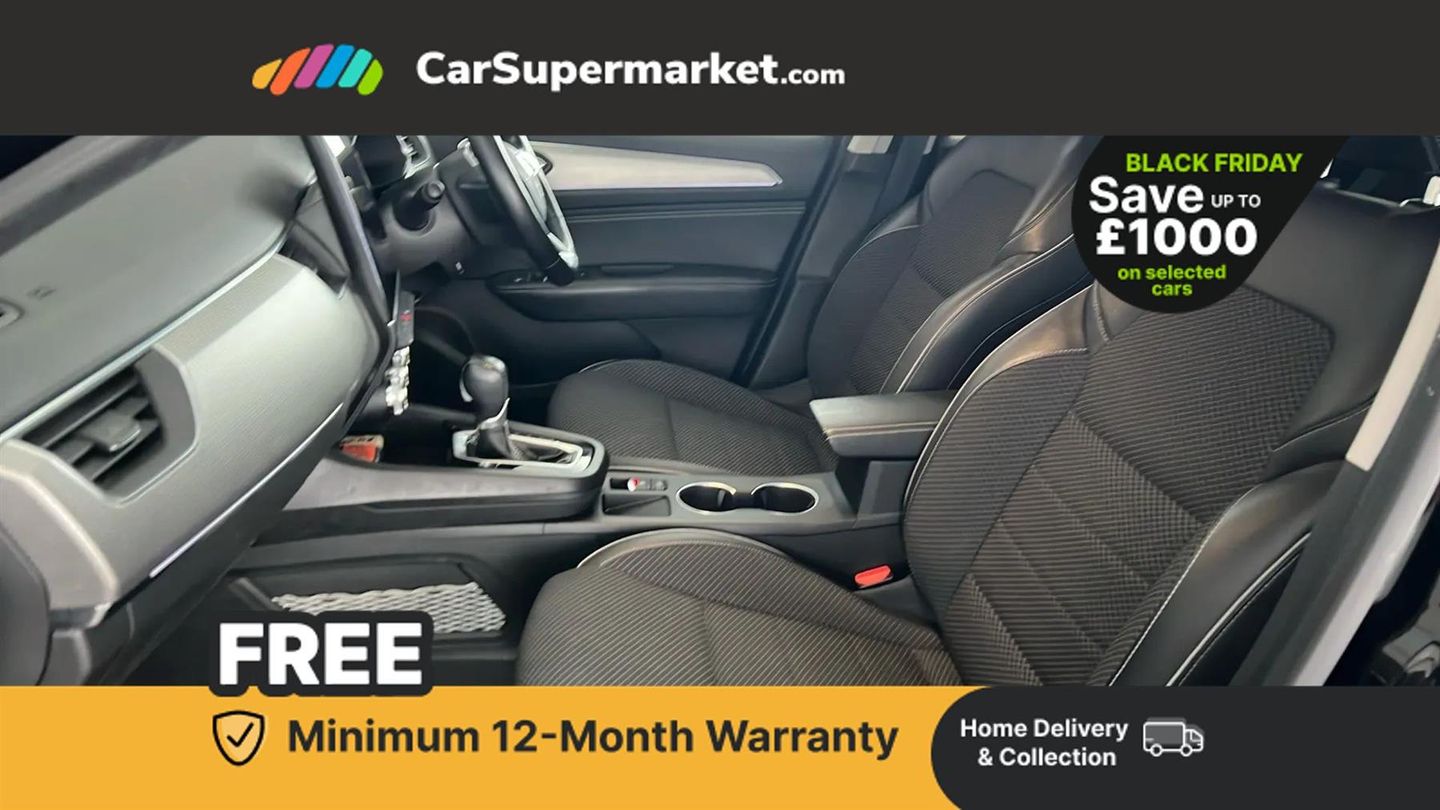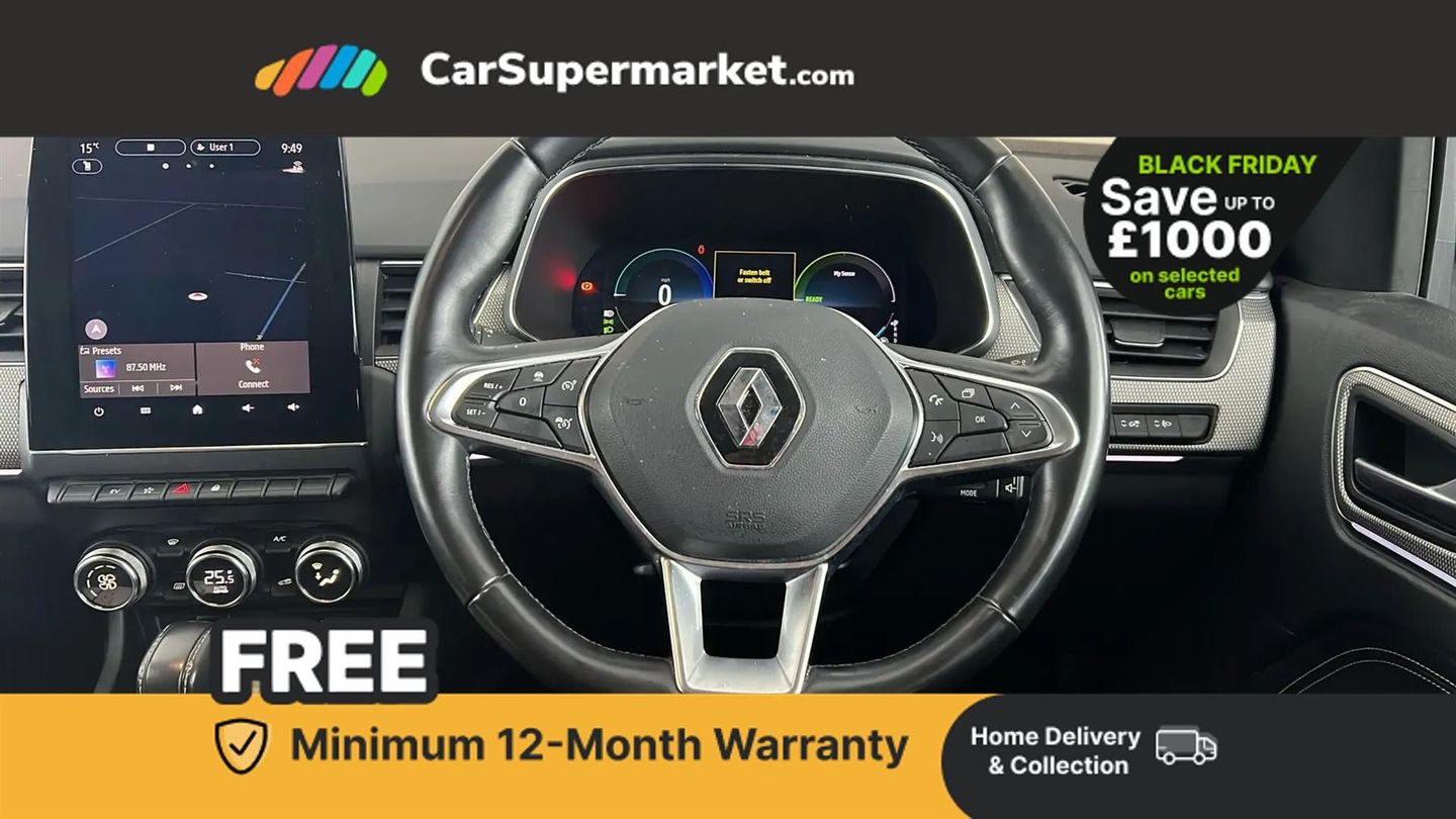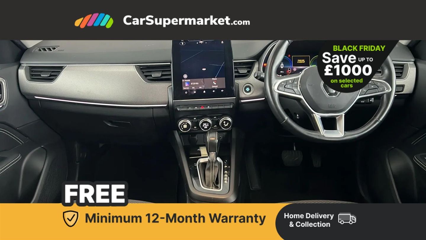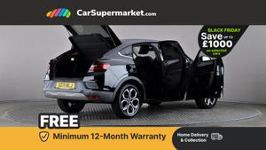 7" TFT Driver information display,Blind spot warning,Bluetooth system,EASY LINK 9.3" portrait touchscreen with navigation, Google search and traffic information,eCall emergency call system,Eco mode,EV button to activate pure mode,Front and rear parking sensors,Gear change indicator,Lane departure warning,Lane keep assist,Multi-sense - 3 driving modes and 8 ambient lighting,Rear cross traffic alert,Rear view camera,Renault automatic emergency assist,Smartphone integration compatible with Apple CarPlay and Android Auto,Traffic sign recognition with over speed prevention,Trip computer,Variable assistance electric power steering,Arkamys classic sound system with 6 speakers,DAB radio,USB port,3rd brake light,Auto dimming rear view mirror,Automatic headlights,Automatic high / low beam,Automatic windscreen wipers with rain sensor,Black side door protection with chrome insert,Body coloured bumpers,C-shaped LED front signature lighting,Chrome decopart on wing (fender molding),Chrome window lower lining,Extra tinted rear windows and tailgate,Front and rear electric windows,Front driver window with one touch facility and anti-pinch function,Front grille with chrome on upper part,Full LED headlights,Grey front and rear skid plates,Heated rear window,Rain sensor,Rear windscreen wiper,Shiny black shark fin antenna,Side mirrors adjustable electrically, electrically foldable, with defrosting and temperature sensor, automatically foldable at vehicle closure,3 seat bench in 2nd row,60:40 split and fixed base rear seats,Automatic climate control with combined filter, humidity sensor and AQS,Central console with storage,Front and rear head restraints,Height and reach adjustable steering wheel,ISOFIX child seat fixing points on rear outermost seats,Leather steering wheel,LED front and rear roof lights,Rear air vents,Single front passenger seat,3x3 point rear seat belts,ABS+EBA,Active emergency braking system,B Brake Mode - One pedal driving with increased regenerative braking,Distance warning alert,Driver airbag,Driver and passenger front and side airbag deactivation,Driver and passenger side airbags,Driver height adjustable seat belt,Electronic parking brake with auto hold,ESC (Electronic Stability Control),Front and rear no seatbelt warning sound,Front curtain airbags,Front head airbags,Hill start assist,Passenger airbag,Tyre pressure warning light,Anti drill door locks and locking fuel cap,Central door locking,Deadlocking system,Hands free keycard with Keyless access and start,RAID (Renault Anti-Intruder Device) automatic door locking,Rear side wing door and window child locking function (front driver door control panel),Superlocking,Thatcham alarm,18" Pasadena diamond cut alloy wheels with grey inserts,Black,Cloth and Synthetic Leather - Black