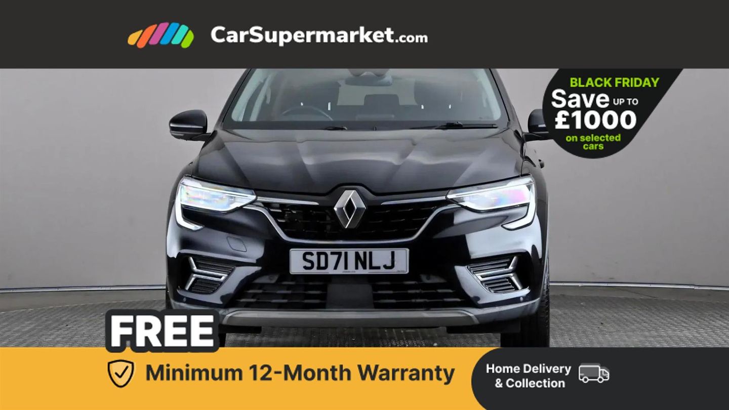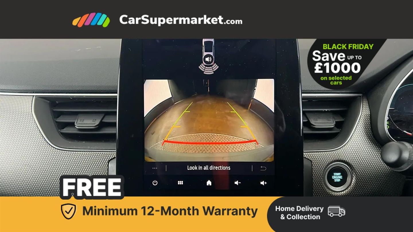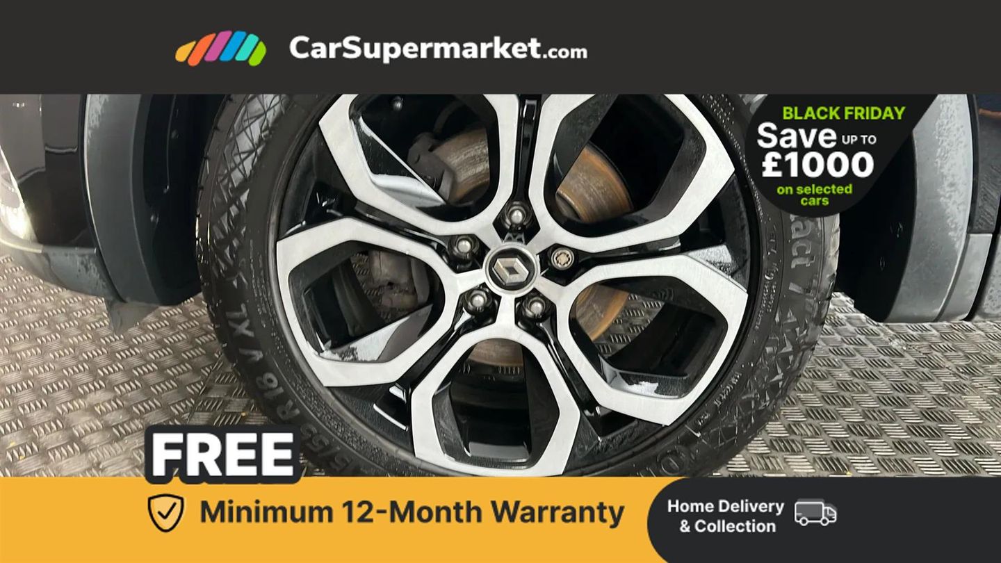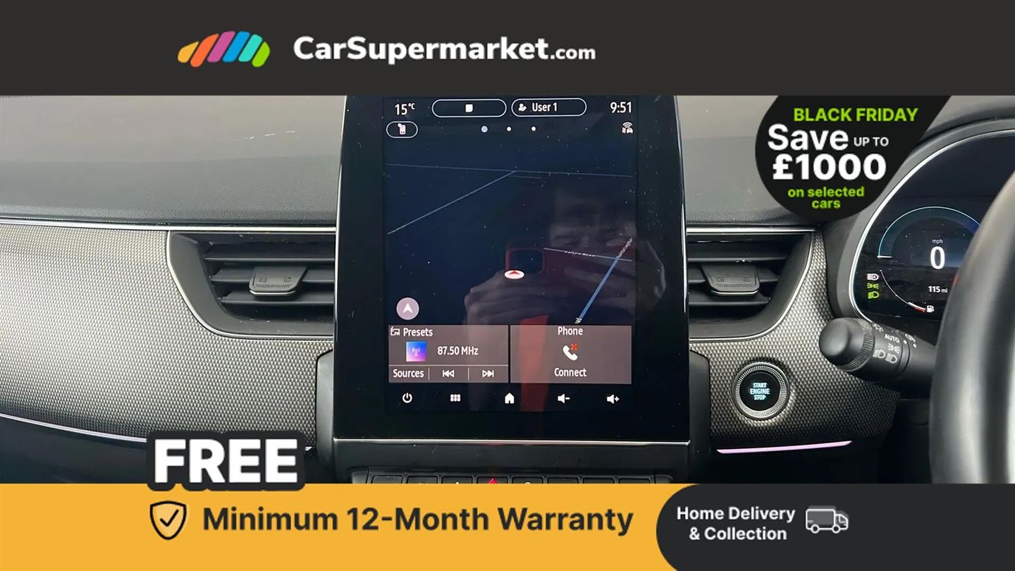 7" TFT Driver information display,Blind spot warning,Bluetooth system,EASY LINK 9.3" portrait touchscreen with navigation, Google search and traffic information,eCall emergency call system,Eco mode,EV button to activate pure mode,Front and rear parking sensors,Gear change indicator,Lane departure warning,Lane keep assist,Multi-sense - 3 driving modes and 8 ambient lighting,Rear cross traffic alert,Rear view camera,Renault automatic emergency assist,Smartphone integration compatible with Apple CarPlay and Android Auto,Traffic sign recognition with over speed prevention,Trip computer,Variable assistance electric power steering,Arkamys classic sound system with 6 speakers,DAB radio,USB port,3rd brake light,Auto dimming rear view mirror,Automatic headlights,Automatic high / low beam,Automatic windscreen wipers with rain sensor,Black side door protection with chrome insert,Body coloured bumpers,C-shaped LED front signature lighting,Chrome decopart on wing (fender molding),Chrome window lower lining,Extra tinted rear windows and tailgate,Front and rear electric windows,Front driver window with one touch facility and anti-pinch function,Front grille with chrome on upper part,Full LED headlights,Grey front and rear skid plates,Heated rear window,Rain sensor,Rear windscreen wiper,Shiny black shark fin antenna,Side mirrors adjustable electrically, electrically foldable, with defrosting and temperature sensor, automatically foldable at vehicle closure,3 seat bench in 2nd row,60:40 split and fixed base rear seats,Automatic climate control with combined filter, humidity sensor and AQS,Central console with storage,Front and rear head restraints,Height and reach adjustable steering wheel,ISOFIX child seat fixing points on rear outermost seats,Leather steering wheel,LED front and rear roof lights,Rear air vents,Single front passenger seat,3x3 point rear seat belts,ABS+EBA,Active emergency braking system,B Brake Mode - One pedal driving with increased regenerative braking,Distance warning alert,Driver airbag,Driver and passenger front and side airbag deactivation,Driver and passenger side airbags,Driver height adjustable seat belt,Electronic parking brake with auto hold,ESC (Electronic Stability Control),Front and rear no seatbelt warning sound,Front curtain airbags,Front head airbags,Hill start assist,Passenger airbag,Tyre pressure warning light,Anti drill door locks and locking fuel cap,Central door locking,Deadlocking system,Hands free keycard with Keyless access and start,RAID (Renault Anti-Intruder Device) automatic door locking,Rear side wing door and window child locking function (front driver door control panel),Superlocking,Thatcham alarm,18" Pasadena diamond cut alloy wheels with grey inserts,Black,Cloth and Synthetic Leather - Black