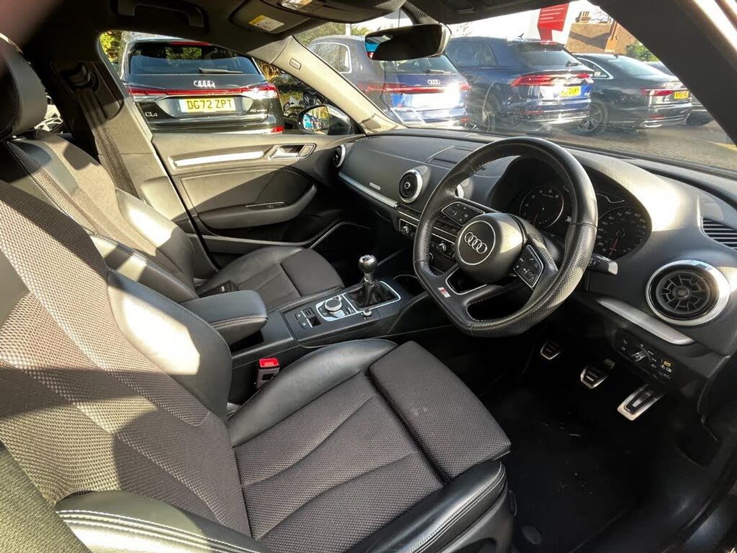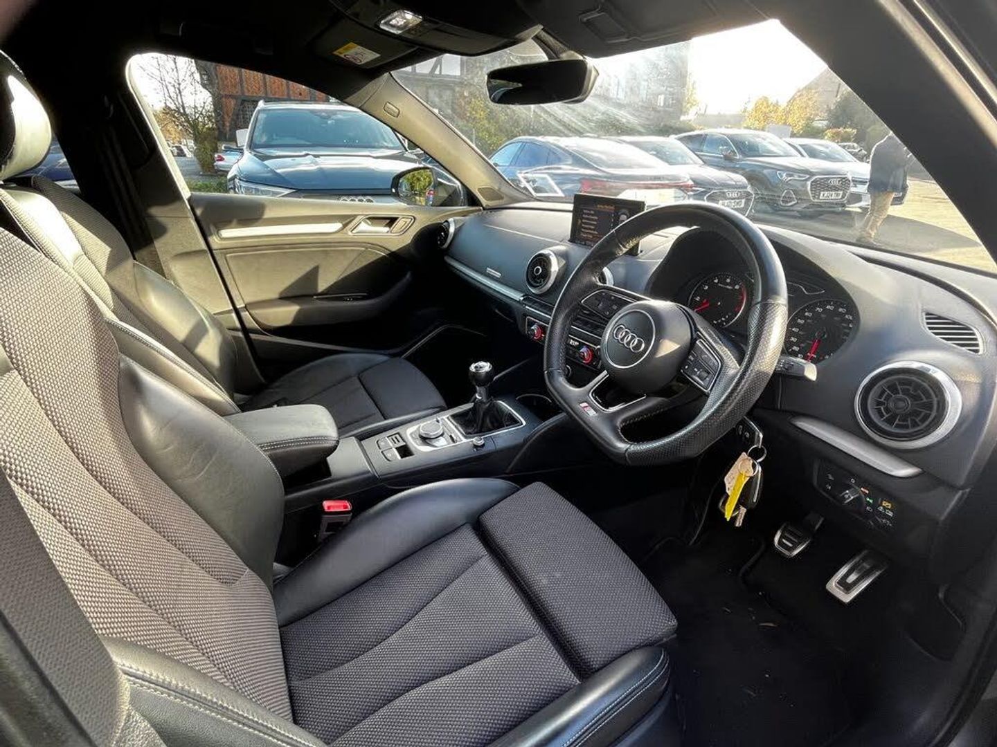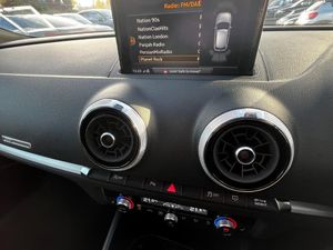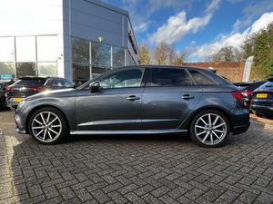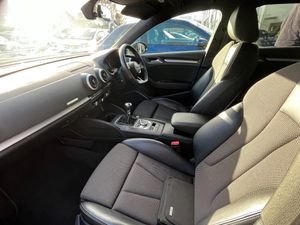 Audi connect, Audi drive select, Audi smartphone interface, Colour driver's information system display, Electro-mechanical PAS, HDD satellite navigation system radio single CD/DVD player MMI control system, Mobile telephone preparation - bluetooth interface, Service interval indicator, Speed limit display, Voice control system, 2 USB ports, Audi music interface, Audi sound system with 10 loudspeakers, Auxiliary input socket, CD player, DAB Digital radio, MMI radio plus with 7" colour MMI screen and MMI controller, Auto dimming rear view mirror with light and rain sensors, Black door mirrors, Black window surrounds, Body colour bumpers with black insert, Body colour roof spoiler, Chrome exhaust tailpipes, Electric front windows, Electric operated/heated door mirrors, Electric rear windows, Heated windscreen washer jets, LED daytime running lights, Matt black radiator grille, Privacy glass, Rear wiper, S Line body styling, Sport specific side air inlet grille and diffuser insert, 3 adjustable rear headrests, 3 spoke flat bottomed multi-function leather steering wheel, 4 lashing points to secure luggage, Adjustable front armrest, Black cloth headlining, Dual zone electronic climate control, Front and rear interior lights with delay, Front passenger seat isofix location point, Front sports seats, Front/rear floor mats, Height/depth adjustable steering column, Illuminated glovebox, ISOFIX child seat preparation+airbag deactivation, Jack and tool kit, Stainless steel pedals, Storage compartment in centre console, Storage compartment under front seats, Storage compartments in doors, Black styling pack - A3/S3, LED interior light pack - A3/RS3, Non smoking pack - A3, Storage and luggage pack - A3/RS3, 3 point seatbelts on all seats, ABS/EBD, Active bonnet, Active front headrests, ASR, Curtain airbags, Driver and passenger side airbags, Driver/Front Passenger airbags, Drivers knee airbag, EDL, Electromechanical parking brake, ESC - Electronic Stability Control + traction control, Front passenger airbag deactivation, Manual rear child locks, Multi-Collision braking, Seatbelt warning, Tyre pressure warning, Warning triangle and first aid kit, Anti theft alarm, Anti-theft wheel bolts, Remote control central locking, Thatcham category 1 alarm + immobiliser, Aluminium air vent surrounds, Aluminium trim elements, Matt brushed aluminium inlays, 18" 10 spoke design alloy wheels in matt titanium look with diamond cut finish, Space saver spare wheel